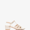 Off-white faux leather T-bar sandals with with block heel. Slingback design with three matching braided straps accoross the instep. Buckled strap closure around the ankle. Round and open toe box. The matching heel is 1,97`` for small sizes from 32 to 35 EU. The matching heel is 2,16`` for small sizes from 42 to 45 EU.
