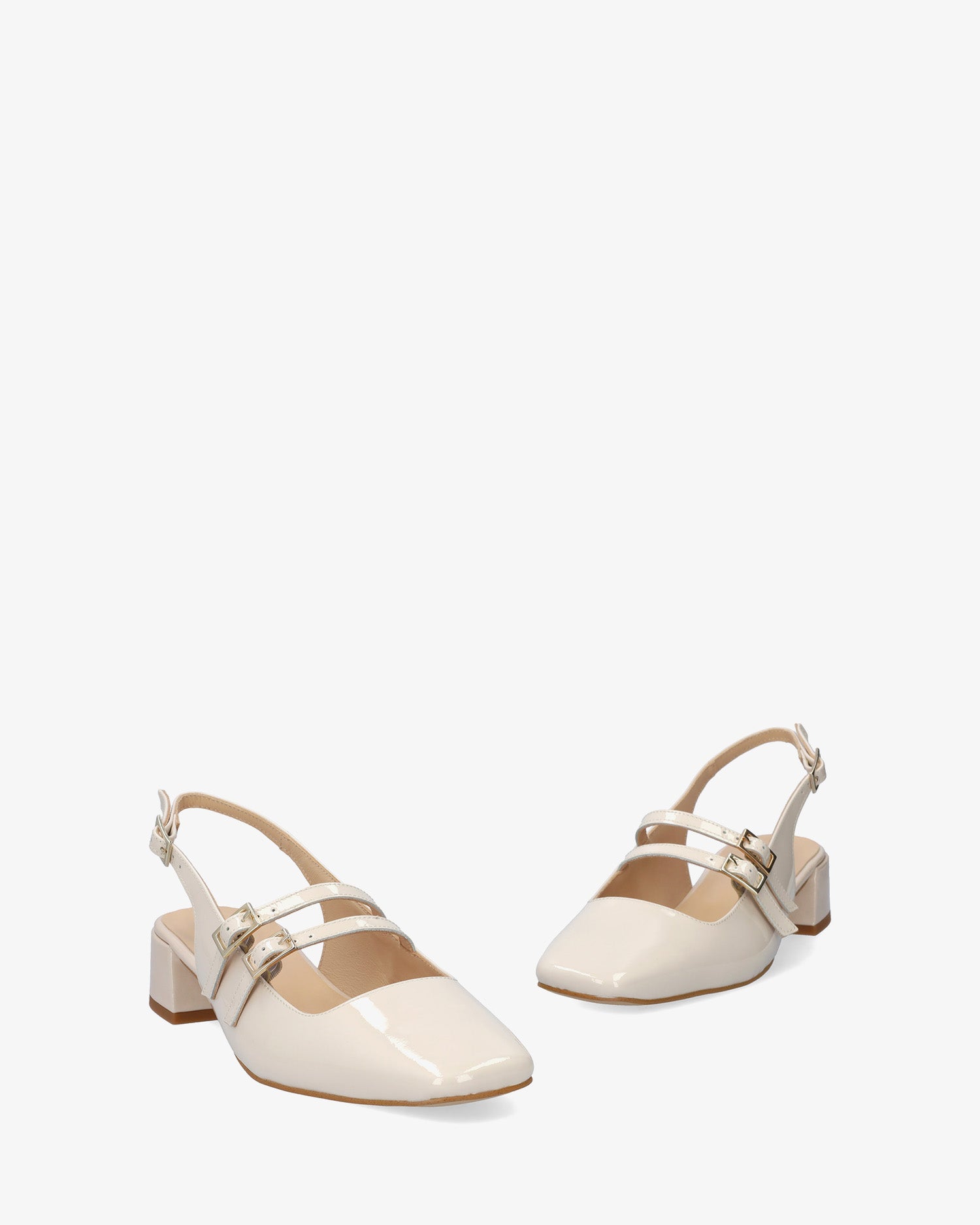 Slingback ballerina in Off-white patent leather. Features a design with thin straps and a metal buckle fastening on the instep. Closed square-toe finish. Secured with a buckle at the side of the ankle. Beige leather lining.The lined heel measures 1,377 inch for small sizes from 32 to 35 and 1,574 inch for large sizes from 42 to 45. Made in Spain.