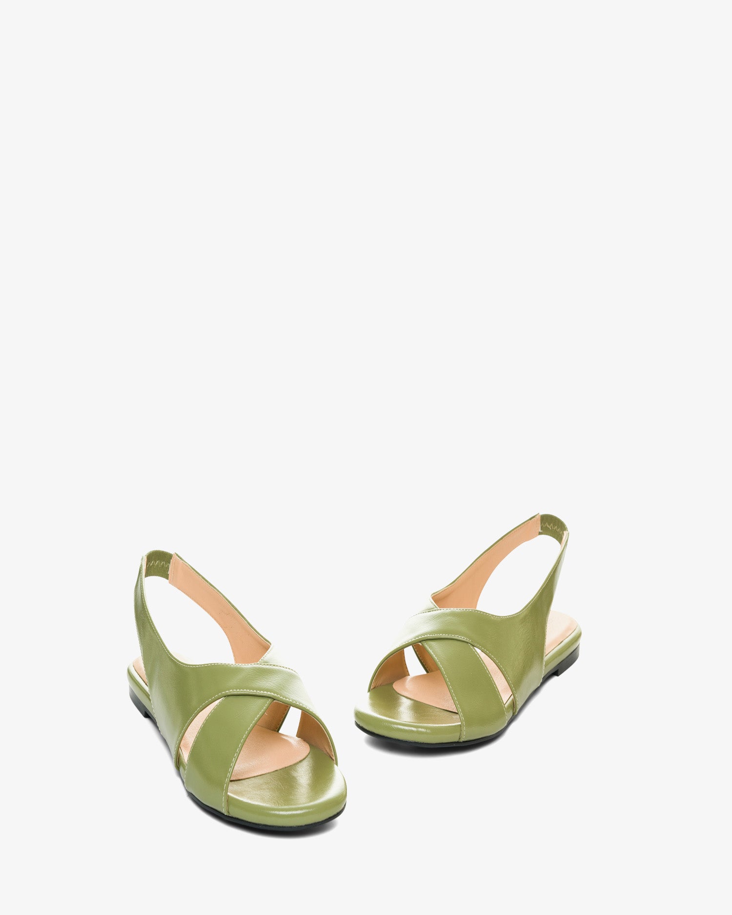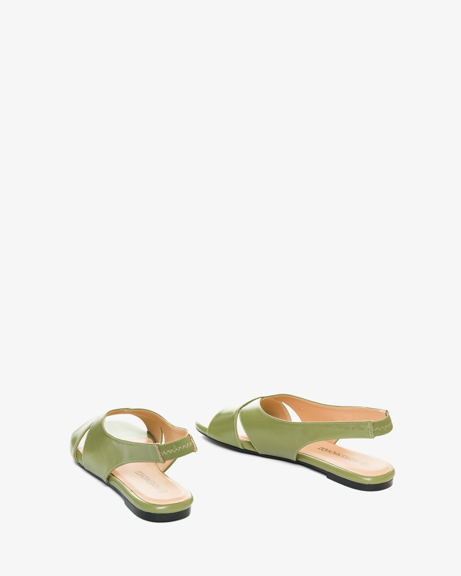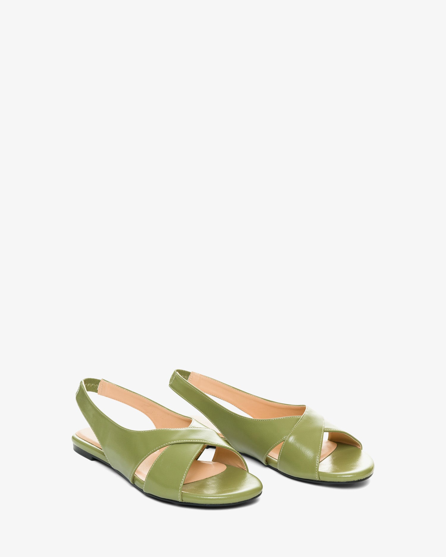 Olive faux leather flat sandals. Slingback design featuring crossed straps over the vamp and matching elastic closure on the ankle. Cushioned insole. Round and open toe box. Available for large sizes from 42 to 45 EU.