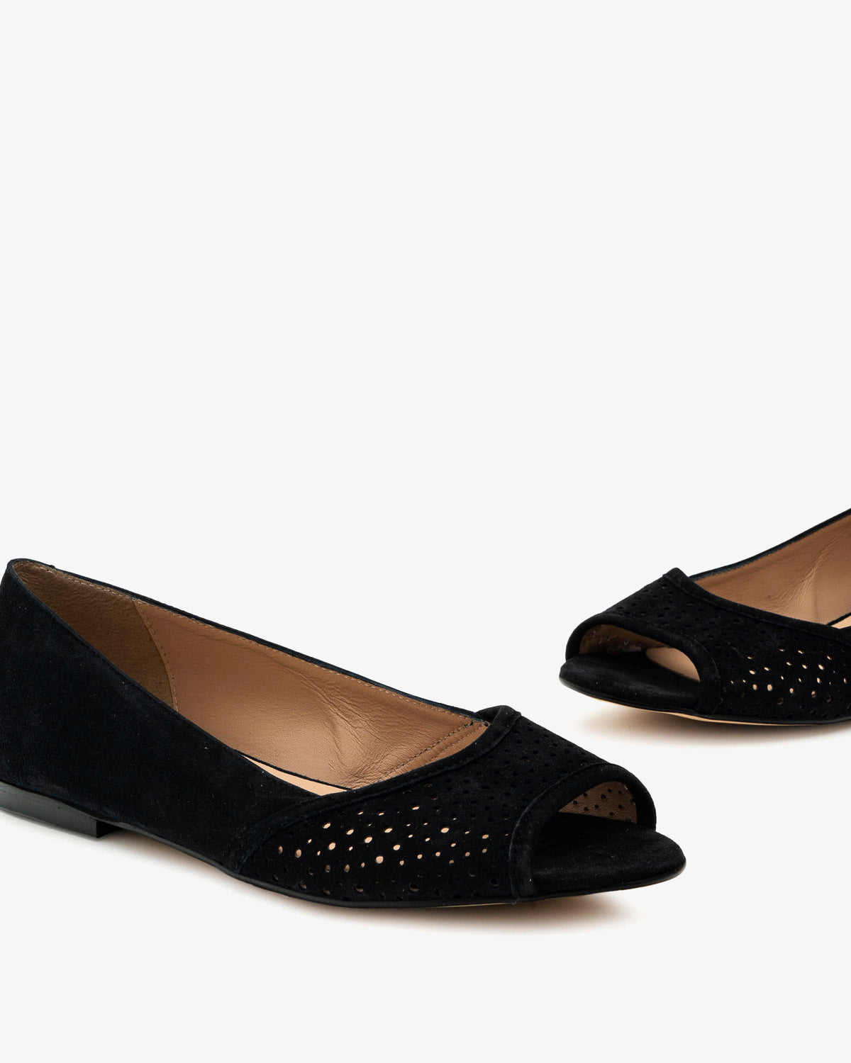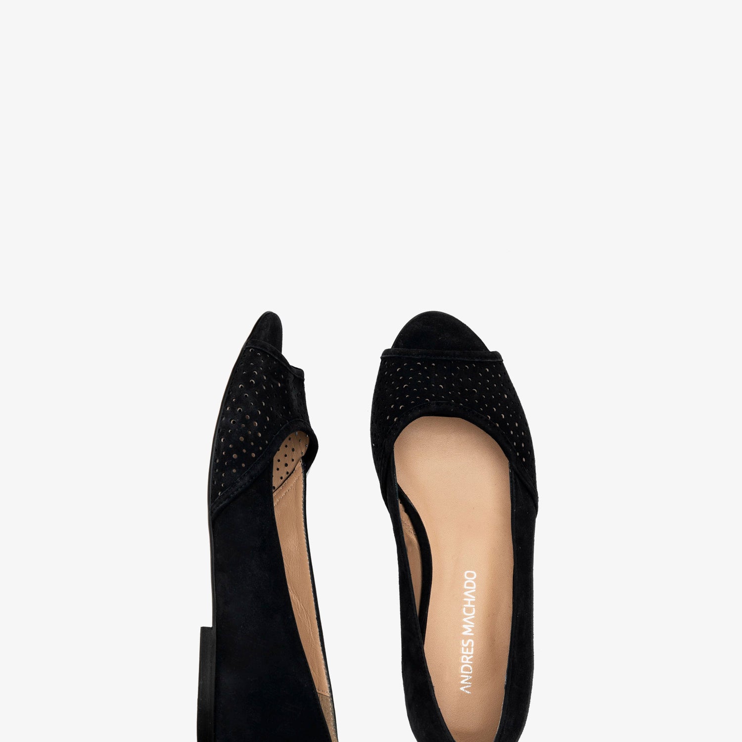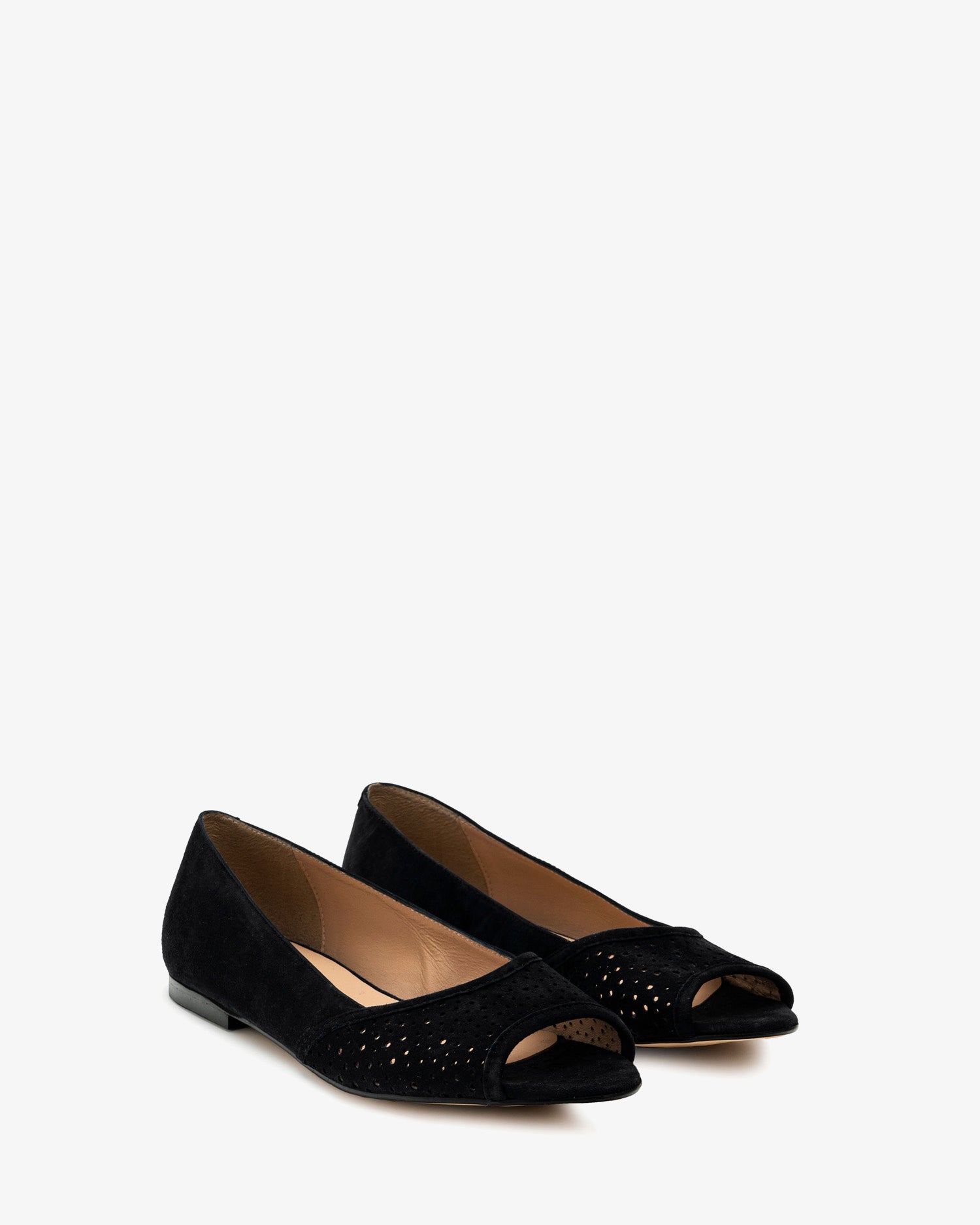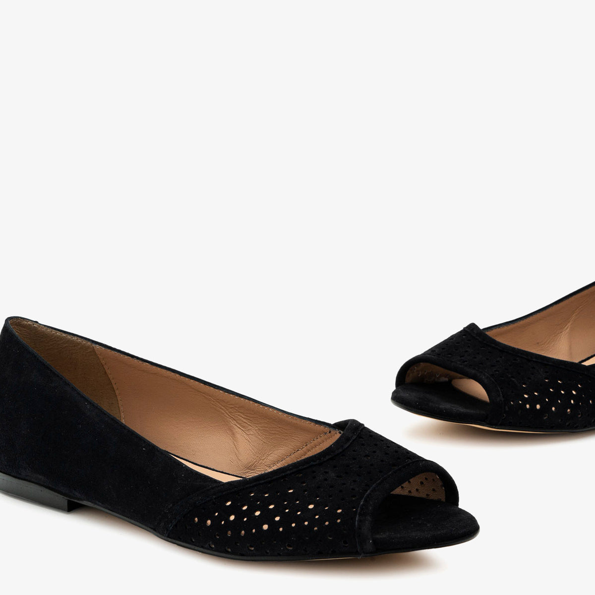 Peep toe ballet flats made of suede leather in black colour. The upper band is die-cut. Insole in leather. Small sizes UK 0.5 to 2.5 / EU 32 to 35. Large sizes UK 8 to 10.5 / EU 42 to 45. MADE IN SPAIN.