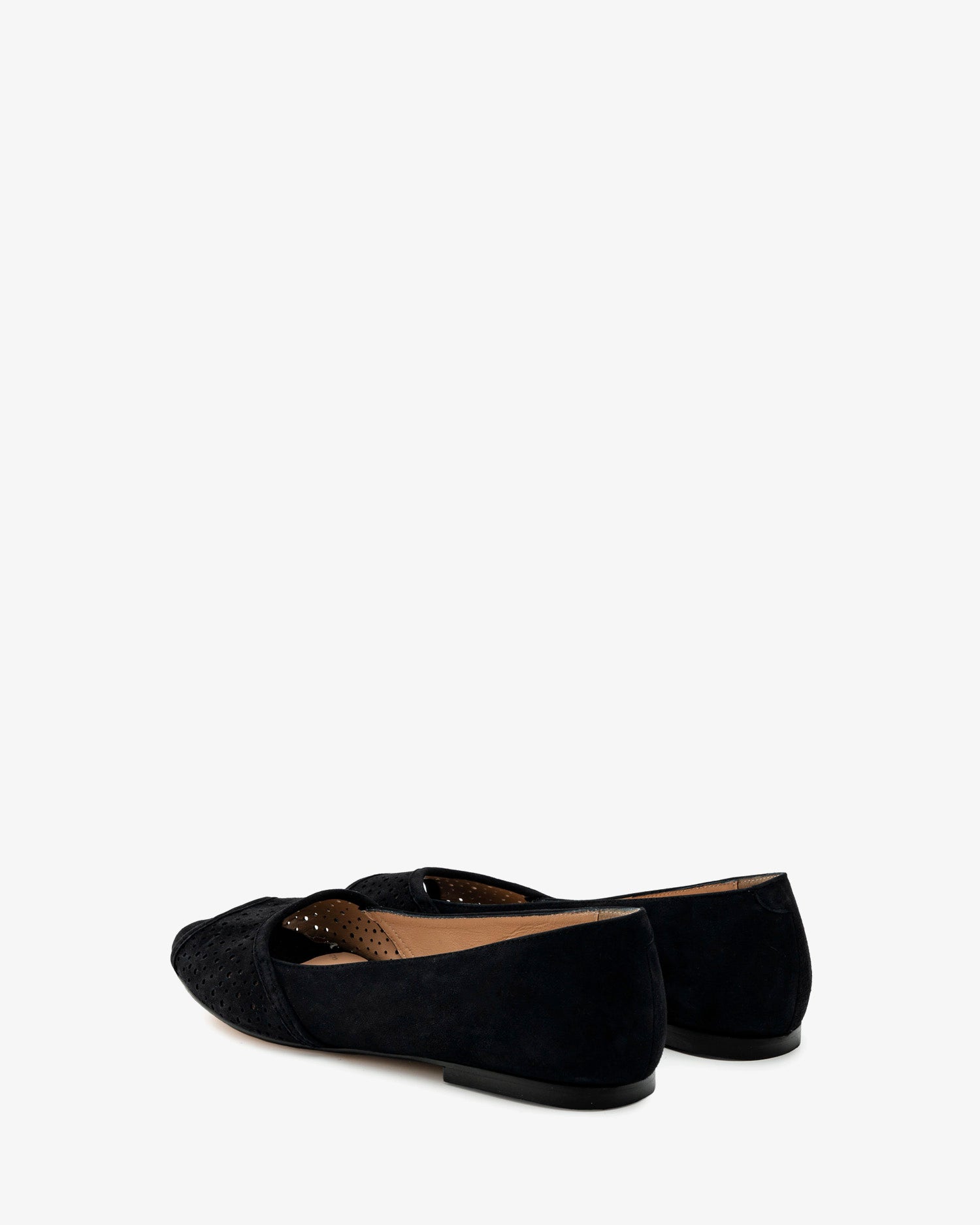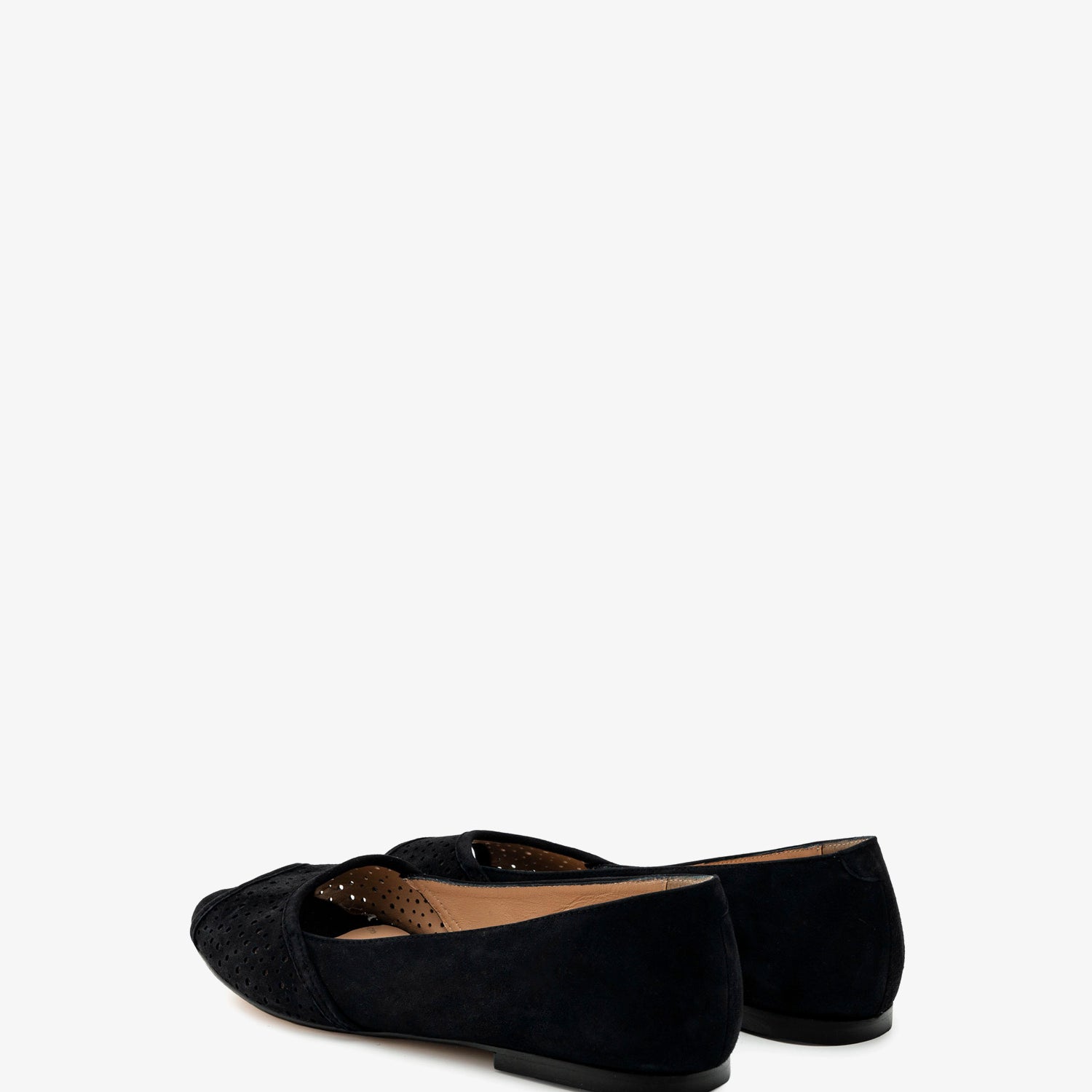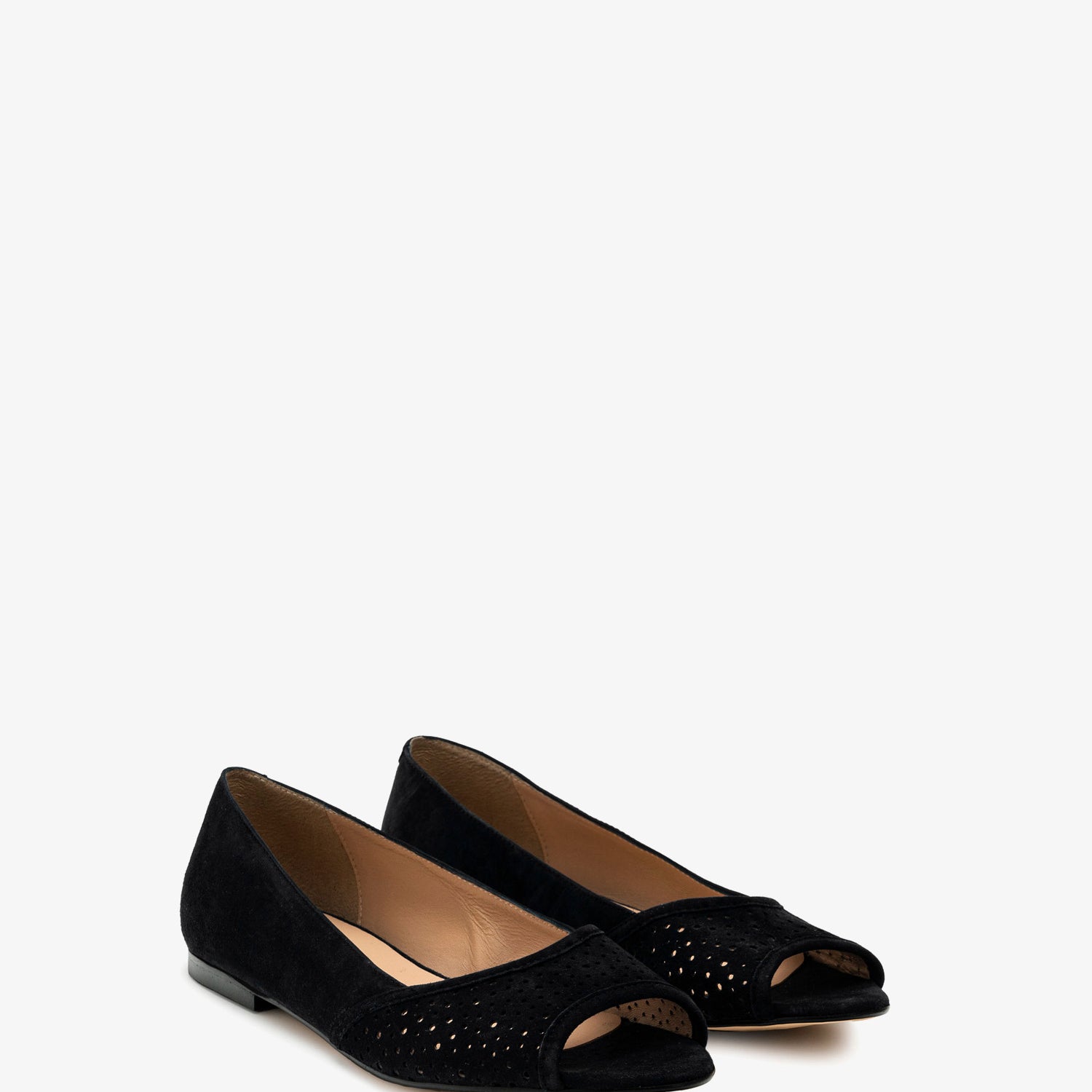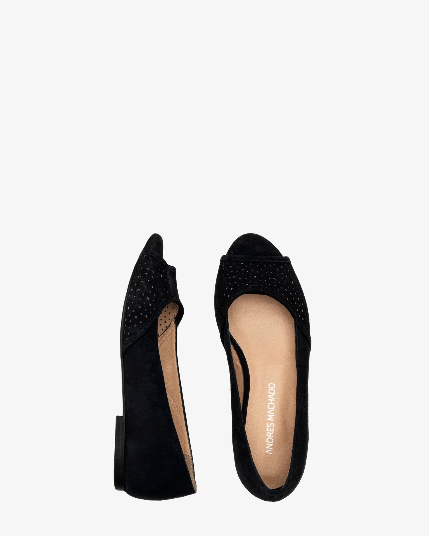 Peep toe ballet flats made of suede leather in black colour. The upper band is die-cut. Insole in leather. Small sizes UK 0.5 to 2.5 / EU 32 to 35. Large sizes UK 8 to 10.5 / EU 42 to 45. MADE IN SPAIN.