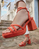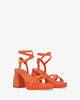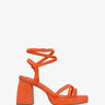Sandals in orange suede-like material with a square heel and platform. Open-back design with thin straps intertwined in the front. Metallic buckle closure with wraparound ankle straps. Square and open toe. Heel of 4,13" and platform of 0,98" for small sizes from 32 to 35. Heel of 4,33" and platform of 0,98" for large sizes from 42 to 45.