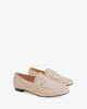 Penny loafers in ivory colored faux leather with matching saddle on the vamp. Almond shaped toe box. Available in large sizes from 42 to 45 EU.