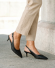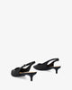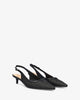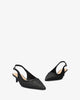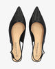 Slingback court shoe in synthetic raffia with a pointed toe finish and contrasting trim-effect back strap, fastened with a side metal buckle.