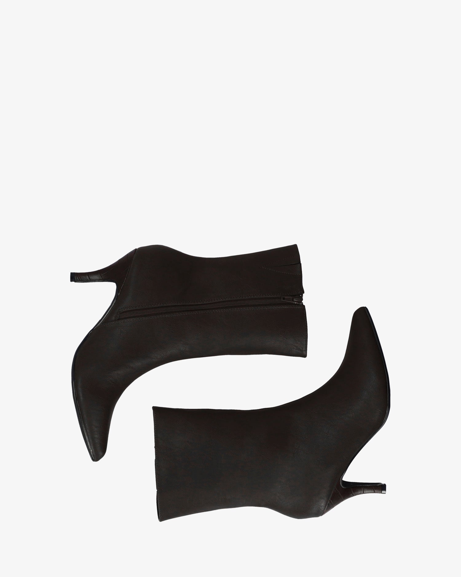 High-top booties in black colored faux leather. Decorative stitching from the tip of the toe box to the upper edge of the shaft. Finished in a pointed toe. Matching zipper closure on the internal side of the shaft. The thin mid heel lined in matching croc texture is 6.5 cm / 2.55`` high for small sizes from 32 to 35 EU and 8 cm / 3.14`` high for large sizes from 42 to 45 EU.
