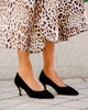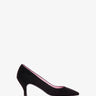 Mid-heeled pointy-toed pumps in Black suede. Lining and insole in Pink leather. Heel of 2.36 inches / 6 cm for small sizes from EU 32 to 35. Heel of 2.55 inches / 6.5 cm for medium sizes from EU 36 to 41. Heel of 2.95 inches / 7.5 cm for large sizes from EU 42 to 45. Authentic Spanish craftmanship.