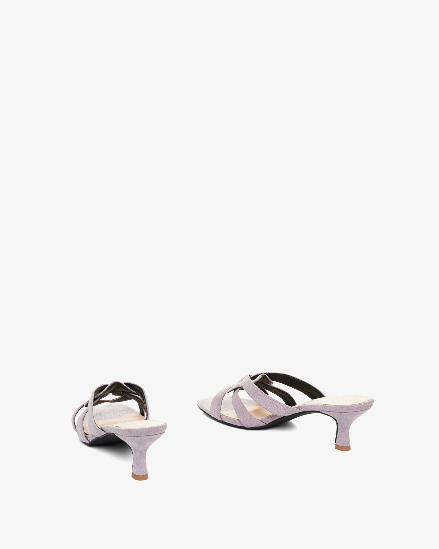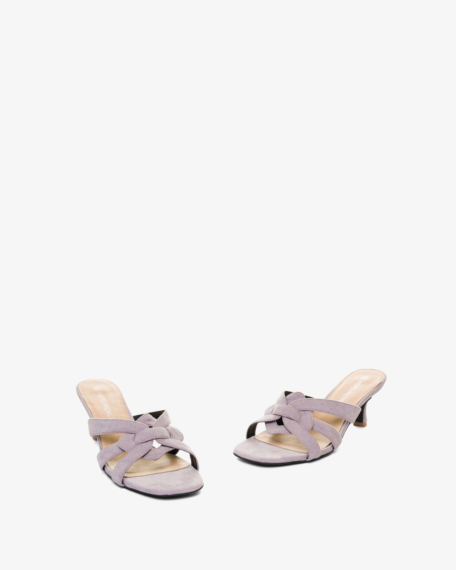 Purple faux suede mules featuring a kitten heel. Intertwined straps detail over the vamp. Open and square toe box. The thin, matching heel is 6,5cm /2,56`` for small sizes from 32 to 35 EU. The thin, matching heel is 7cm /2,75`` for small sizes from 42 to 45 EU.