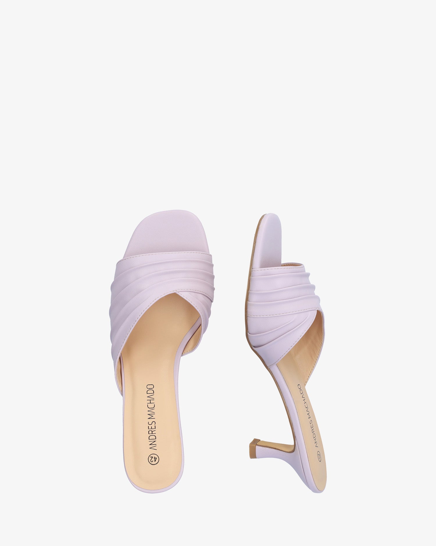 Purple soft mules with Kitten heel. Open-back design with a wide draped strap at the front. Open and square toe. Kitten heel of 2,56" for sizes 32 to 35. Kitten heel of 2,75" for sizes 42 to 45.