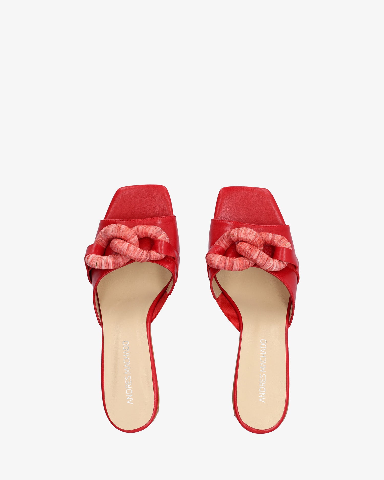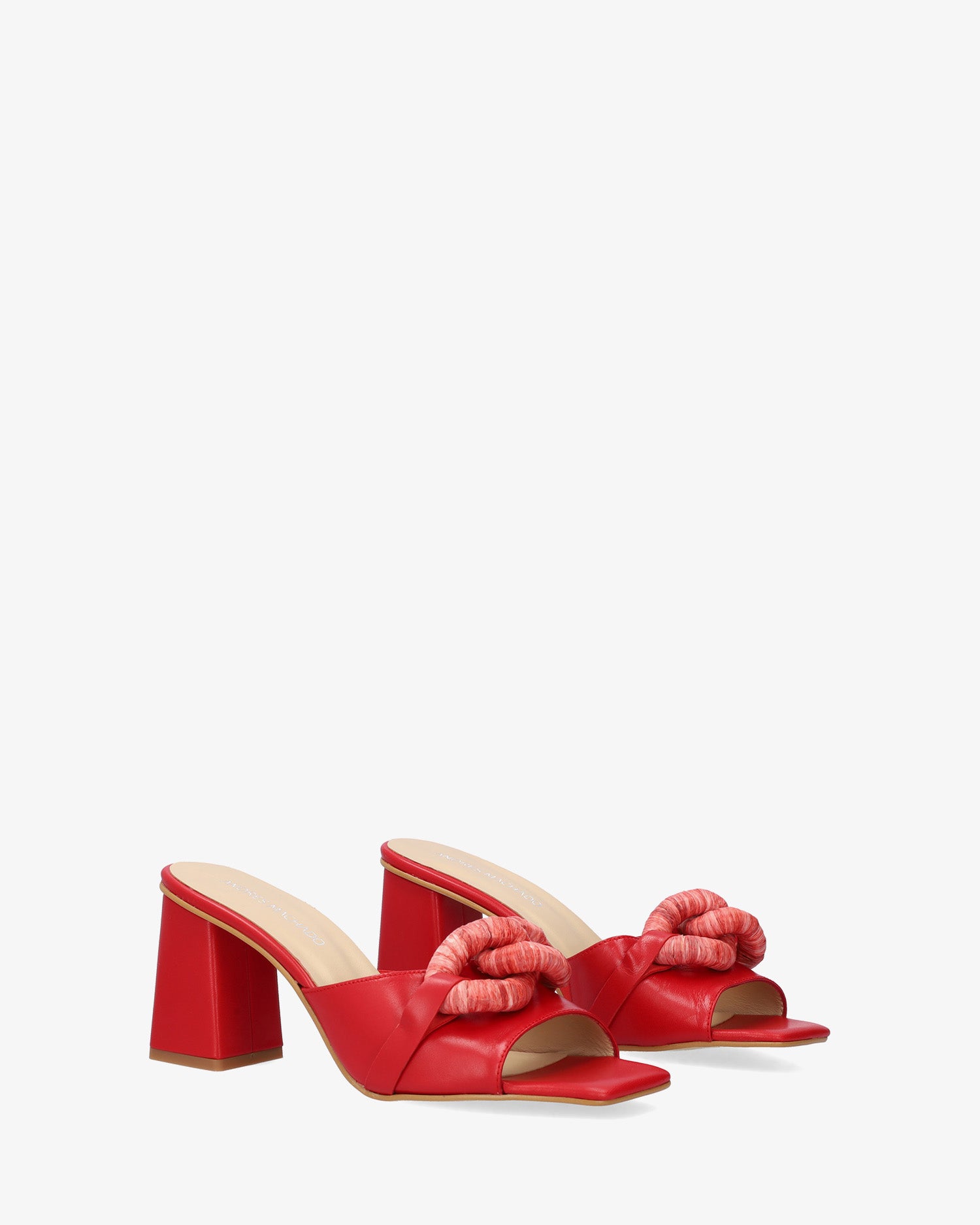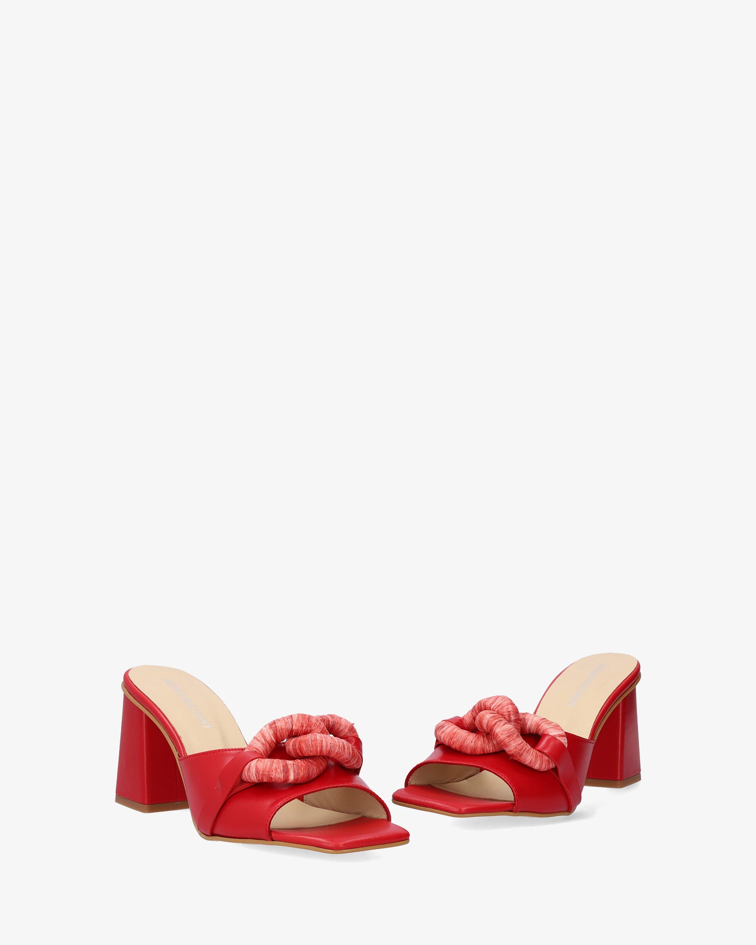 Red leather sandals. Wide strap design featuring a maxi chain link detail in matching raffia on the vamp. Finished in a square toe box. The matching square heel is 7,5cm /2,95`` high for small sizes from 32 to 35 EU. The heel is 9cm /3,54`` high for large sizes from 42 to 45 EU. Made in Spain