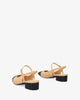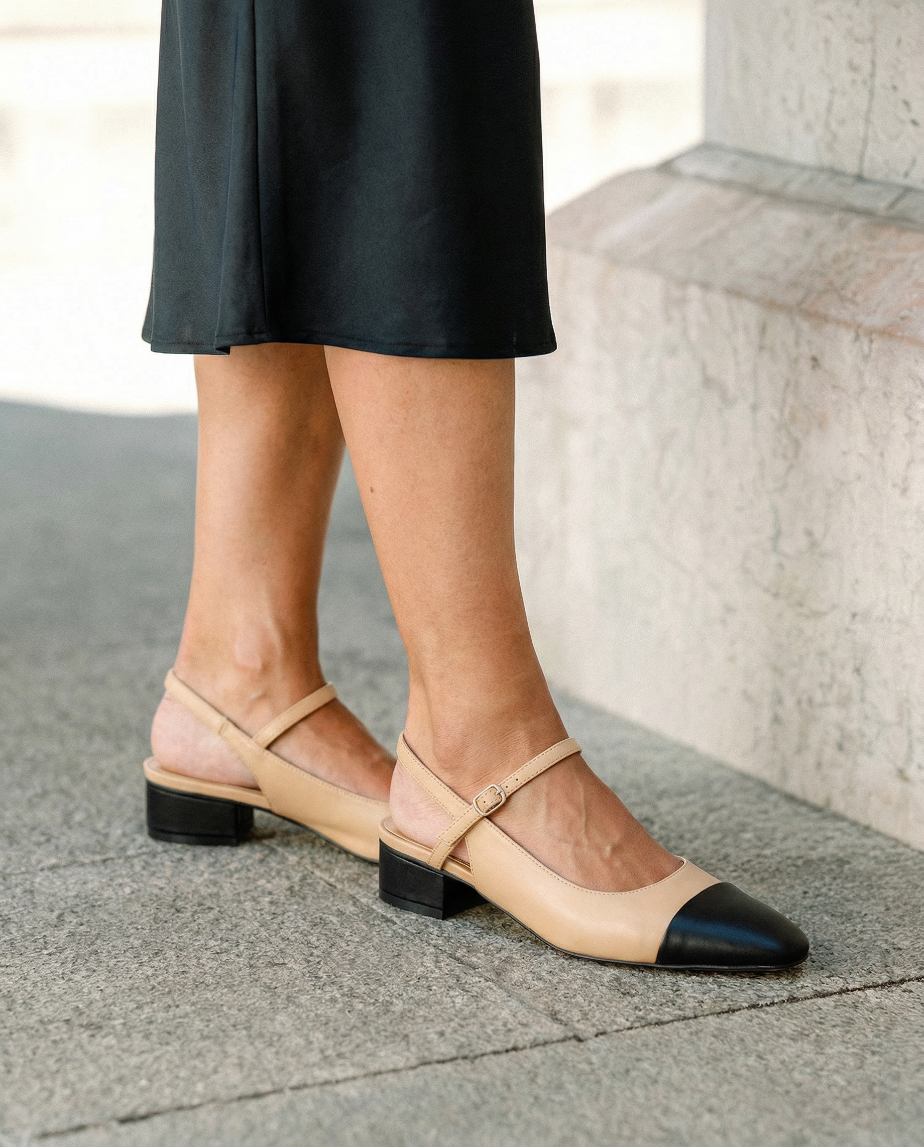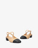 Slingback court shoe with a wide heel in soft material, contrasting black rounded toe, tone-on-tone strap across the instep and buckle fastening.