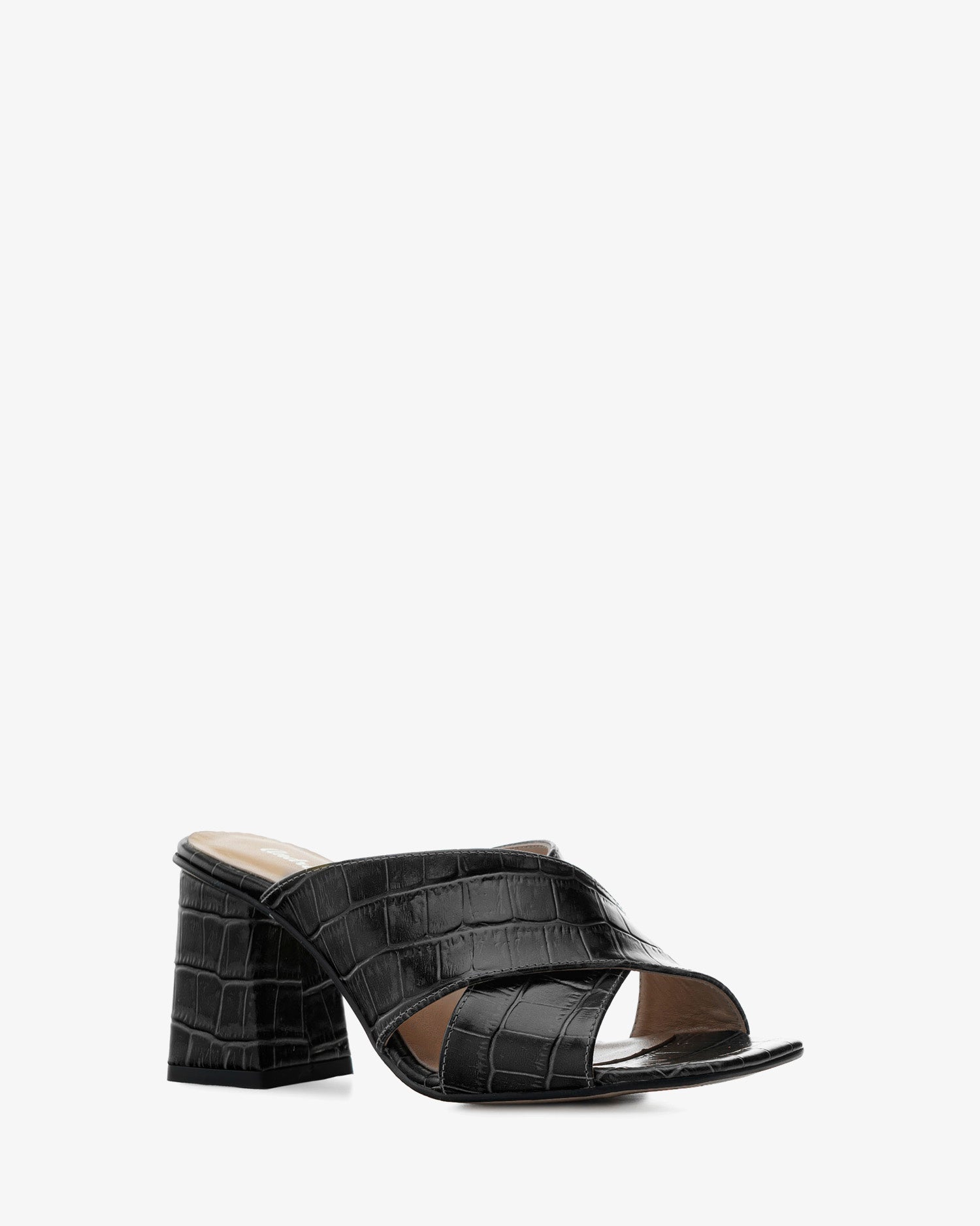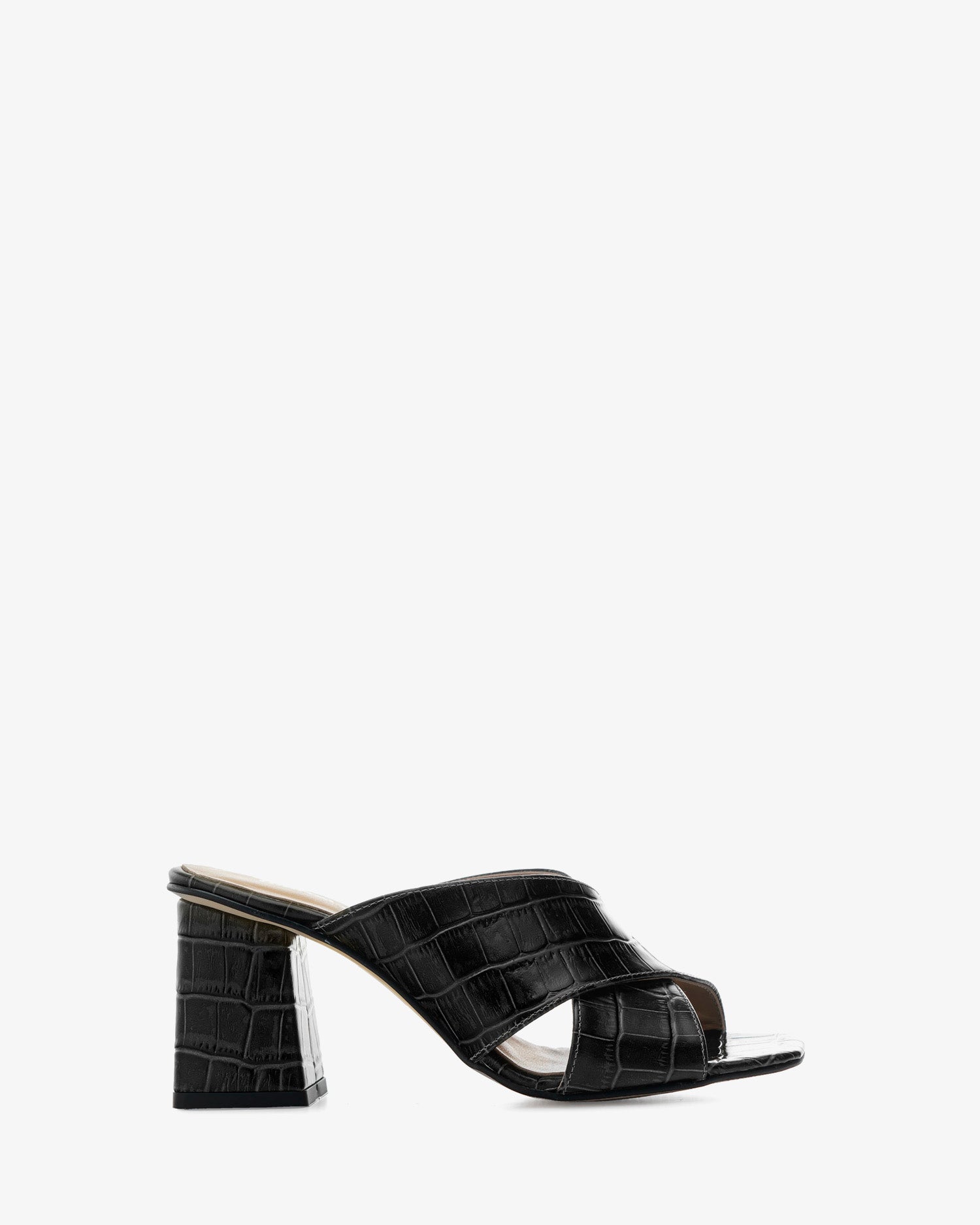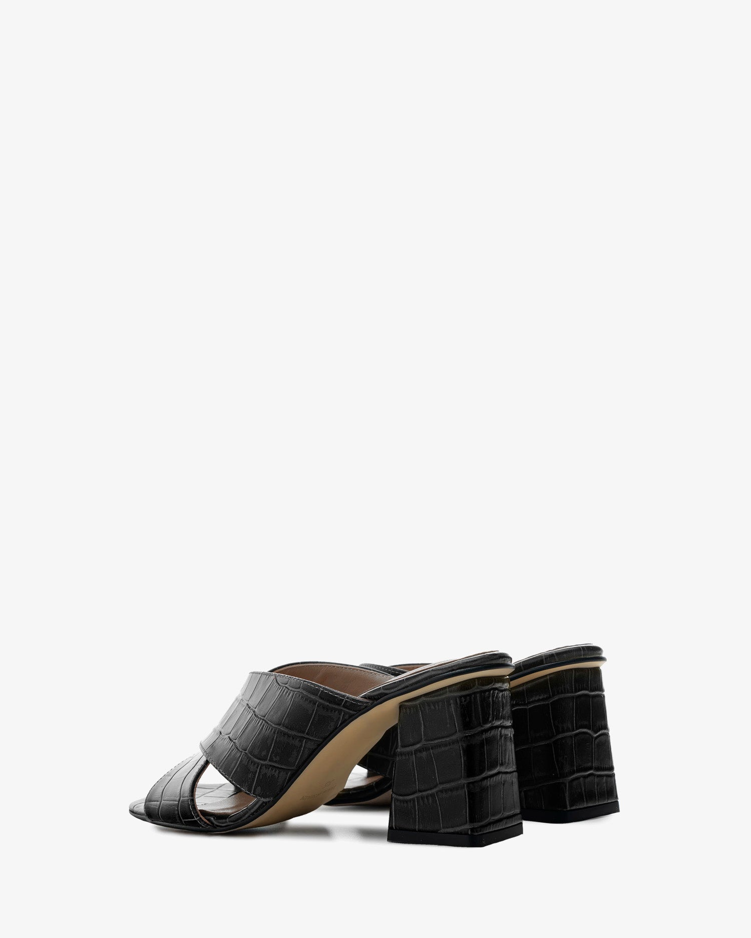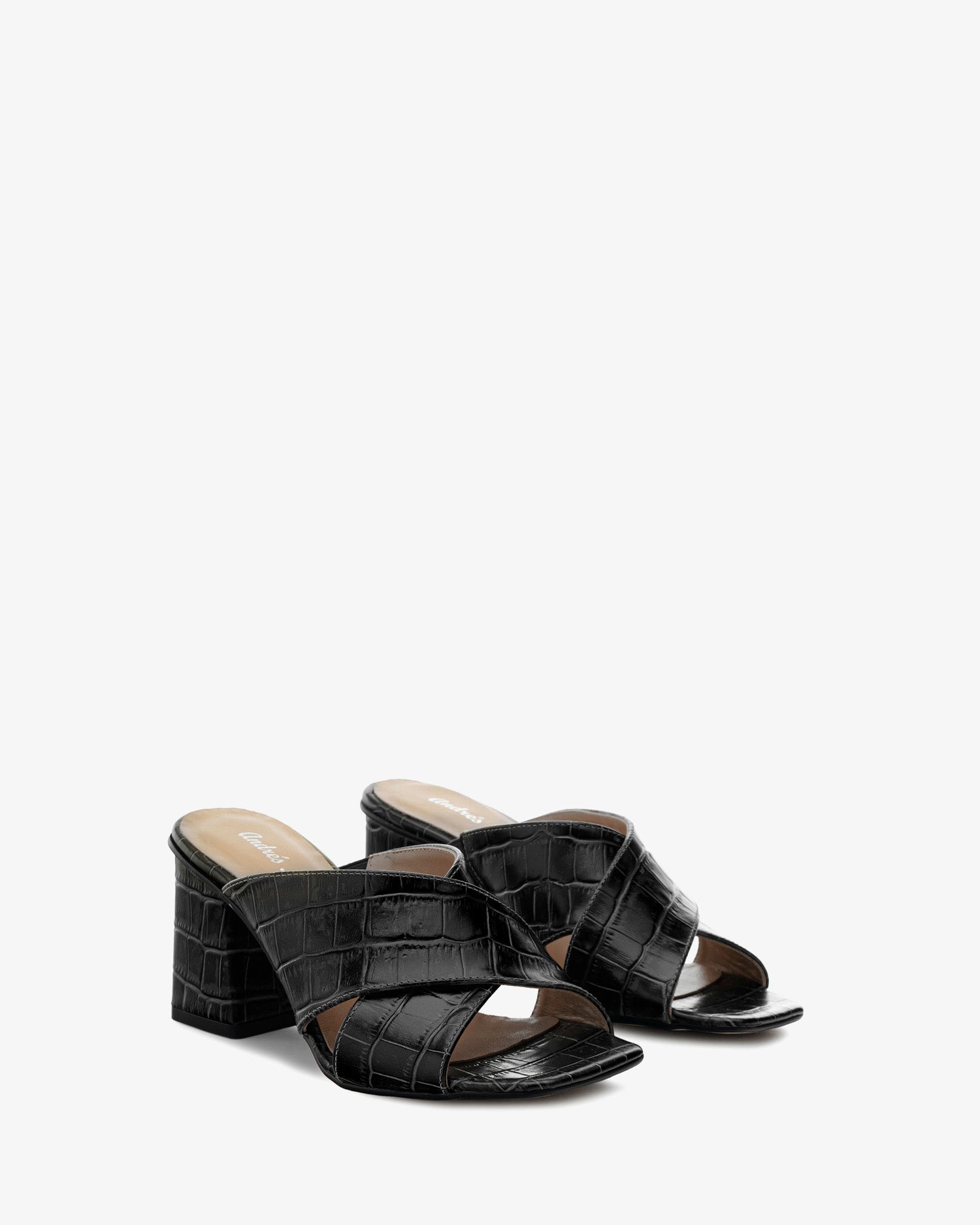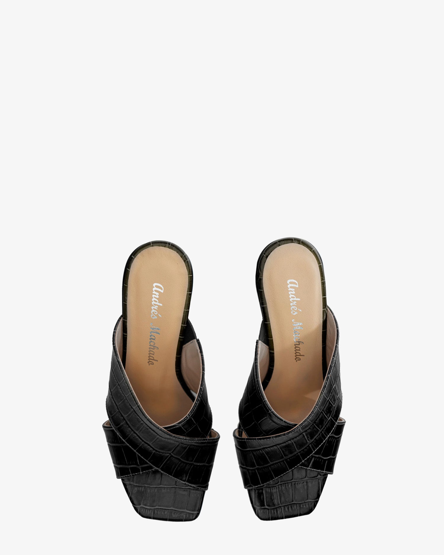 Sandals made of engraved croc leather in Black colour. Criss-cross straps over the instep with an inner small toned-coloured elastic band for an optimal adjustment of the foot. Inner lining in natural leather and square-shaped toe. Toned-covered block heel of 2.75" / 7 cm for Small sizes from UK 0.5 to 2.5 / EU 32 to 35. Toned-covered block heel of 3.14" / 8 cm for Big sizes from UK 8 to 10.5 / EU 42 to 45. Made in Spain.