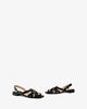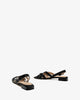 Sandals in black embossed leather. Designed with wide straps over the instep. Oval buckled closure strap around the ankle. Finished in a square toe. The block heel with wooden effect is 2 cm / 0.78`` high for all sizes from 32 to 45 EU.