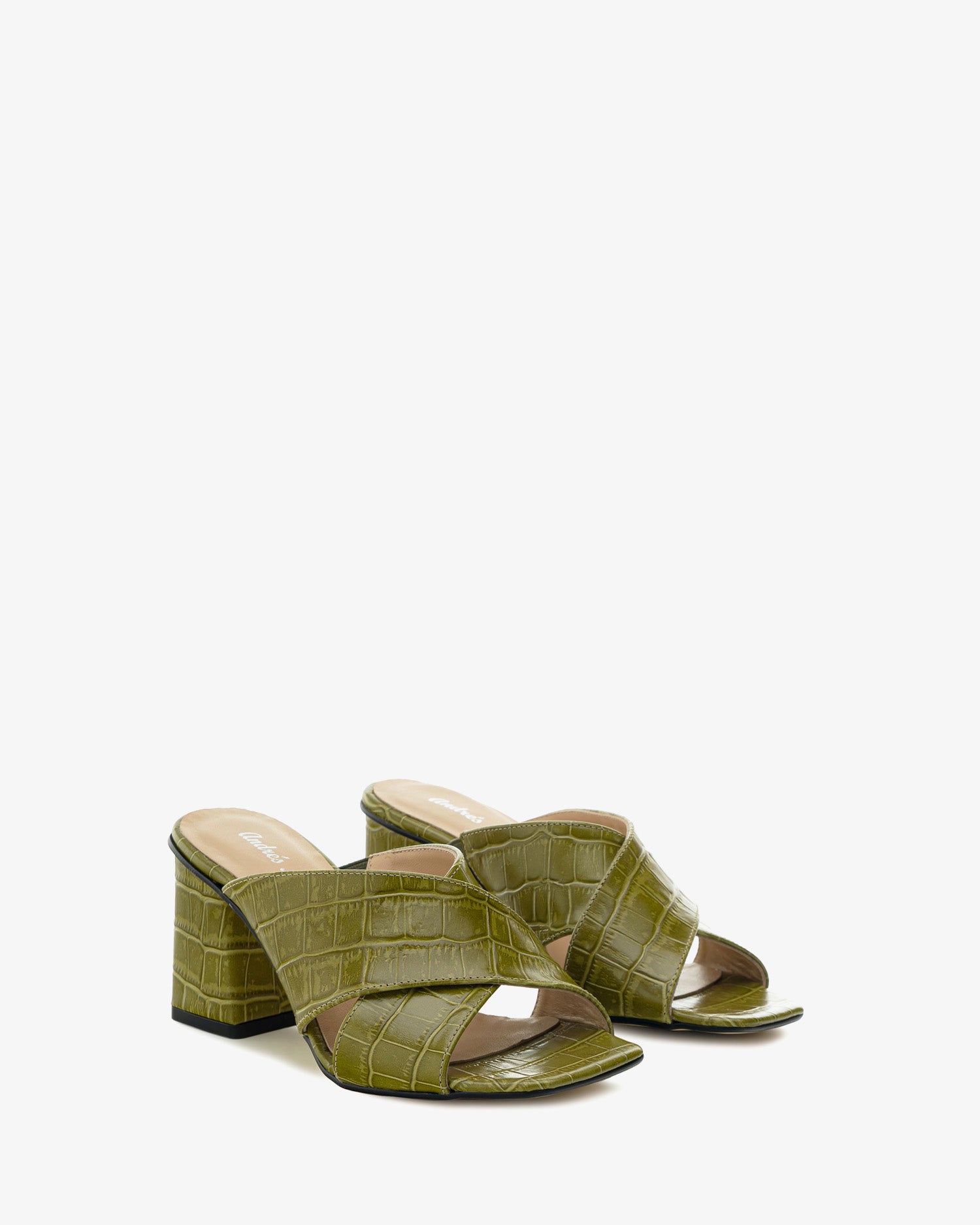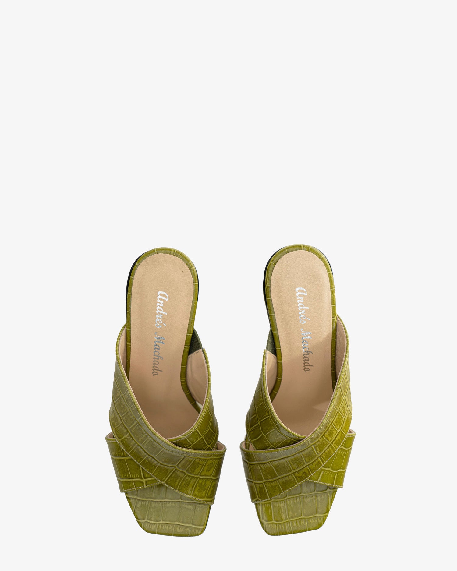 Sandals made of engraved croc leather in Olive Green colour. Criss-cross straps over the instep with an inner small toned-coloured elastic band for an optimal adjustment of the foot. Inner lining in natural leather and square-shaped toe. Toned-covered block heel of 2.75" / 7 cm for Small sizes from UK 0.5 to 2.5 / EU 32 to 35. Toned-covered block heel of 3.14" / 8 cm for Big sizes from UK 8 to 10.5 / EU 42 to 45. Made in Spain.