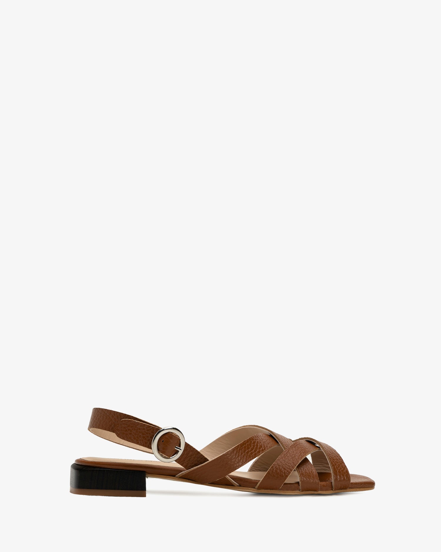 Sandals in camel embossed leather. Designed with wide straps over the instep. Oval buckled closure strap around the ankle. Finished in a square toe. The block heel with wooden effect is 2 cm / 0.78`` high for all sizes from 32 to 45 EU.