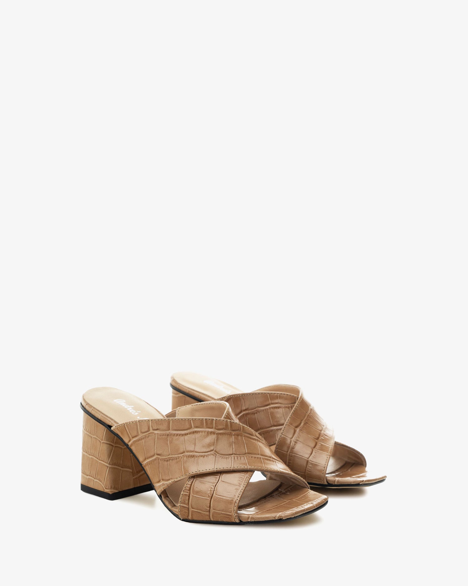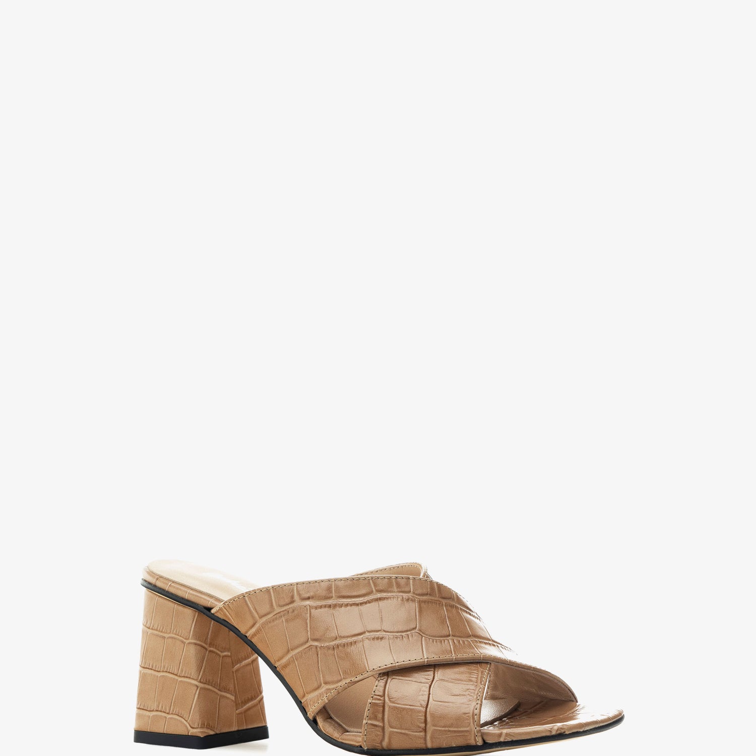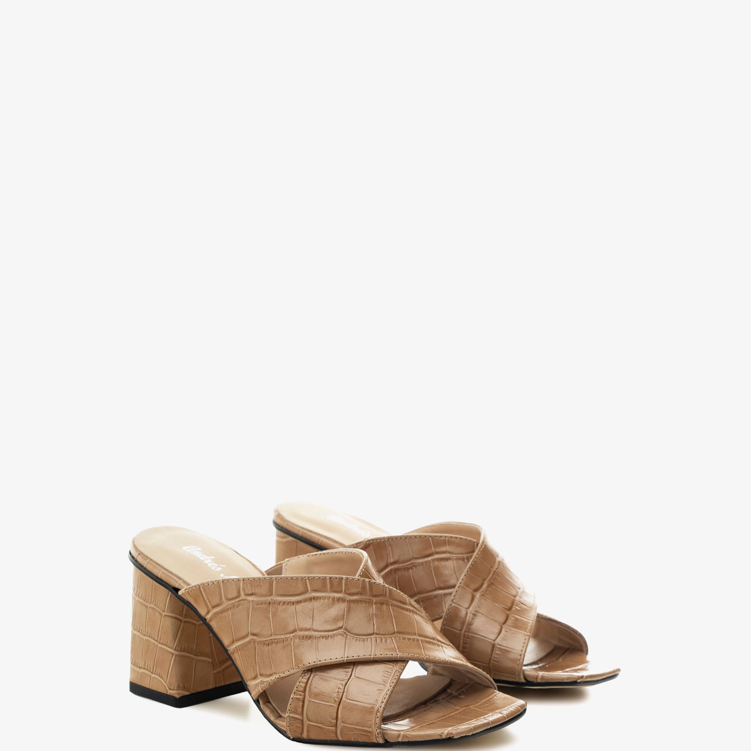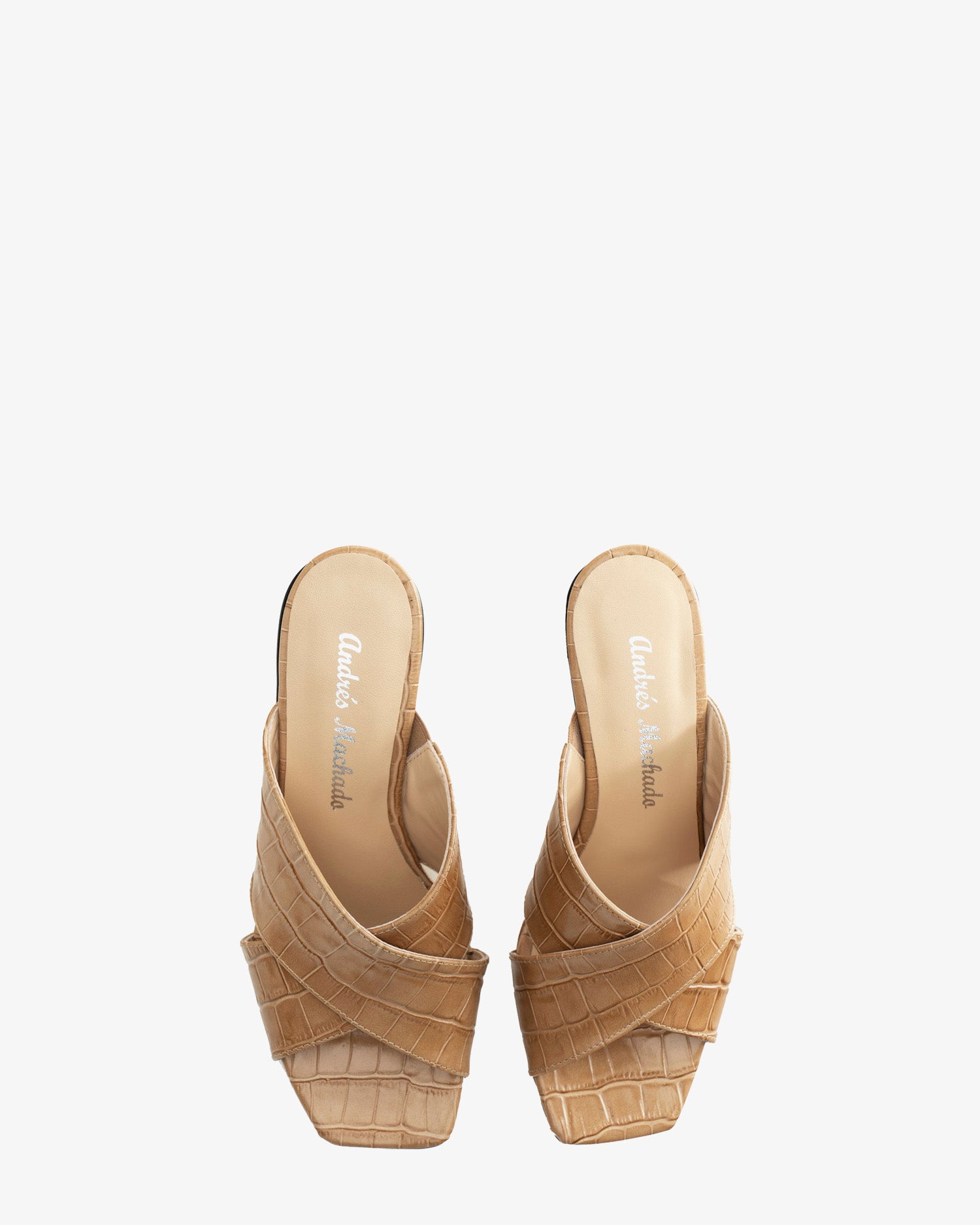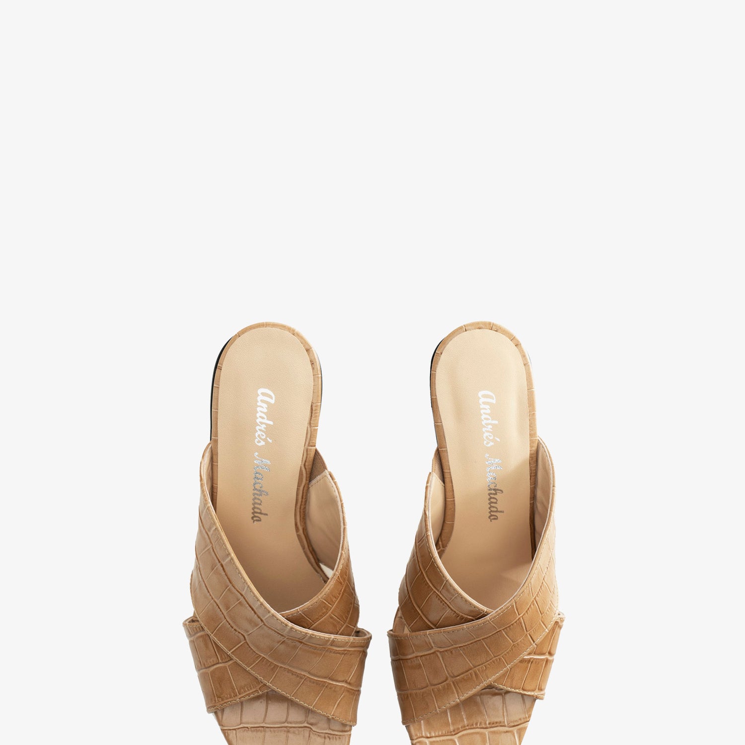Sandals made of engraved croc leather in Earth colour. Criss-cross straps over the instep with an inner small toned-coloured elastic band for an optimal adjustment of the foot. Inner lining in natural leather and square-shaped toe. Toned-covered block heel of 2.75" / 7 cm for Small sizes from UK 0.5 to 2.5 / EU 32 to 35. Toned-covered block heel of 3.14" / 8 cm for Big sizes from UK 8 to 10.5 / EU 42 to 45. Made in Spain.