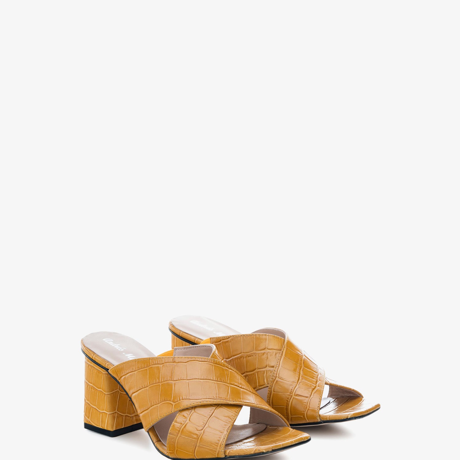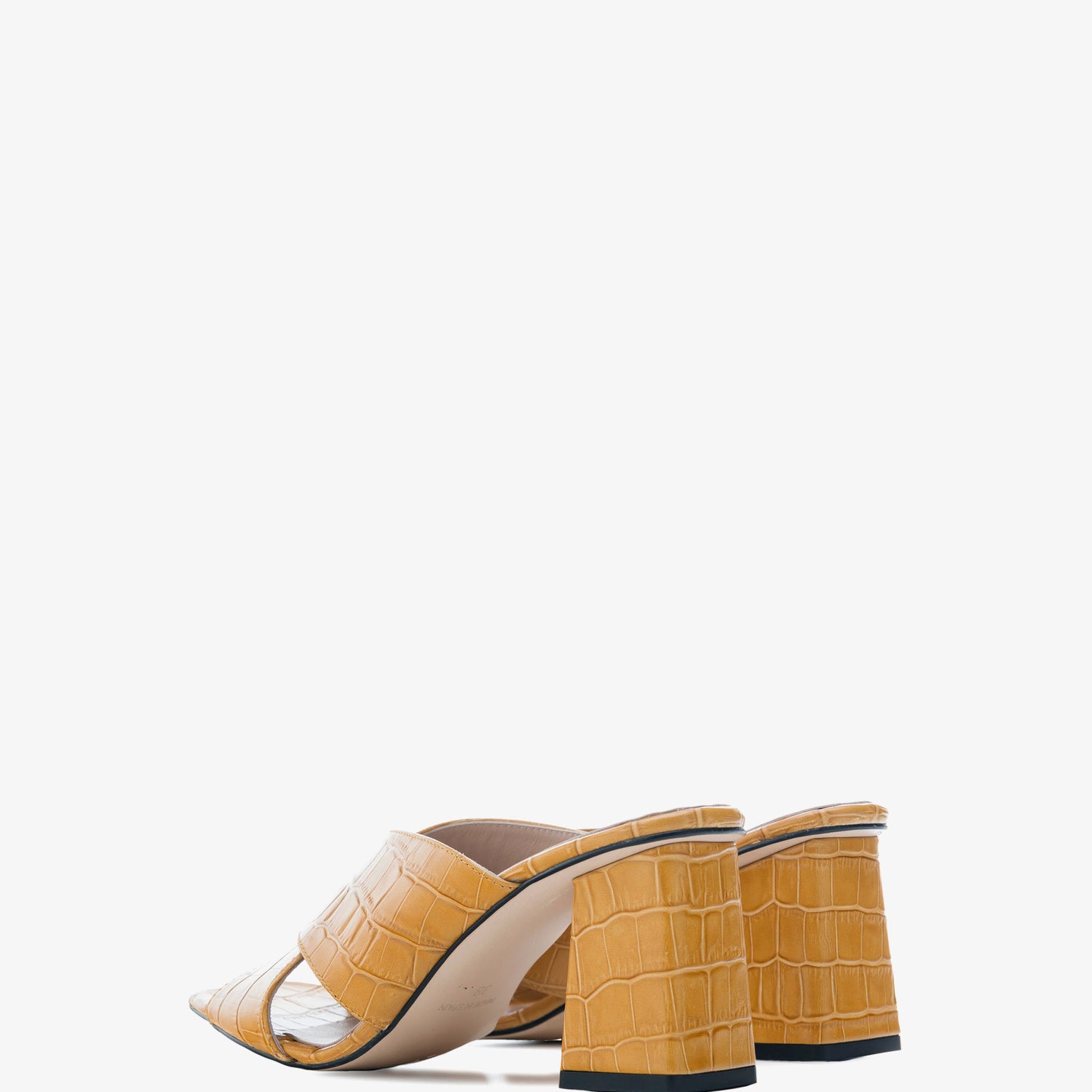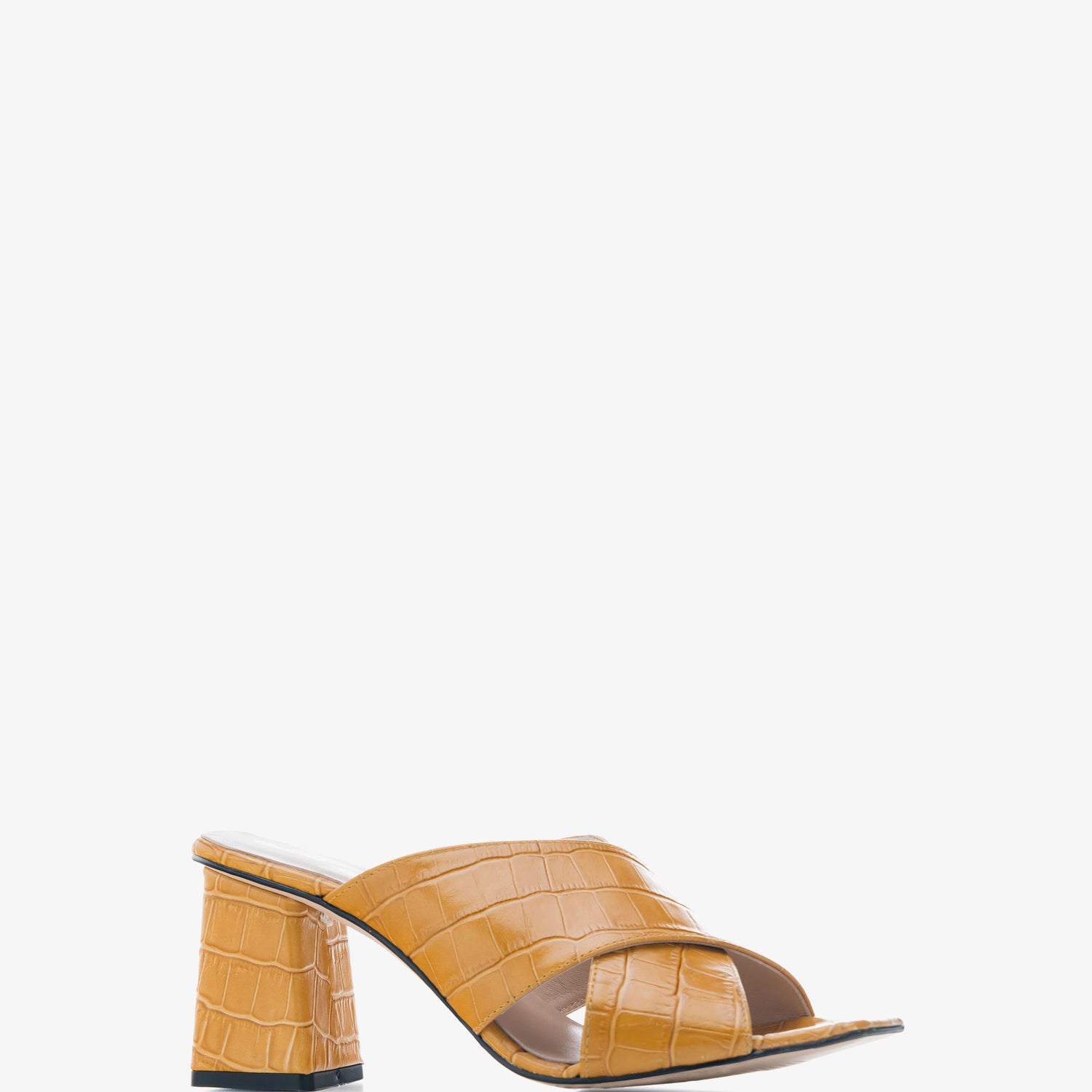 Sandals made of engraved croc leather in Mustard colour. Criss-cross straps over the instep with an inner small toned-coloured elastic band for an optimal adjustment of the foot. Inner lining in natural leather and square-shaped toe. Toned-covered block heel of 2.75" / 7 cm for Small sizes from UK 0.5 to 2.5 / EU 32 to 35. Toned-covered block heel of 3.14" / 8 cm for Big sizes from UK 8 to 10.5 / EU 42 to 45. Made in Spain.