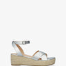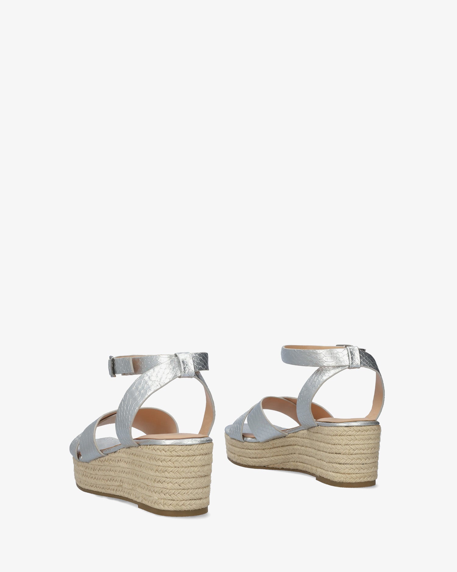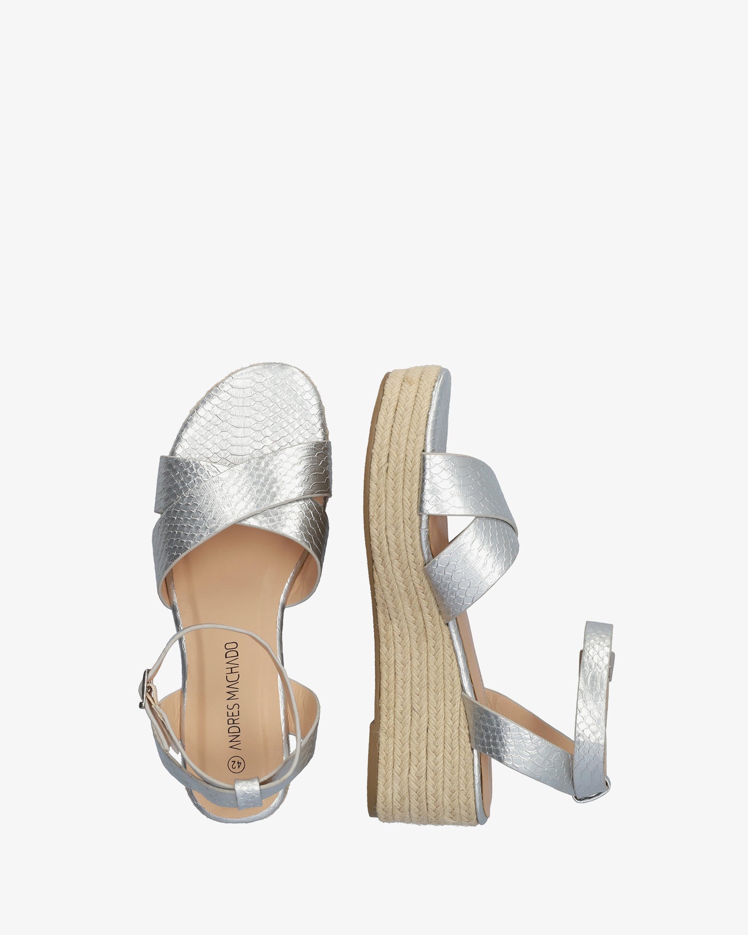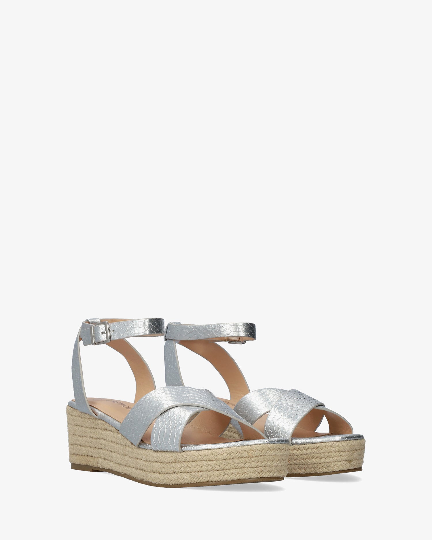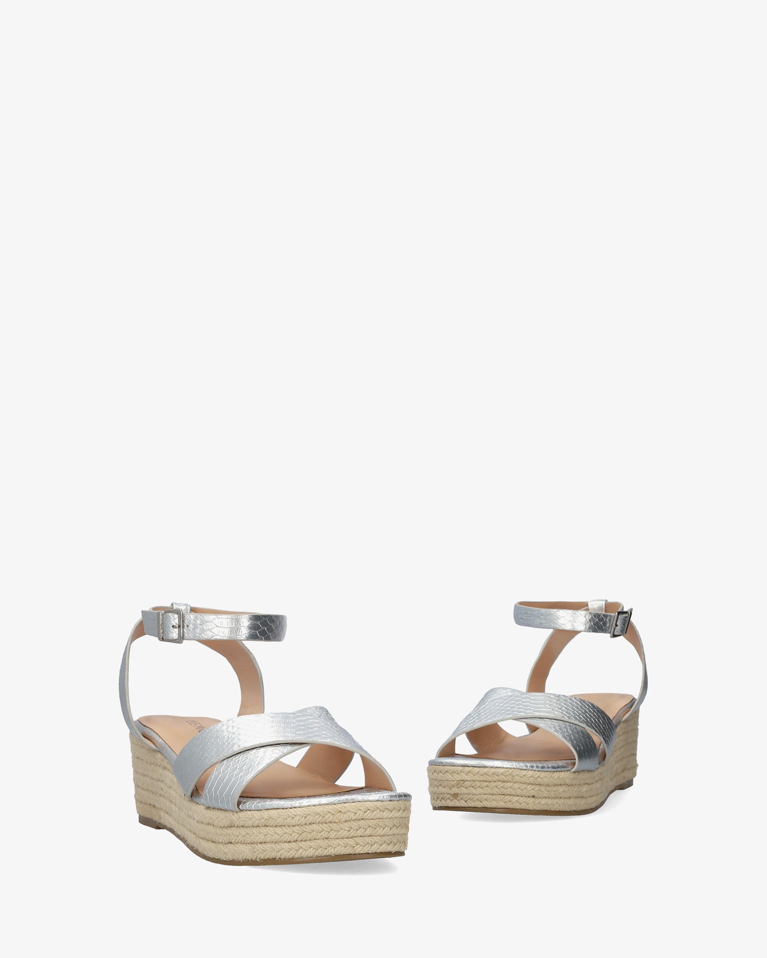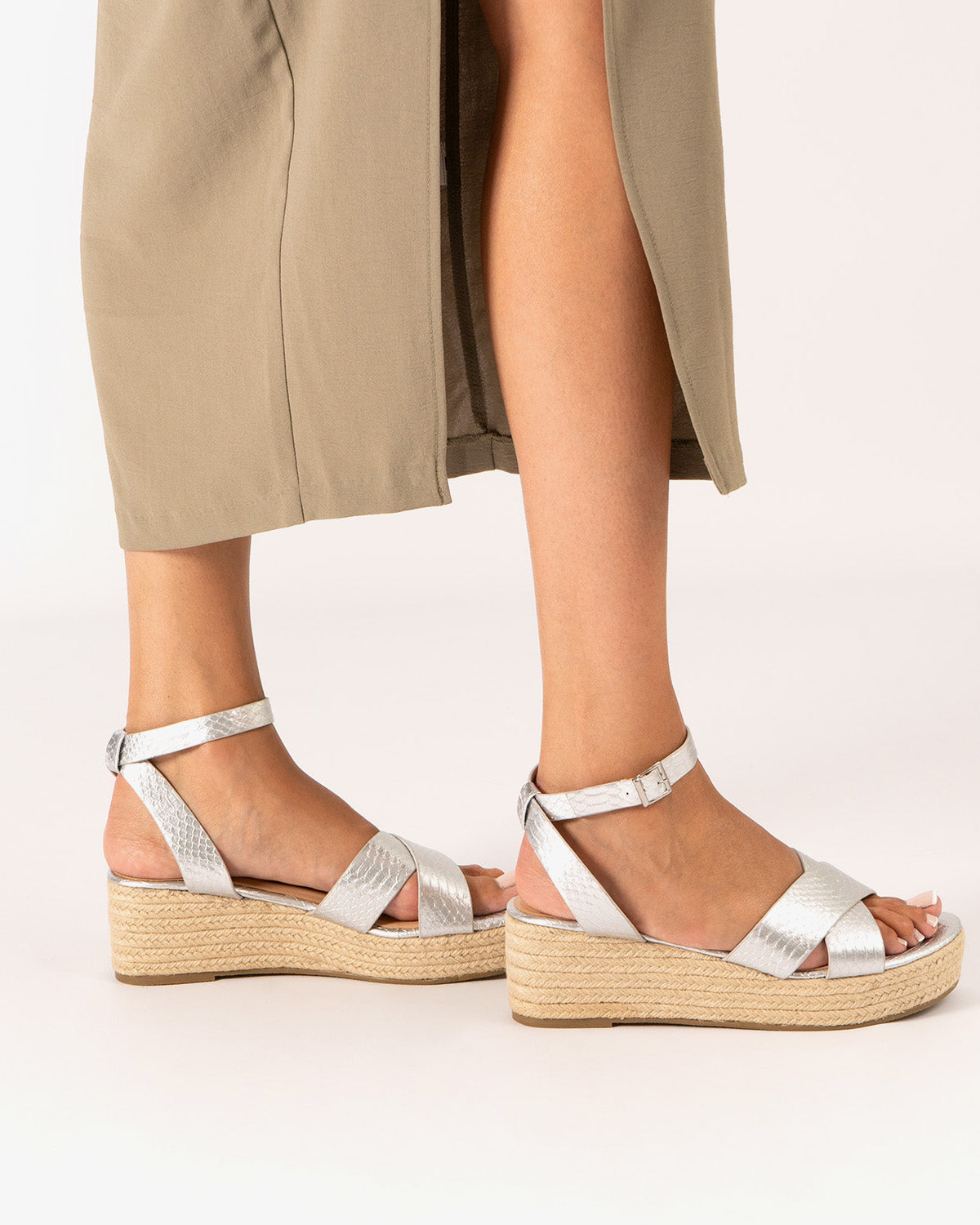 Silver coloured sandals in soft coco material and jude wedge. The design features two wide crisscross straps in matching tone at the front. Metallic buckle closure with adjustable back strap for better ankle support. Open, rounded toe. Wedges and front platform in jute. Wedge height 6 cm / 2.362 inch and platform 3 cm / 1.181 inch for small sizes 32 to 35.