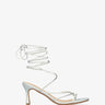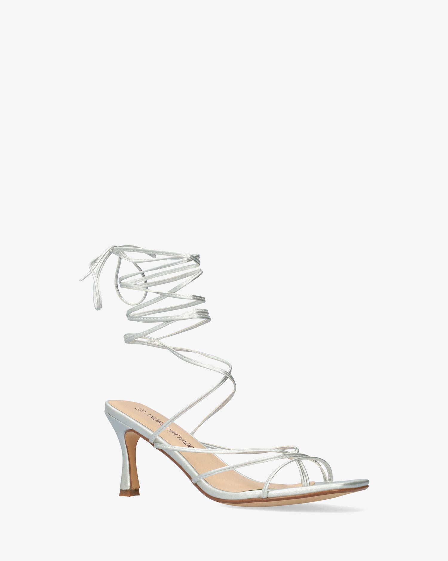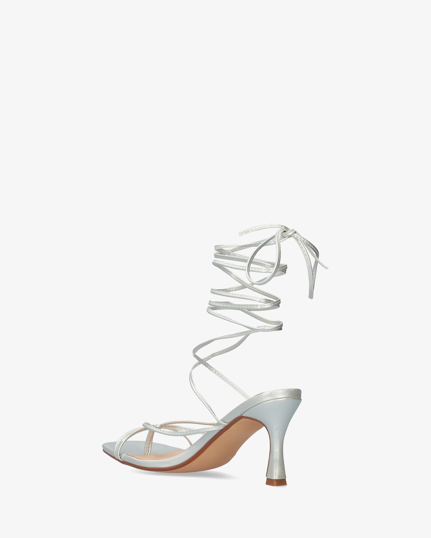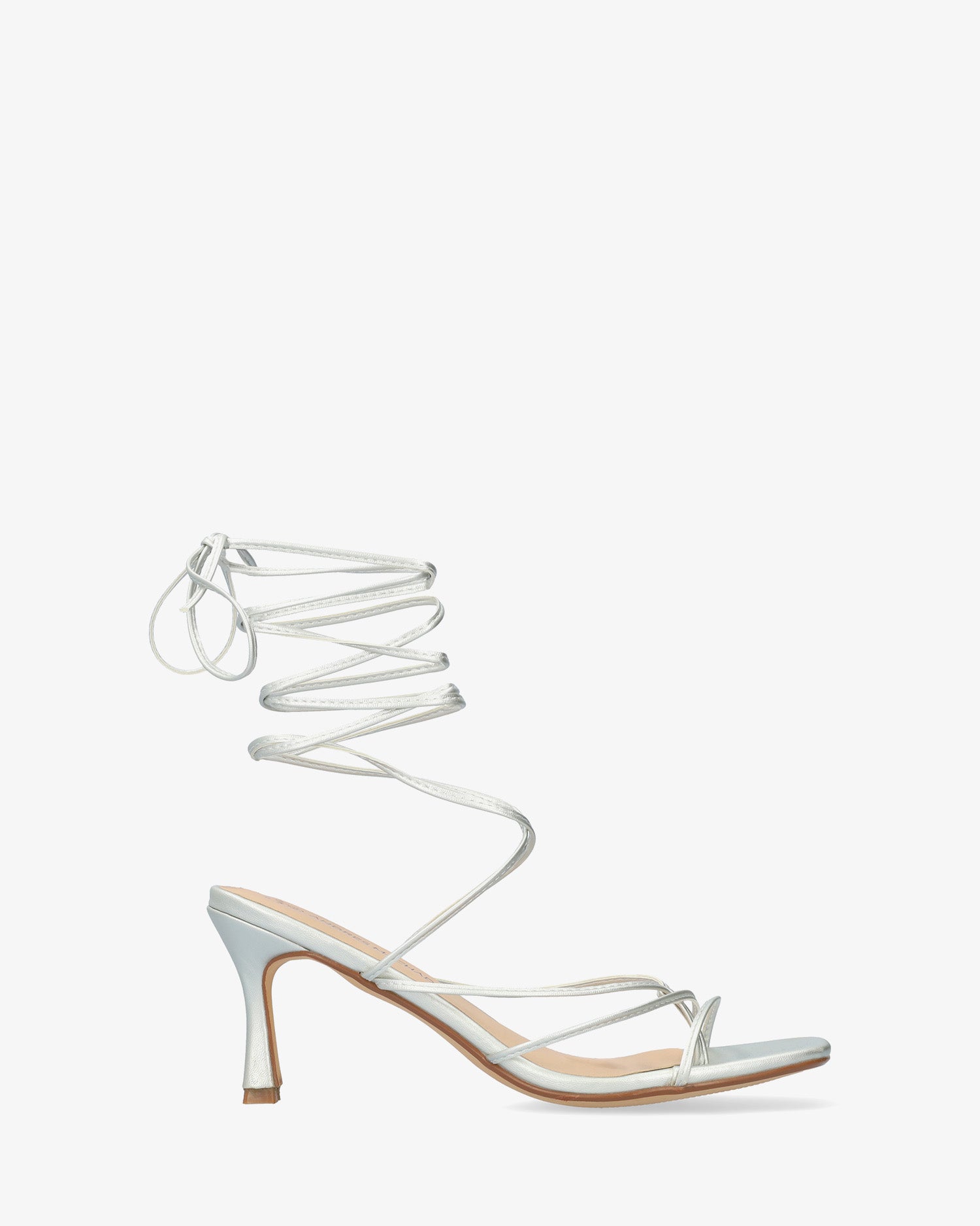 Silver soft sandals with Kitten heel. Backless design with intertwined ankle straps and inverted V-shaped toe straps on the instep. Open and square toe. Kitten heel of 2,95" for sizes 32 to 35. Kitten heel of 3,54" for sizes 42 to 45.