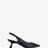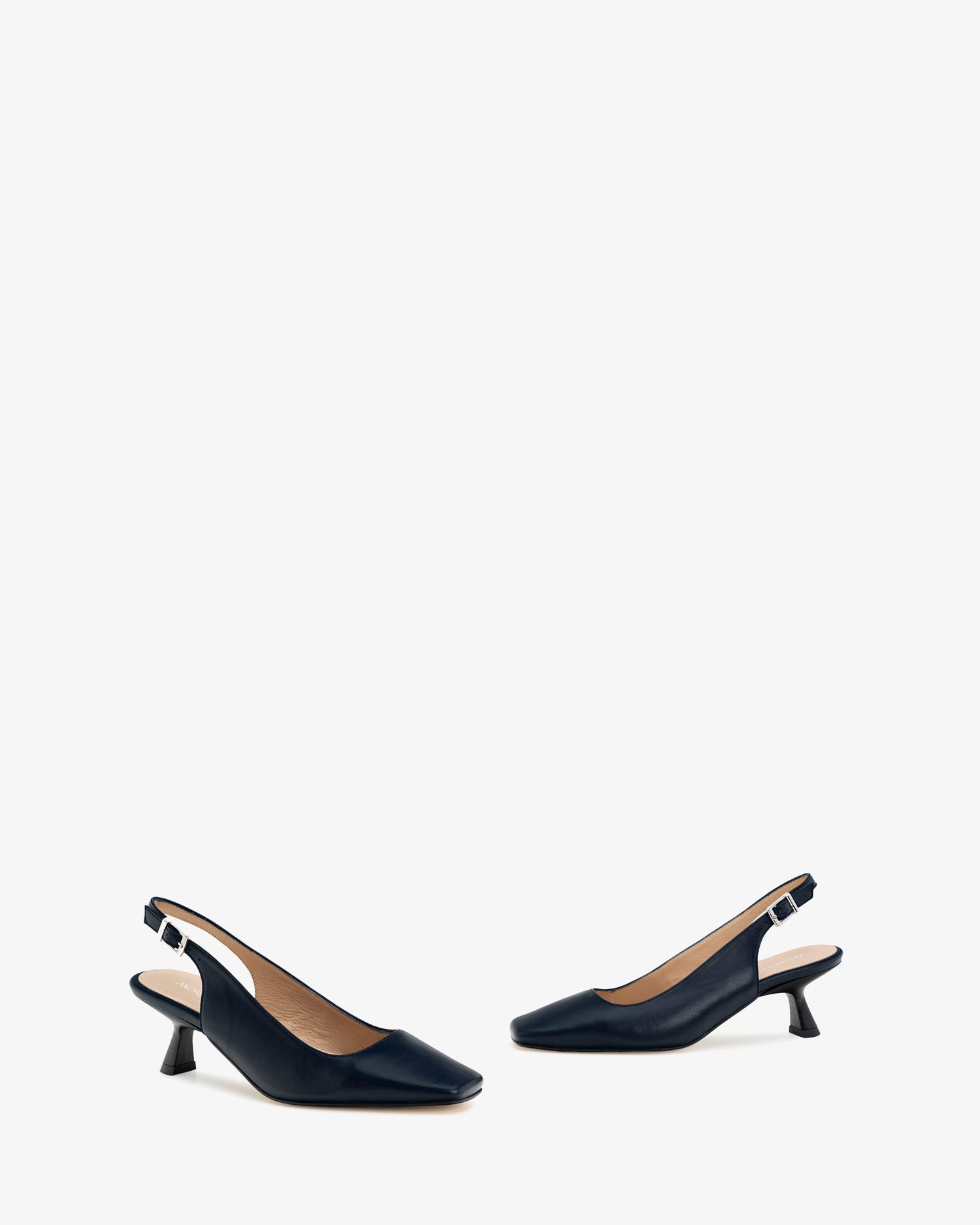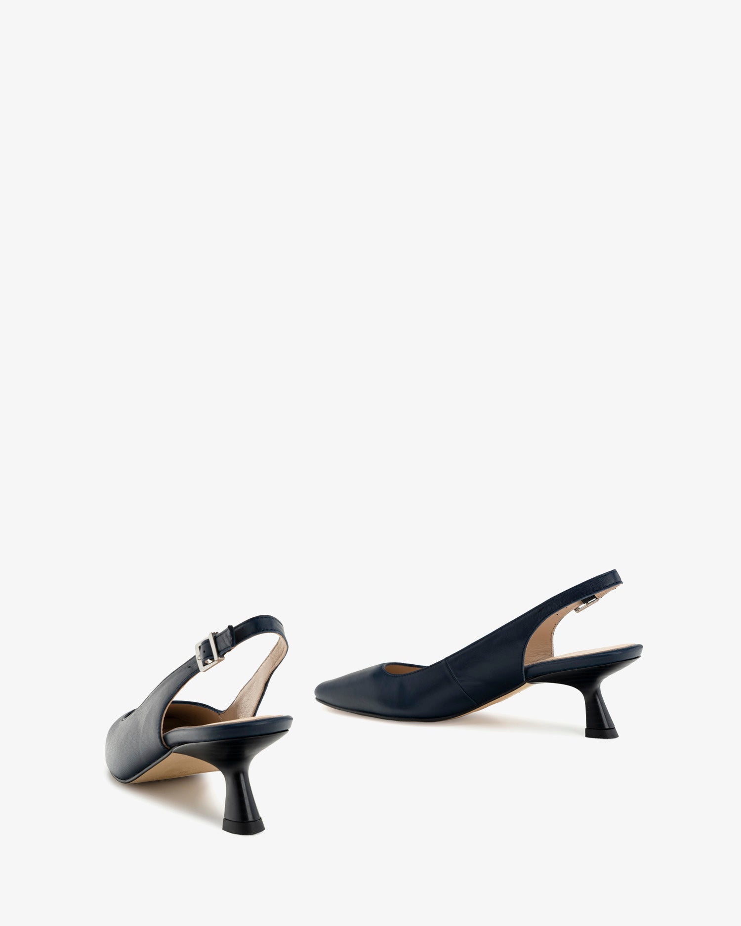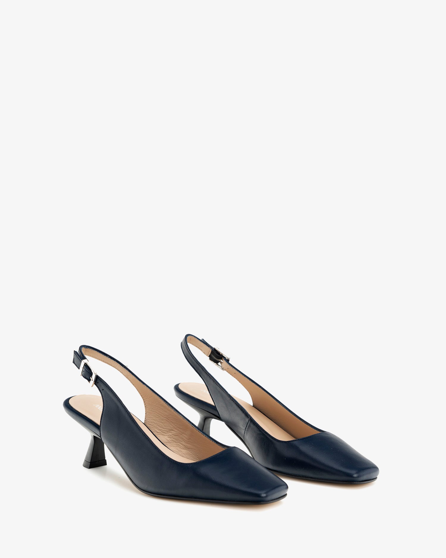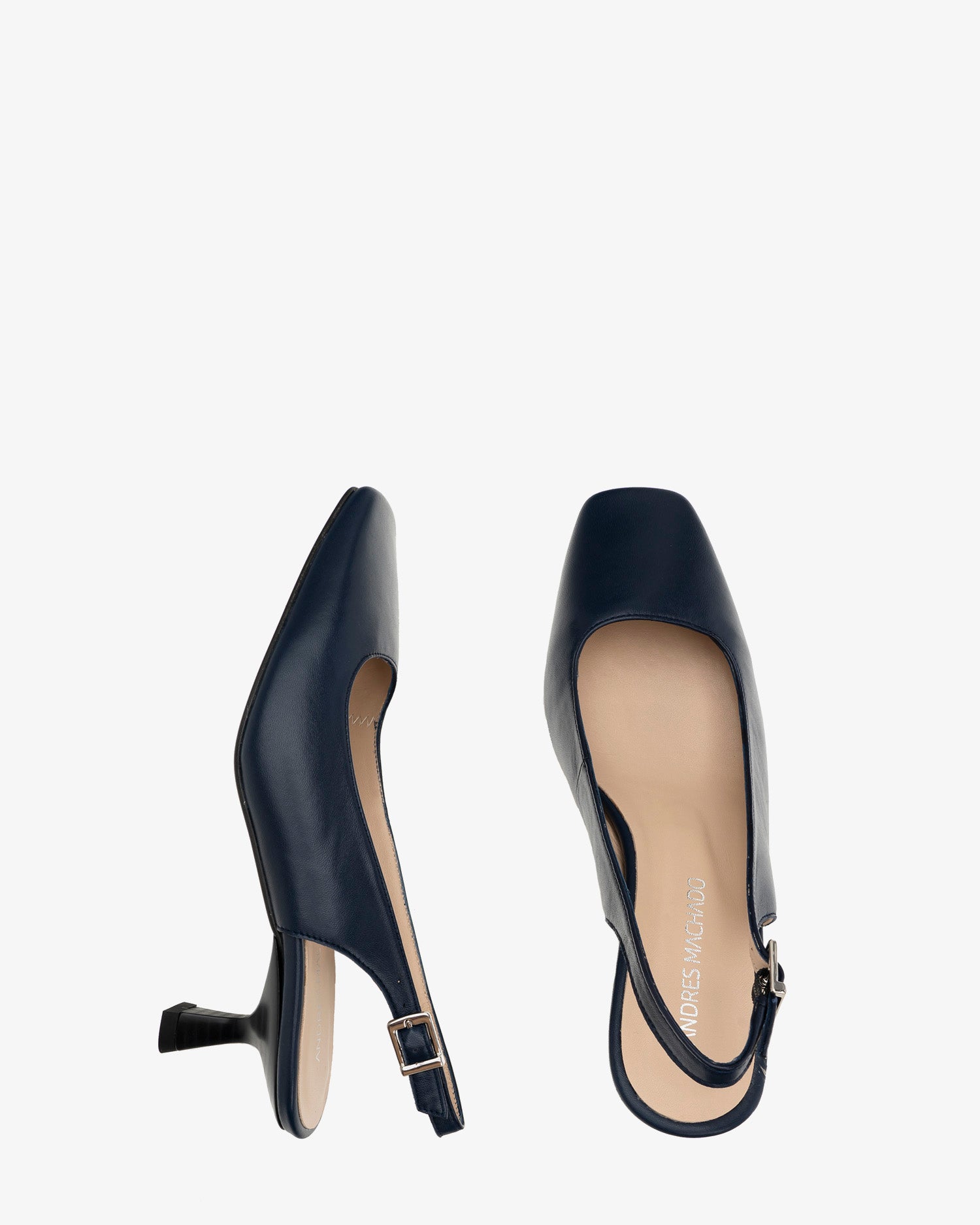 Slingback heeled shoes in navy blue leather. Designed with a square toe and buckled side strap closure. Beige leather inner lining. Kitten heel lined in wooden affect laminate. Available in sizes 32 to 45. The heel is 5,5 cm / 2.16`` high for small sizes from 32 to 38 EU. The heel is 6 cm / 2.36`` high for medium sizes from 38 to 45 EU. Made in Spain. Narrow fit. We recommend taking one size up if you have a wide foot or you are between two sizes.