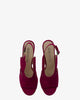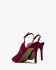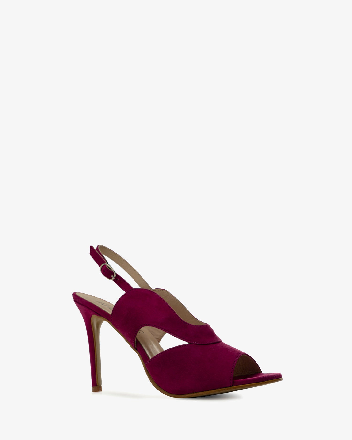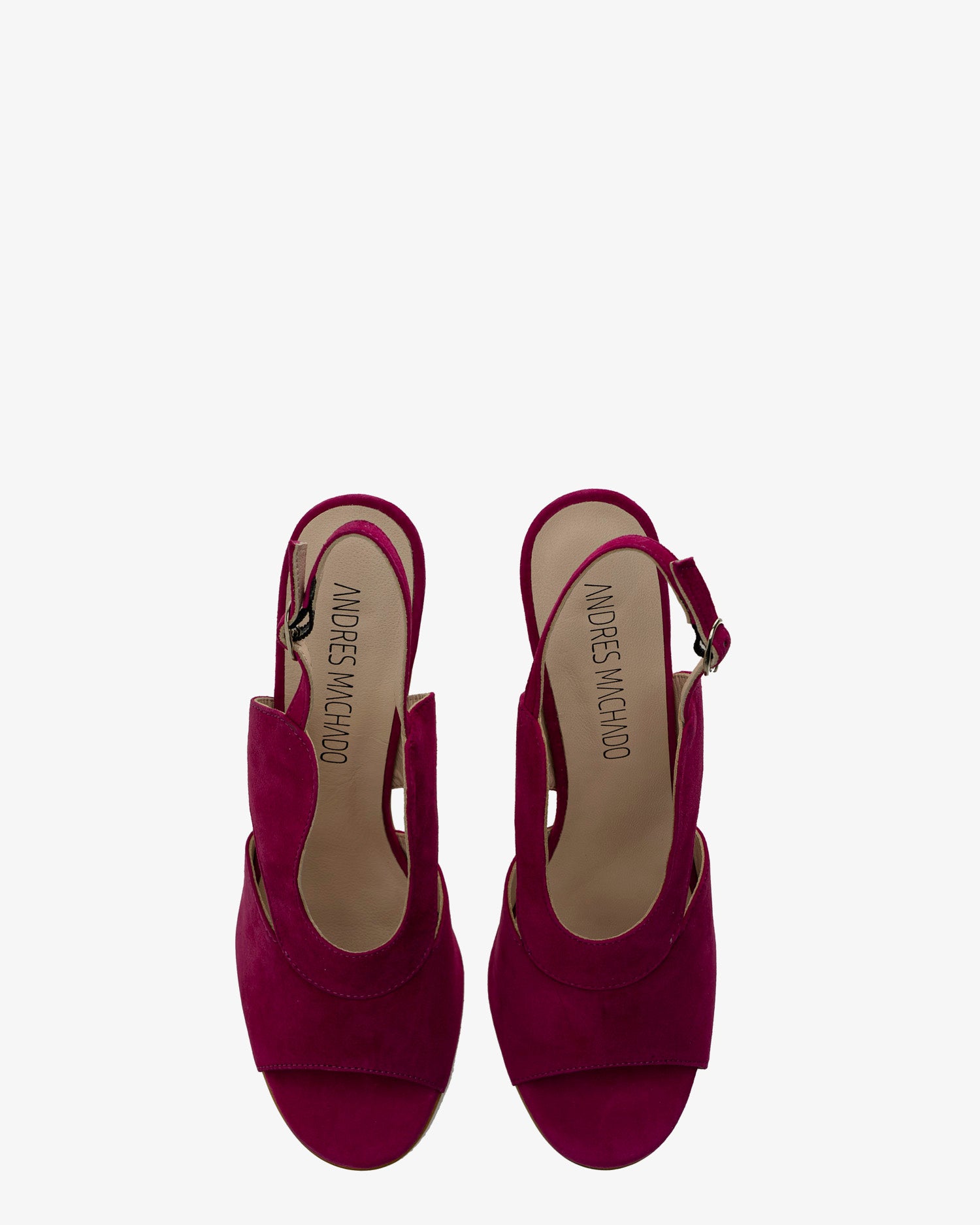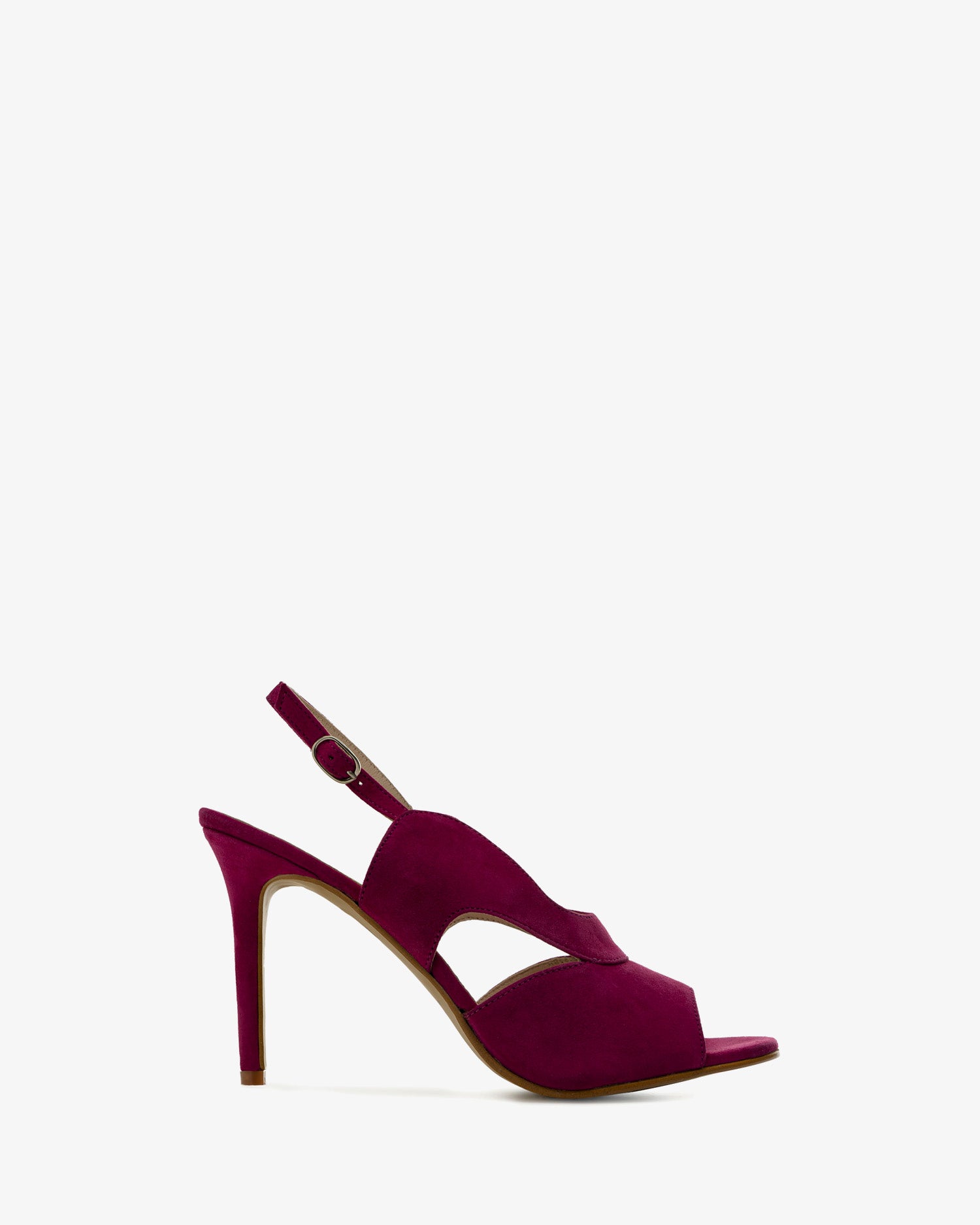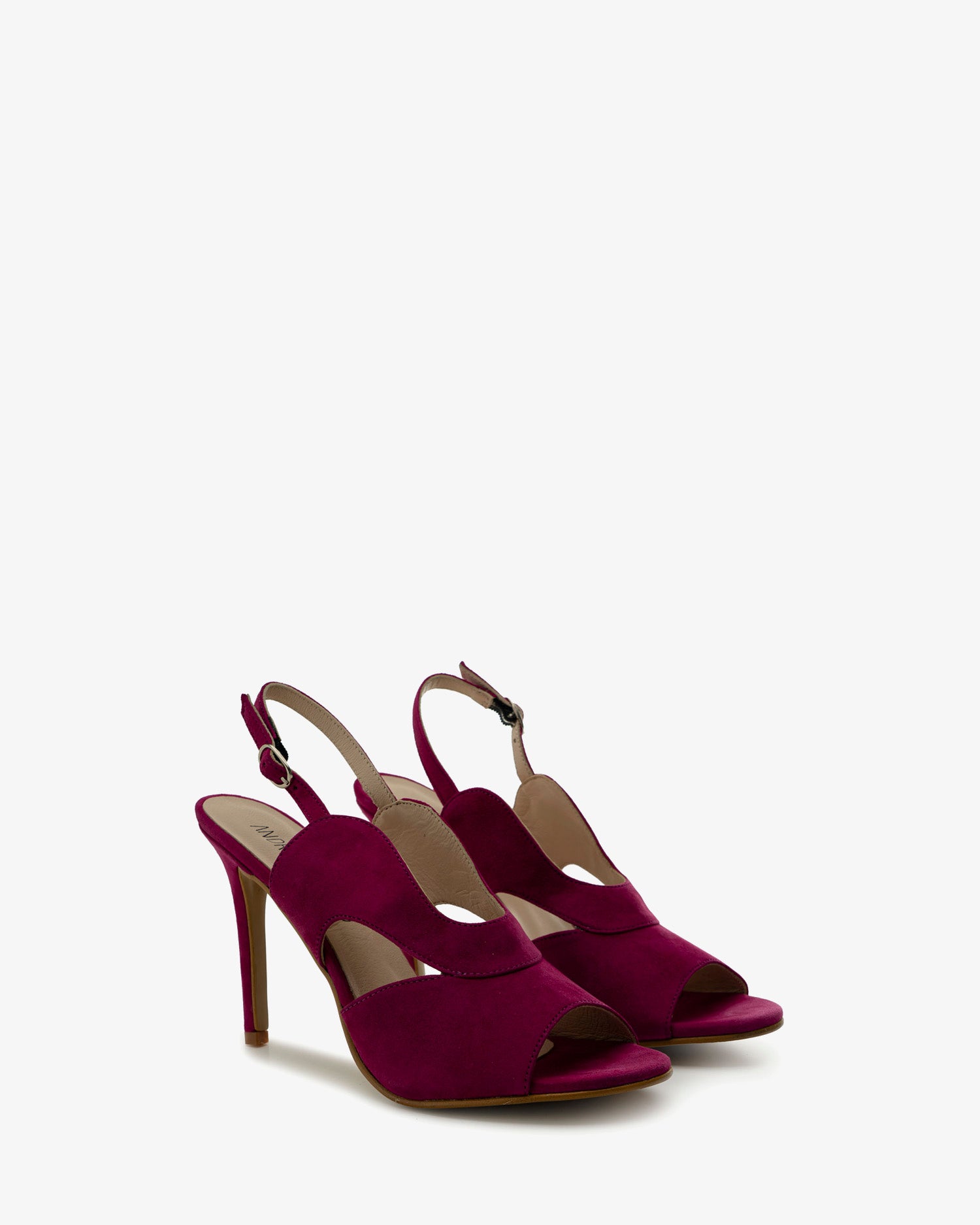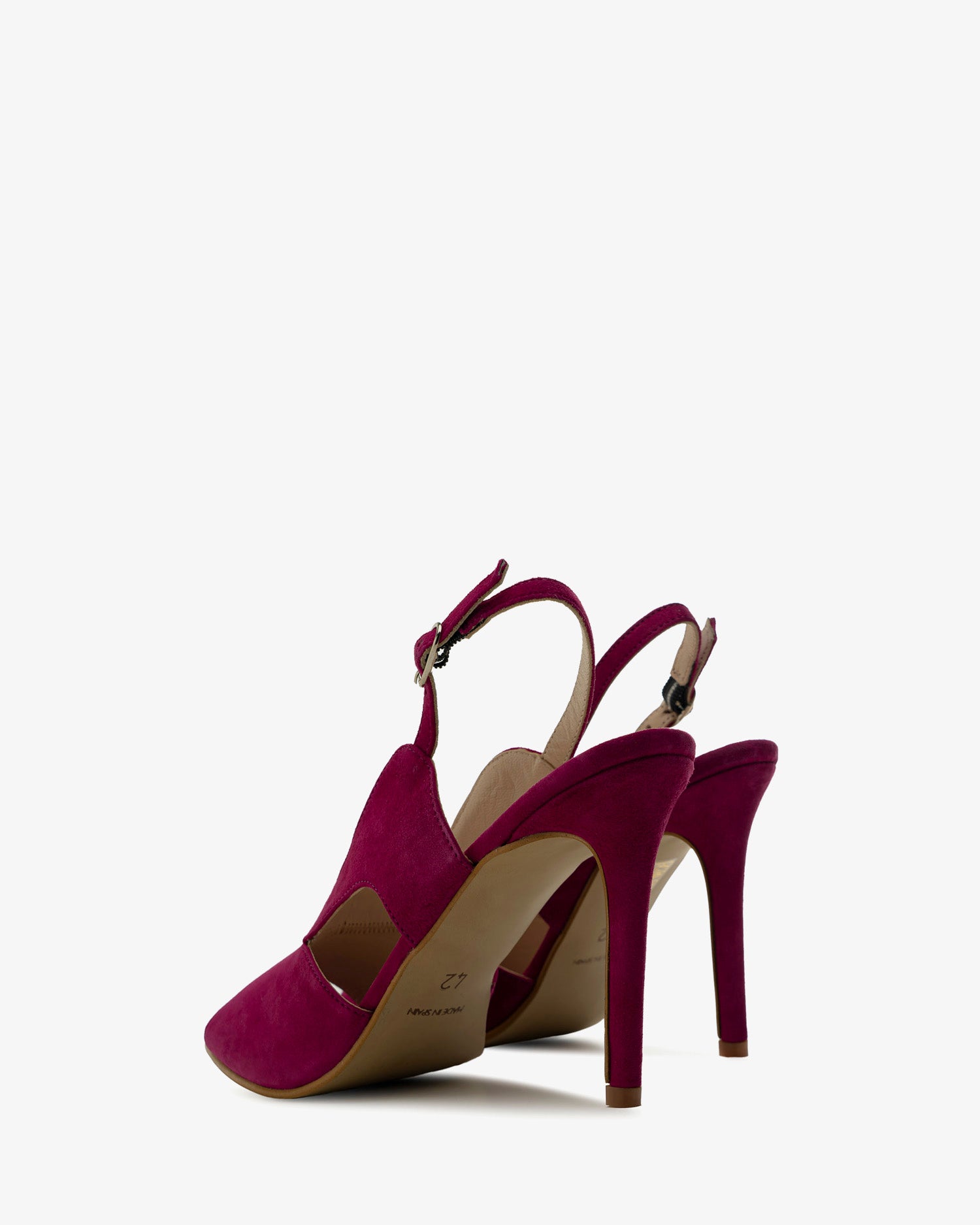 Slingback sandals made of Fuchsia Suede Leather. Wavy wide band around the instep. Back strap with slingback buckle closure. Inner lining in leather. Toned-coloured stiletto heel of 4.13" / 10.5 cm for Small sizes from UK 0.5 to 2.5 / EU 32 to 35. Toned-coloured stiletto heel of 4.53" / 11.5 cm for Big sizes from UK 8 to 10.5 / EU 42 to 45. Made in Spain.