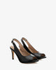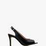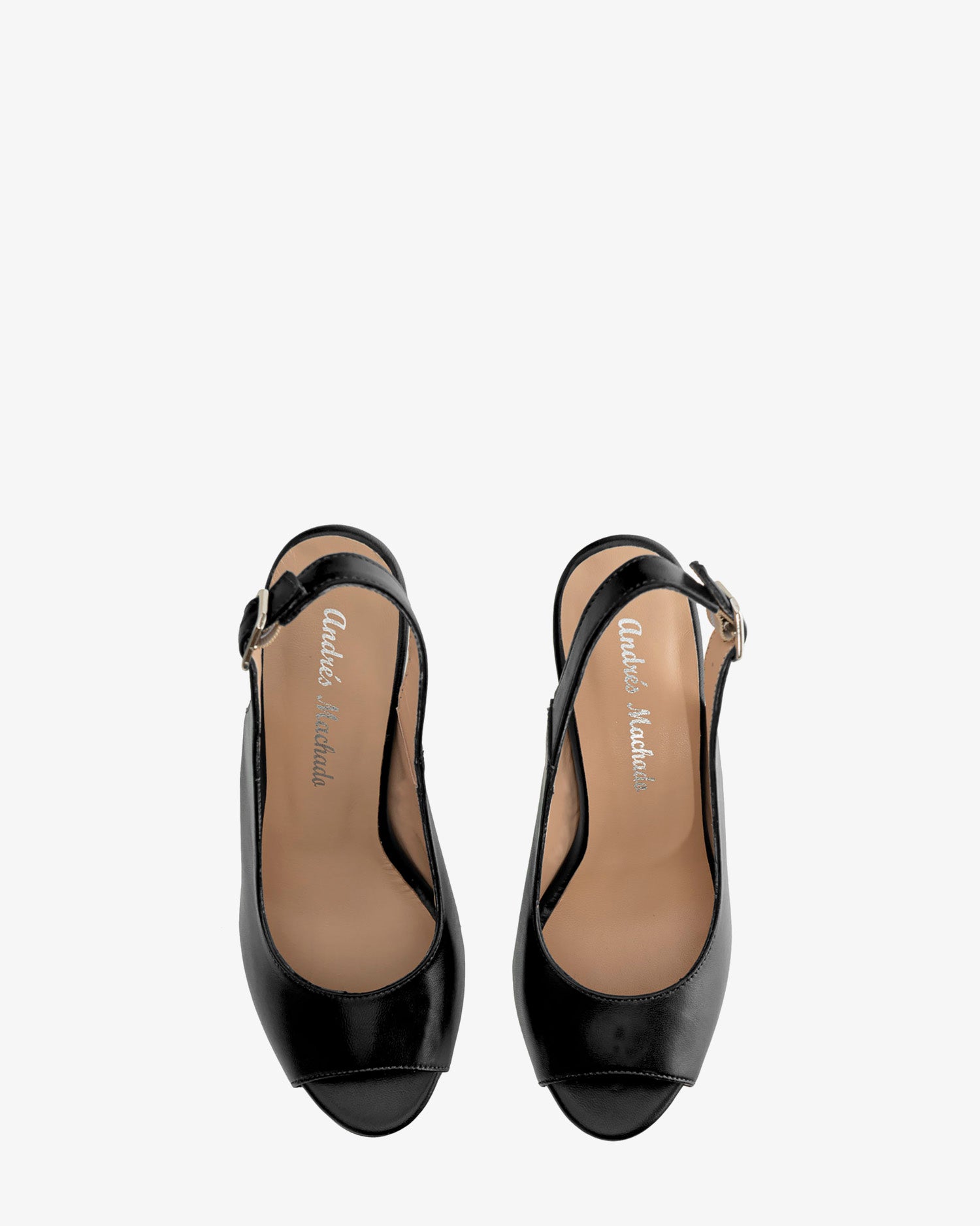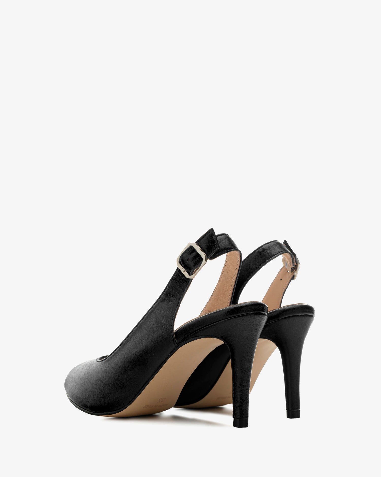 Slingback shoes made in black leather. Open toe. Slingback metallic buckle closure. Inner lining in natural leather. Matching stiletto heel of 3,35" / 8.5 cm for Small sizes from UK 0.5 to 2.5 / EU 32 to 35. Matching stiletto heel of 3.74" / 9.5 cm for Big sizes from UK 8 to 10.5 / EU 42 to 45. Made in Spain.