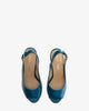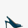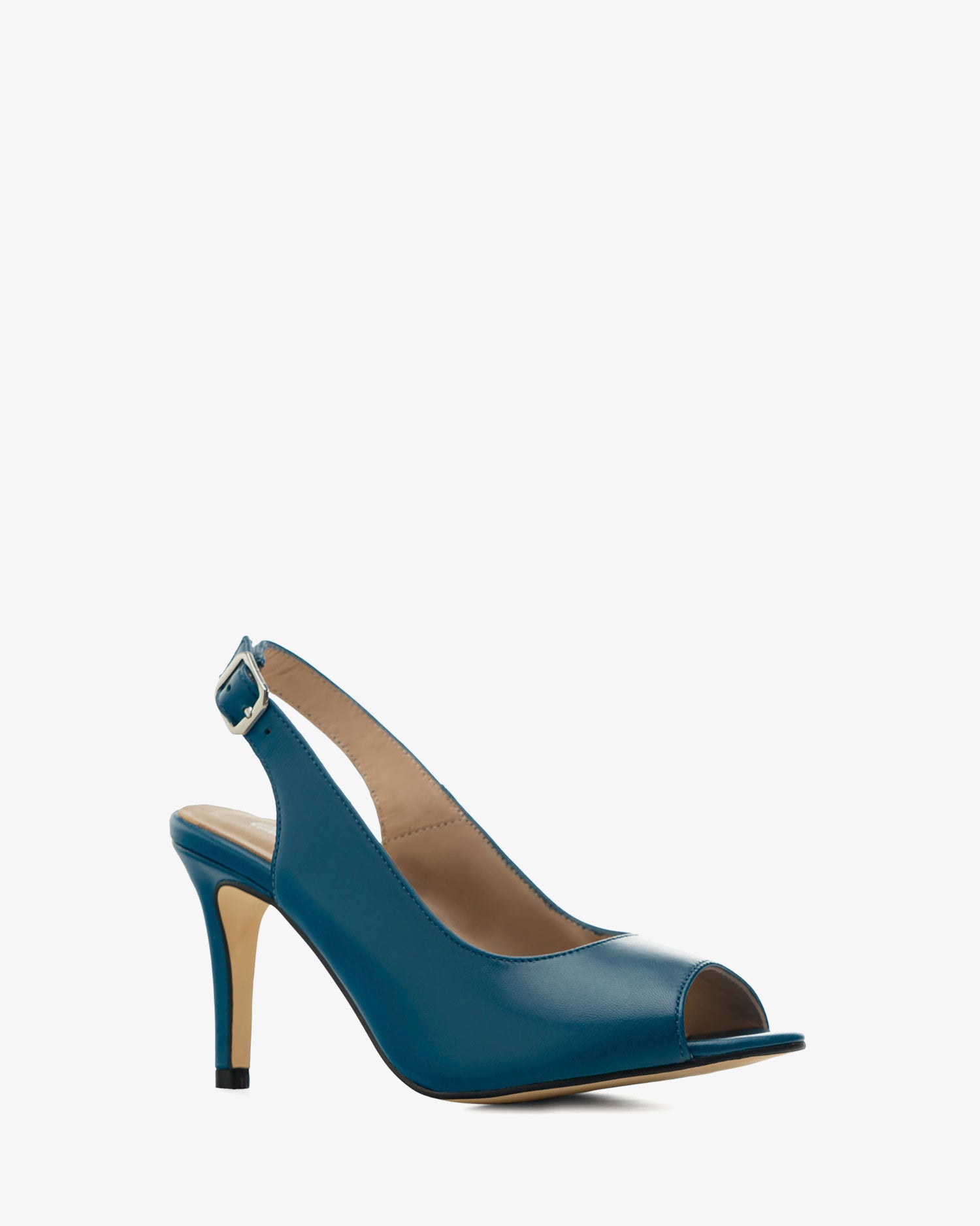 Slingback shoes made in blue leather. Open toe. Slingback metallic buckle closure. Inner lining in natural leather. Matching stiletto heel of 3,35" / 8.5 cm for Small sizes from UK 0.5 to 2.5 / EU 32 to 35. Matching stiletto heel of 3.74" / 9.5 cm for Big sizes from UK 8 to 10.5 / EU 42 to 45. Made in Spain.