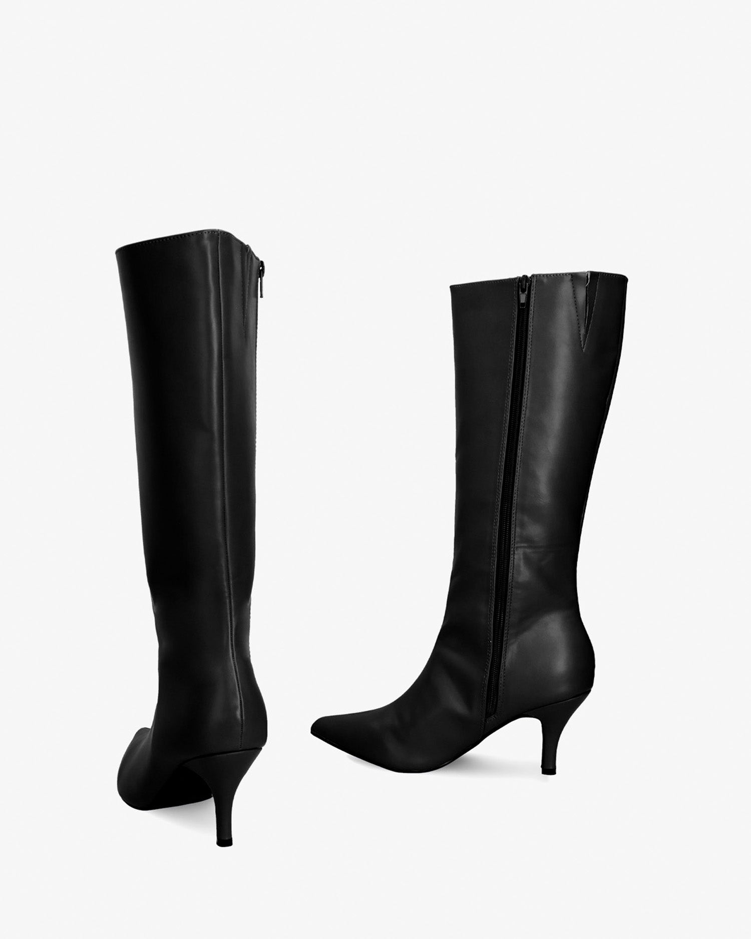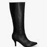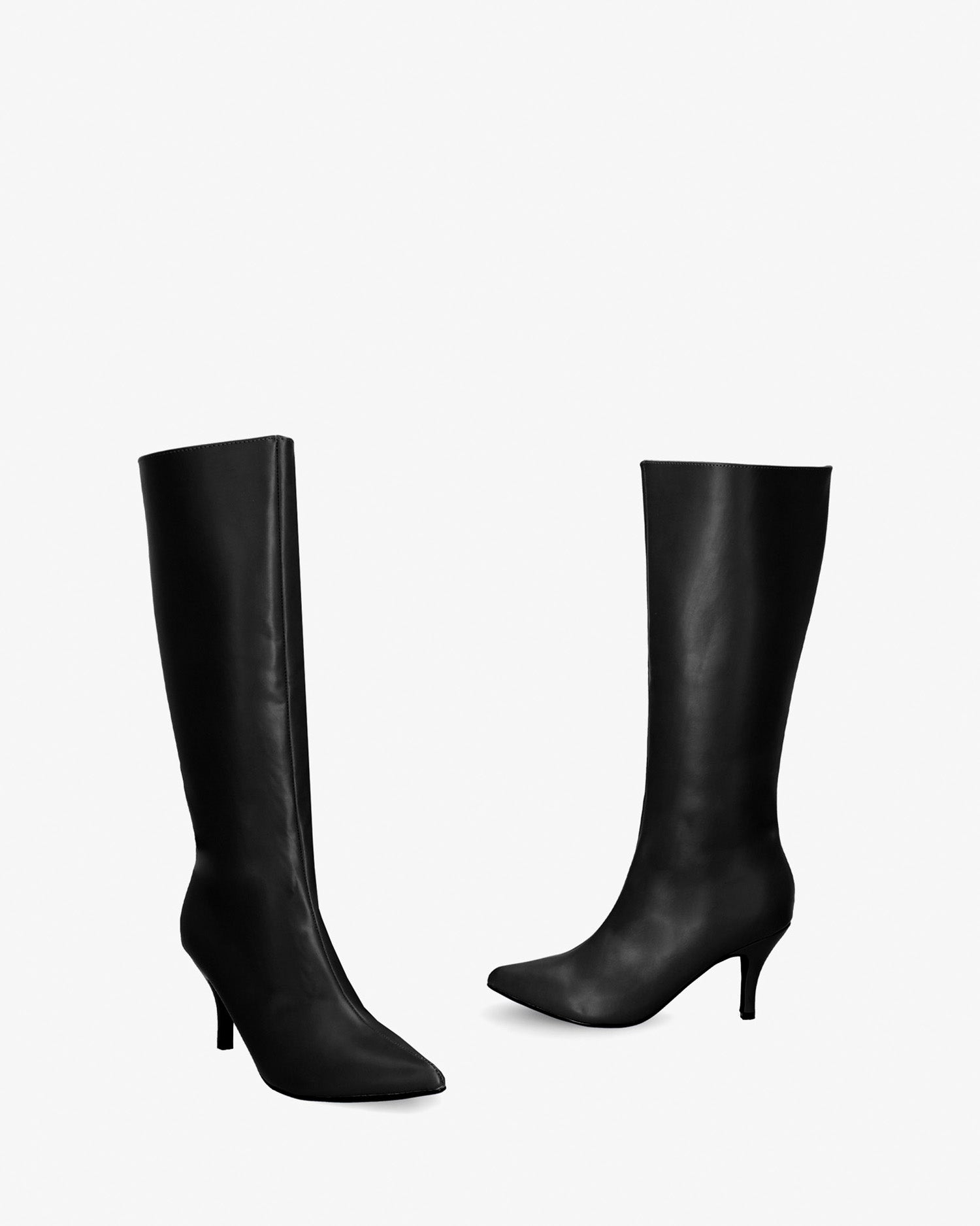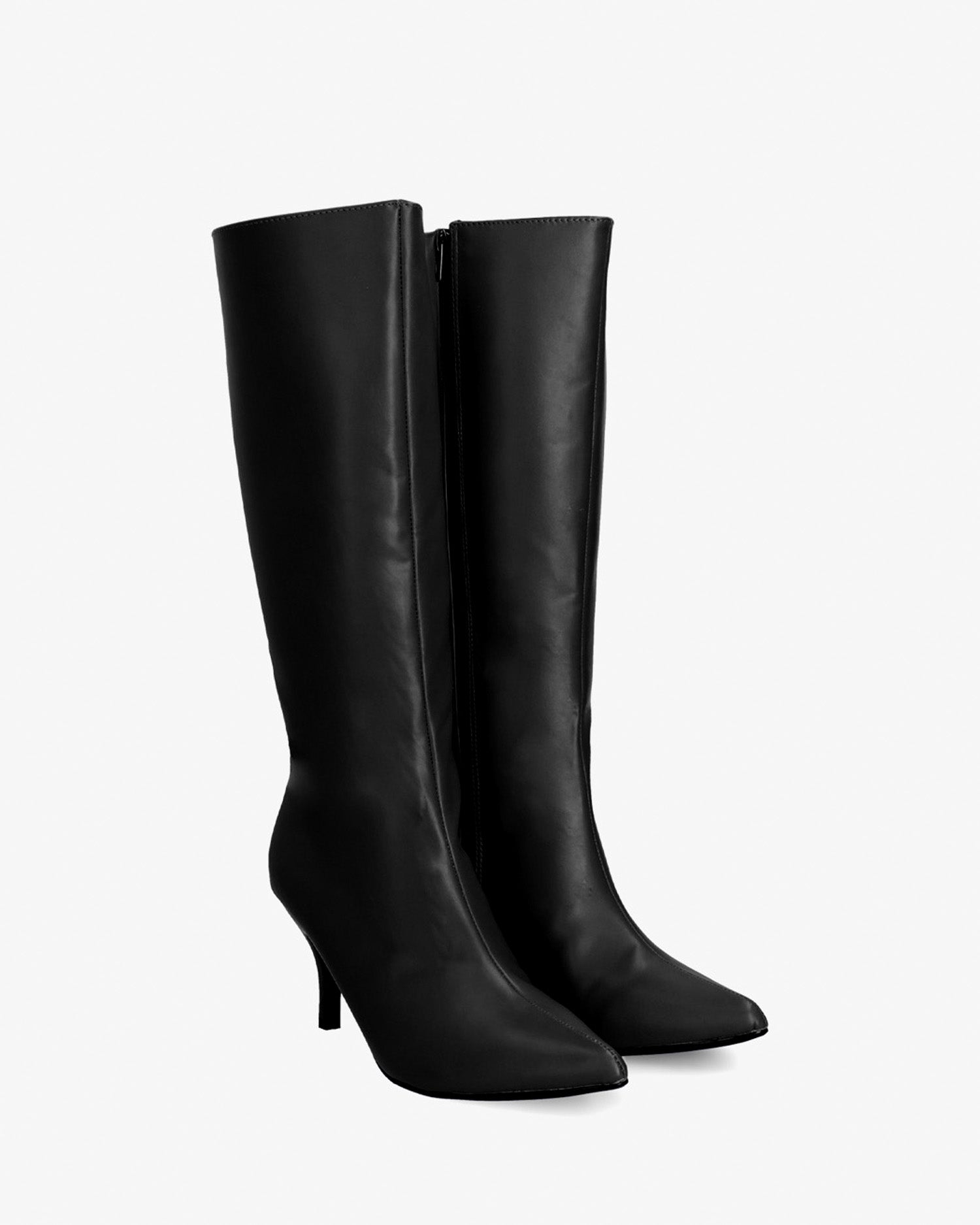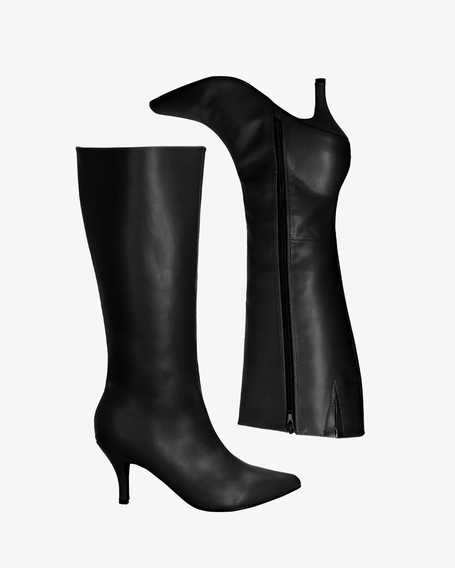 Smooth boots in black colored faux leather. Decorative stitching from the tip of the toe box up to the upper edge of the shaft. Matching zipper closure on the internal side of the shaft. Matching elastic on the upper edge. Finished in a pointed toe. The thin heel is 6.5 cm / 2.55`` high for small sizes from 32 to 35 EU and 8 cm / 3.14`` high for large sizes from 42 to 45 EU. This model fits small, we recommend taking one size larger than usual.