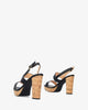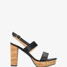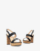 Sandals in black soft color with high and wide cork heel and platform. Open-back design with two wide straps on the front and on the instep in the same tone. Finished with an open and slim toe. Metallic buckle closure with a back strap. Heel height of 4,13" and platform height of 0,98" for small sizes from 32 to 35. Heel height of 4,92" and platform height of 1,18" for large sizes from 42 to 45.