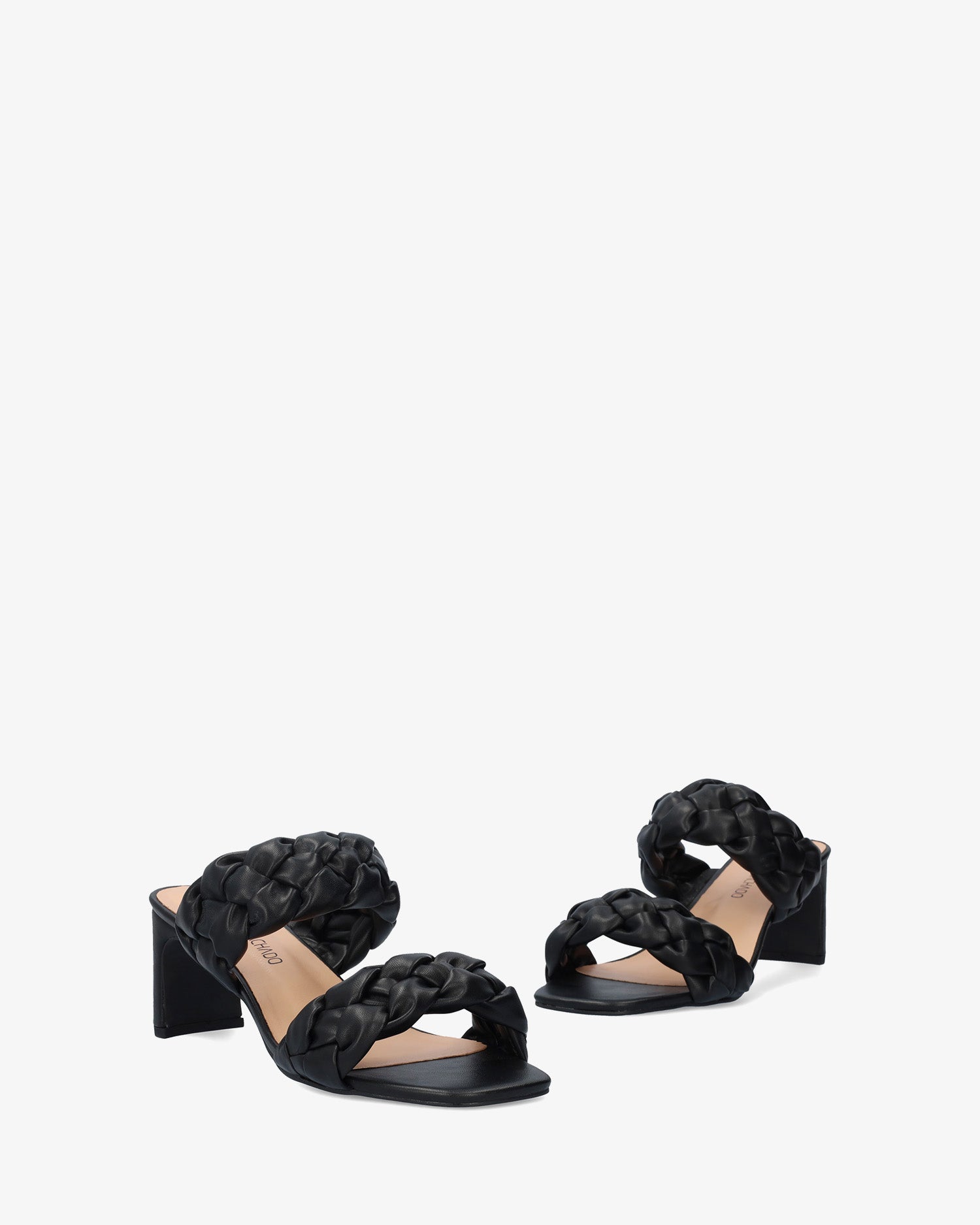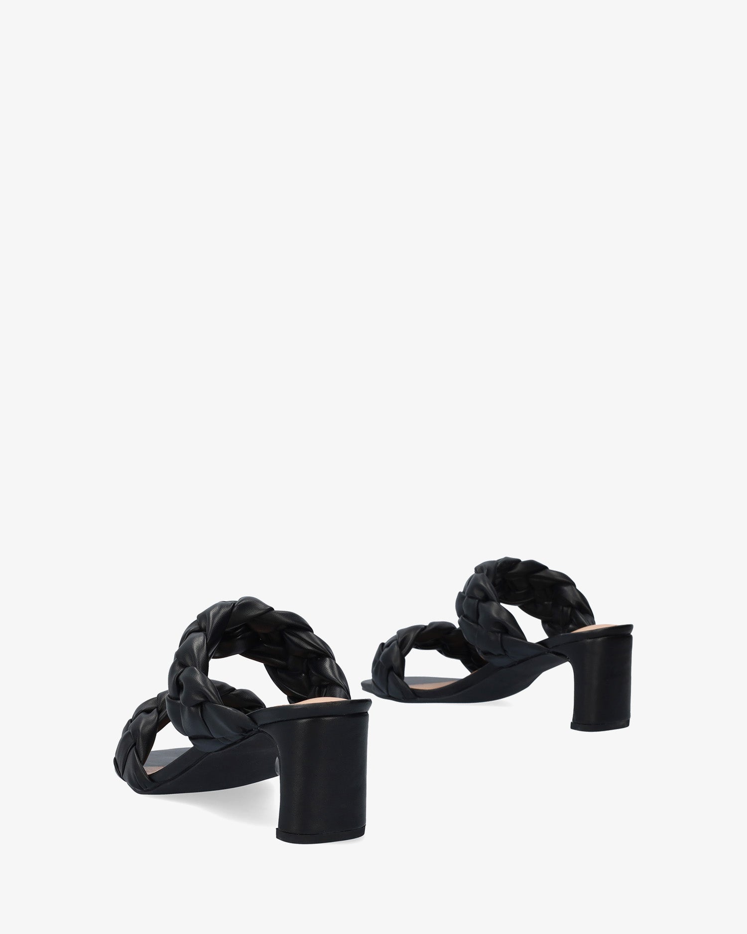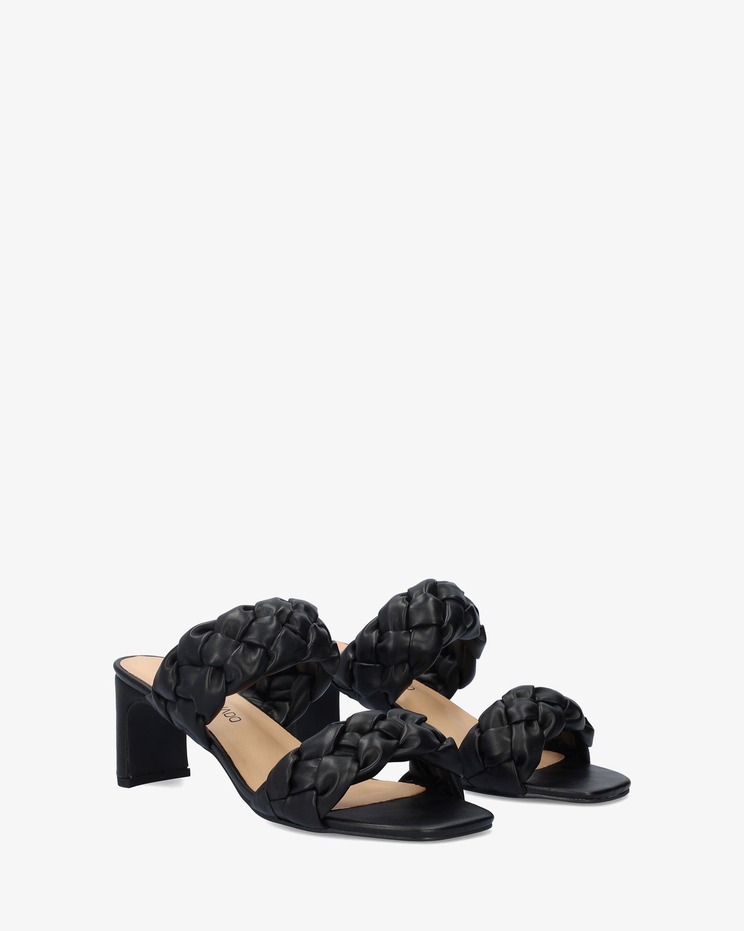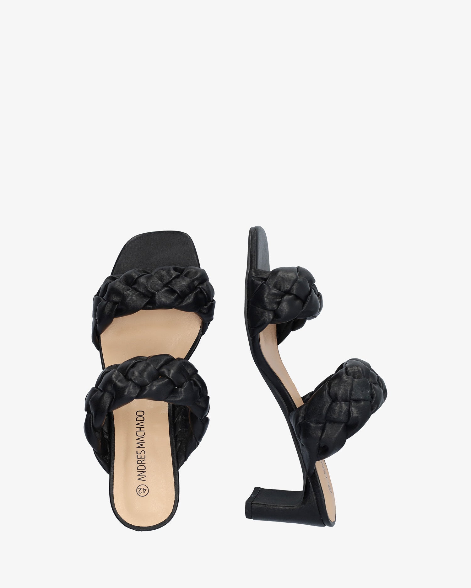 Soft black mule with a thin block heel. The design features an open squared toe with two wide braided straps over the instep and the toe. The heel height for small sizes from 32 to 35 is 2,95" and for large sizes from 42 to 45 is 3,15".