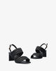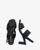 Soft black mule with a thin block heel. The design features a squared open toe with two wide stitched straps over the instep and the toe. The heel height for small sizes from 32 to 35 is 2,95" and for large sizes from 42 to 45 is 3,15".