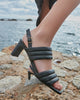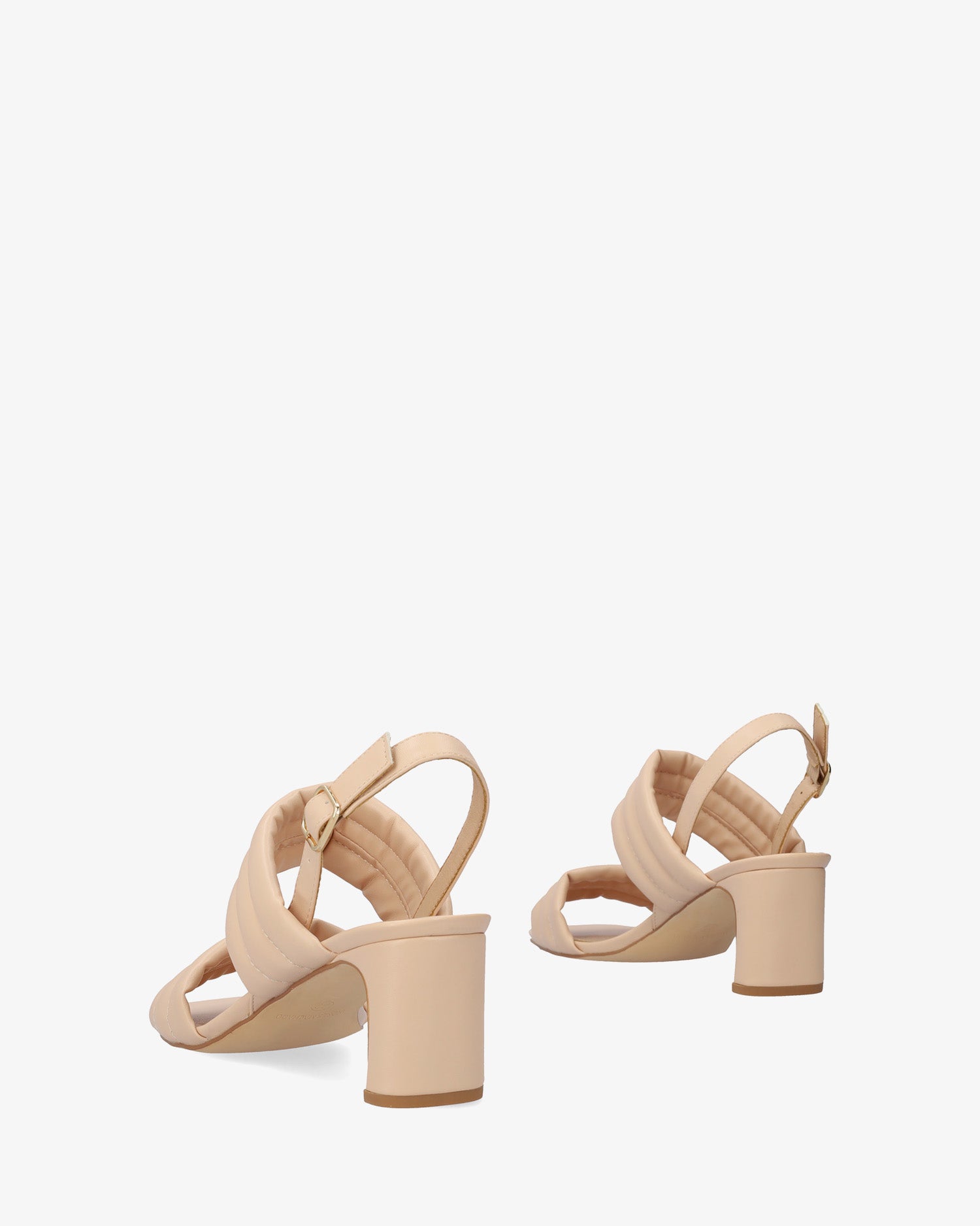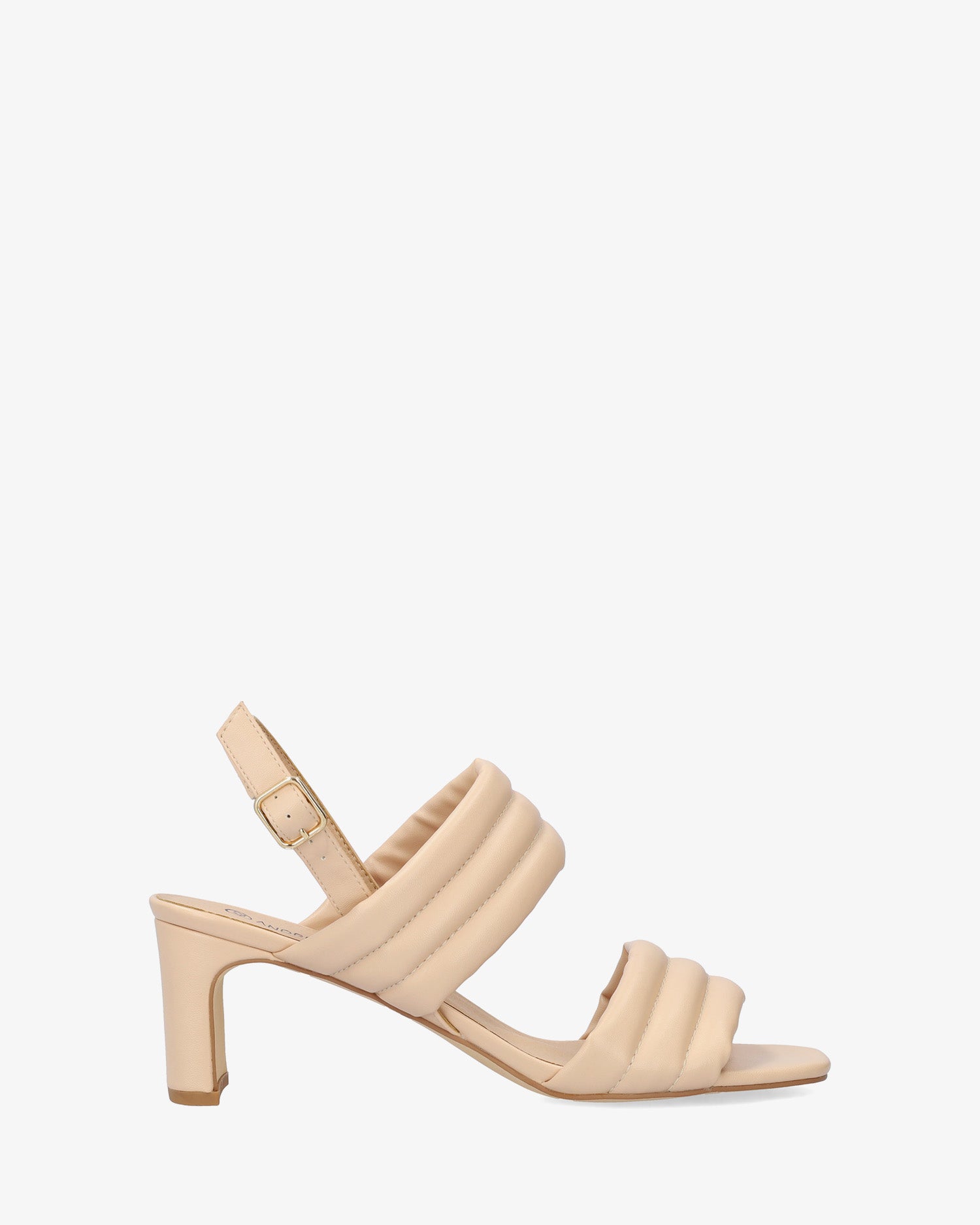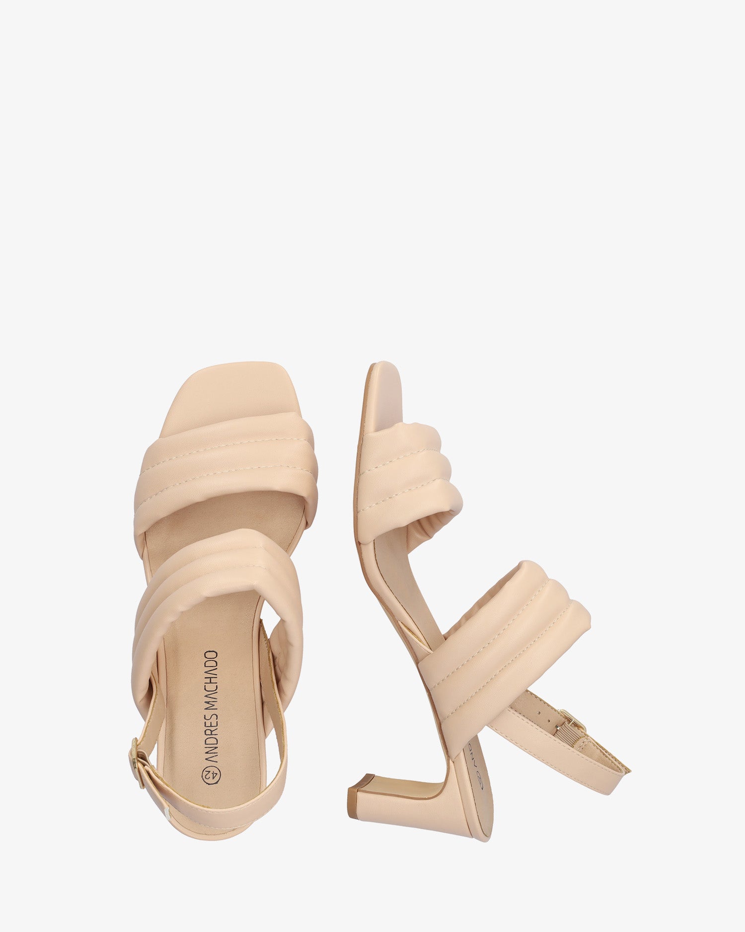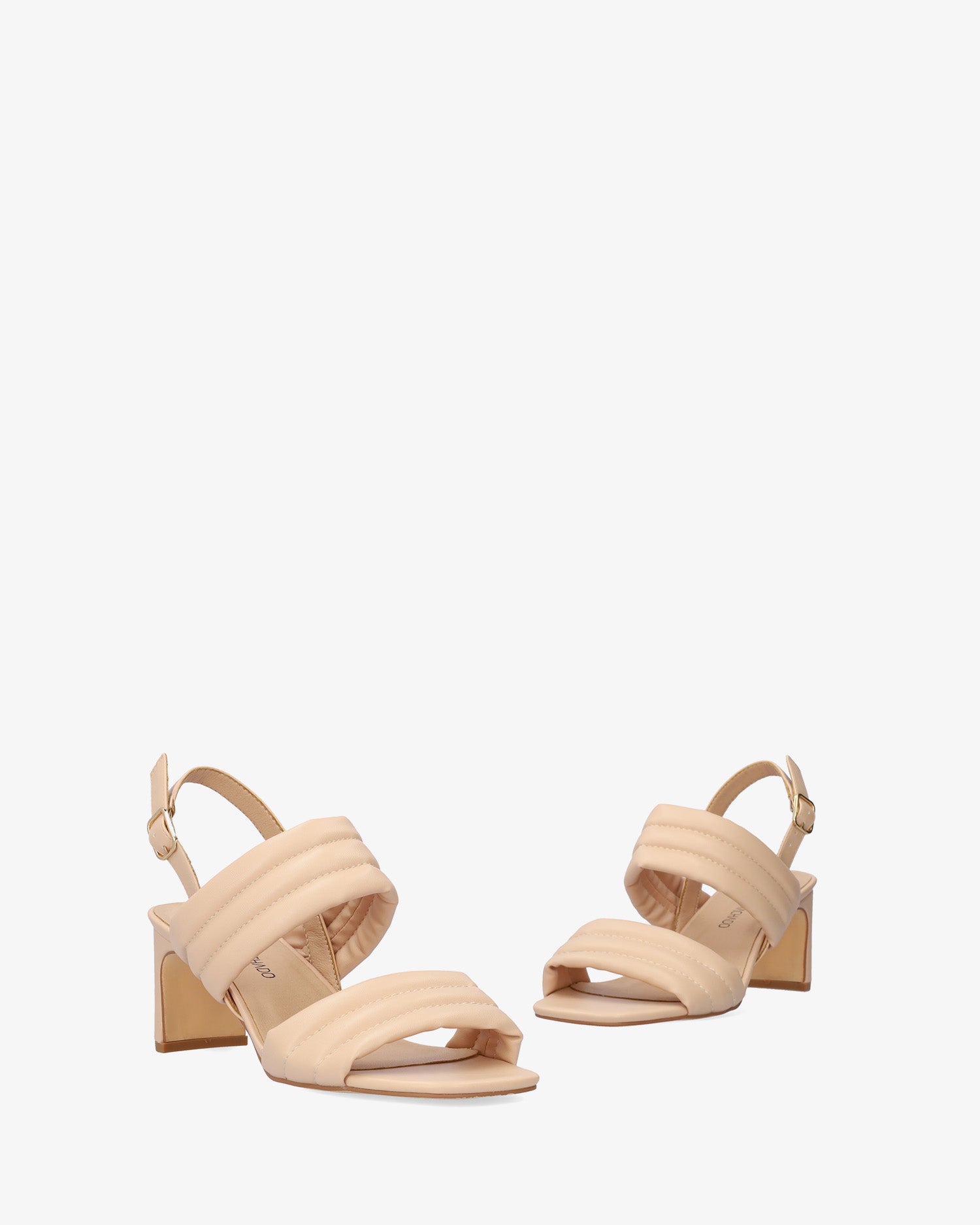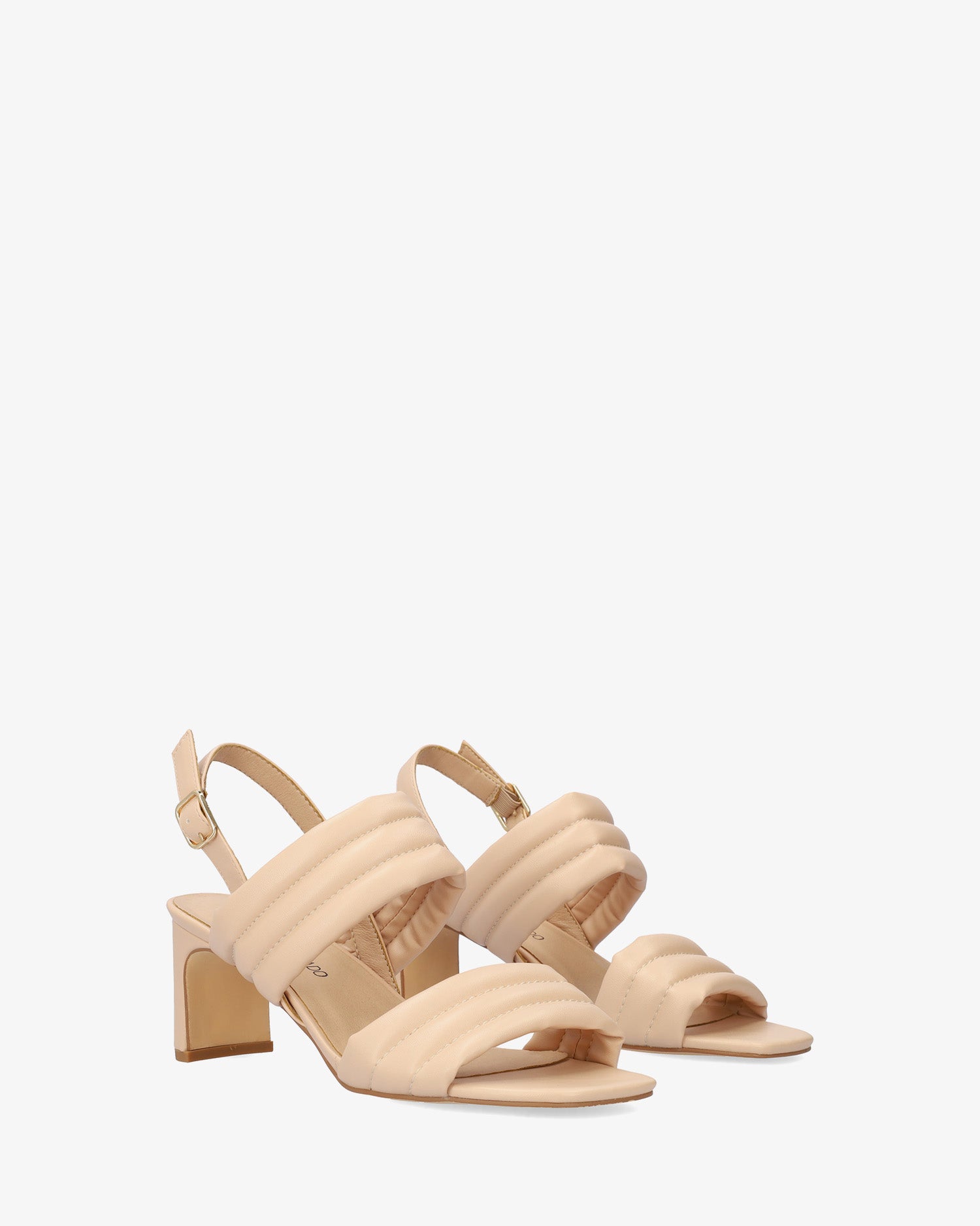Soft silver mule with a thin block heel. The design features a squared open toe with two wide stitched straps over the instep and the toe. The heel height for small sizes from 32 to 35 is 2,95" and for large sizes from 42 to 45 is 3,15".