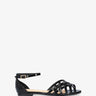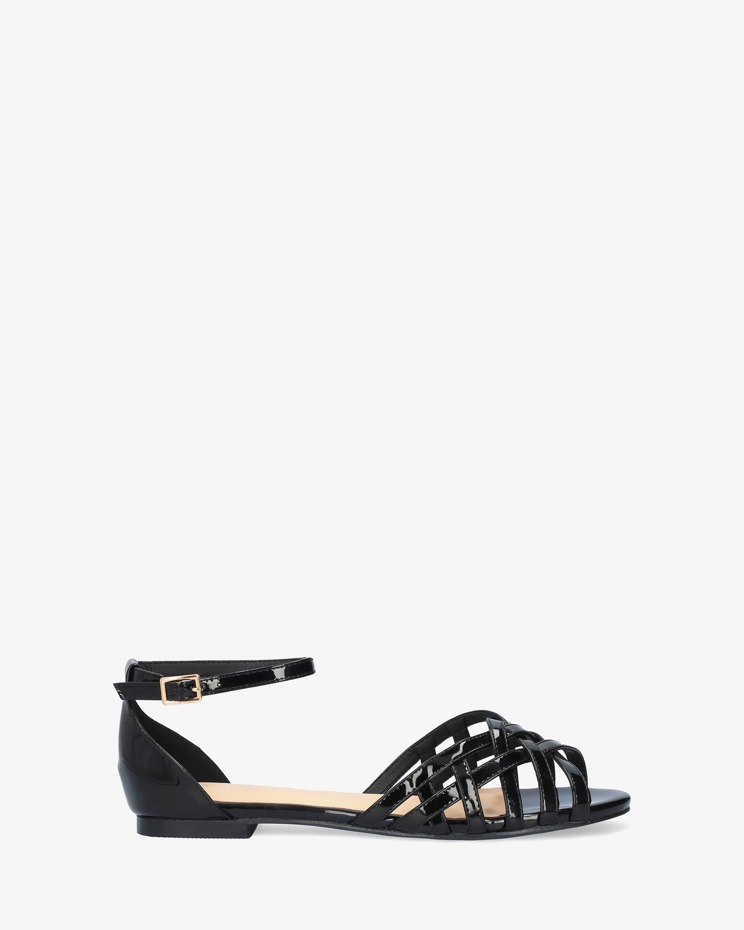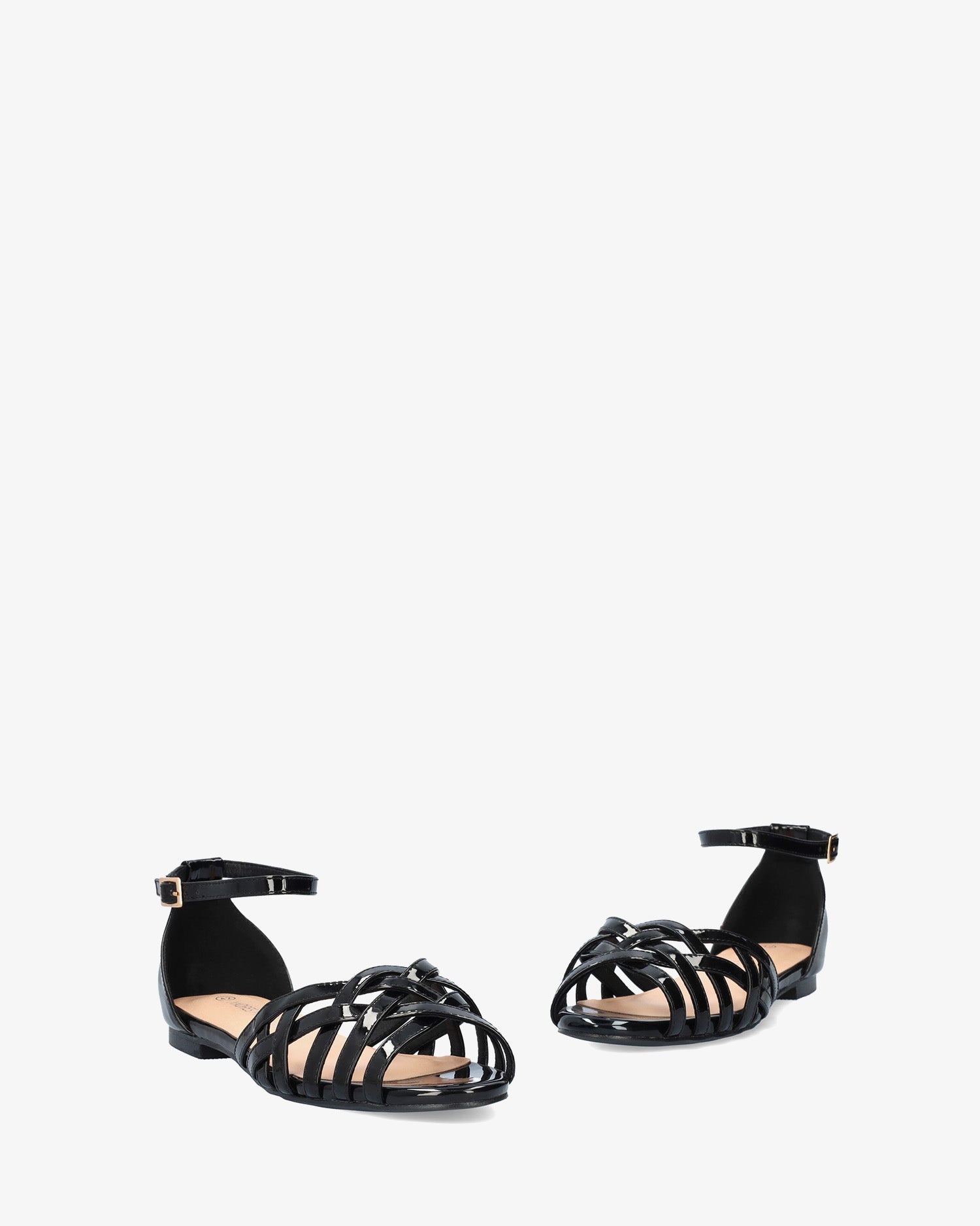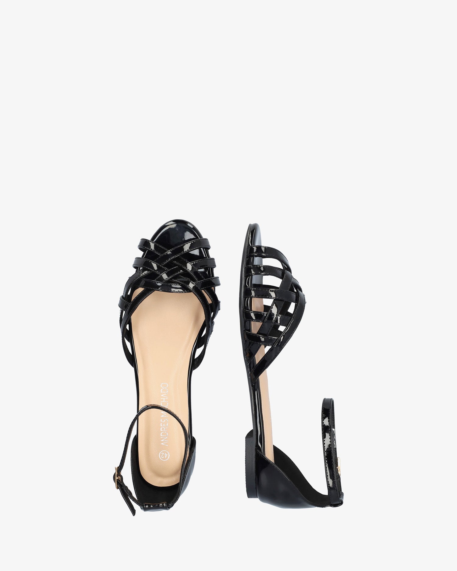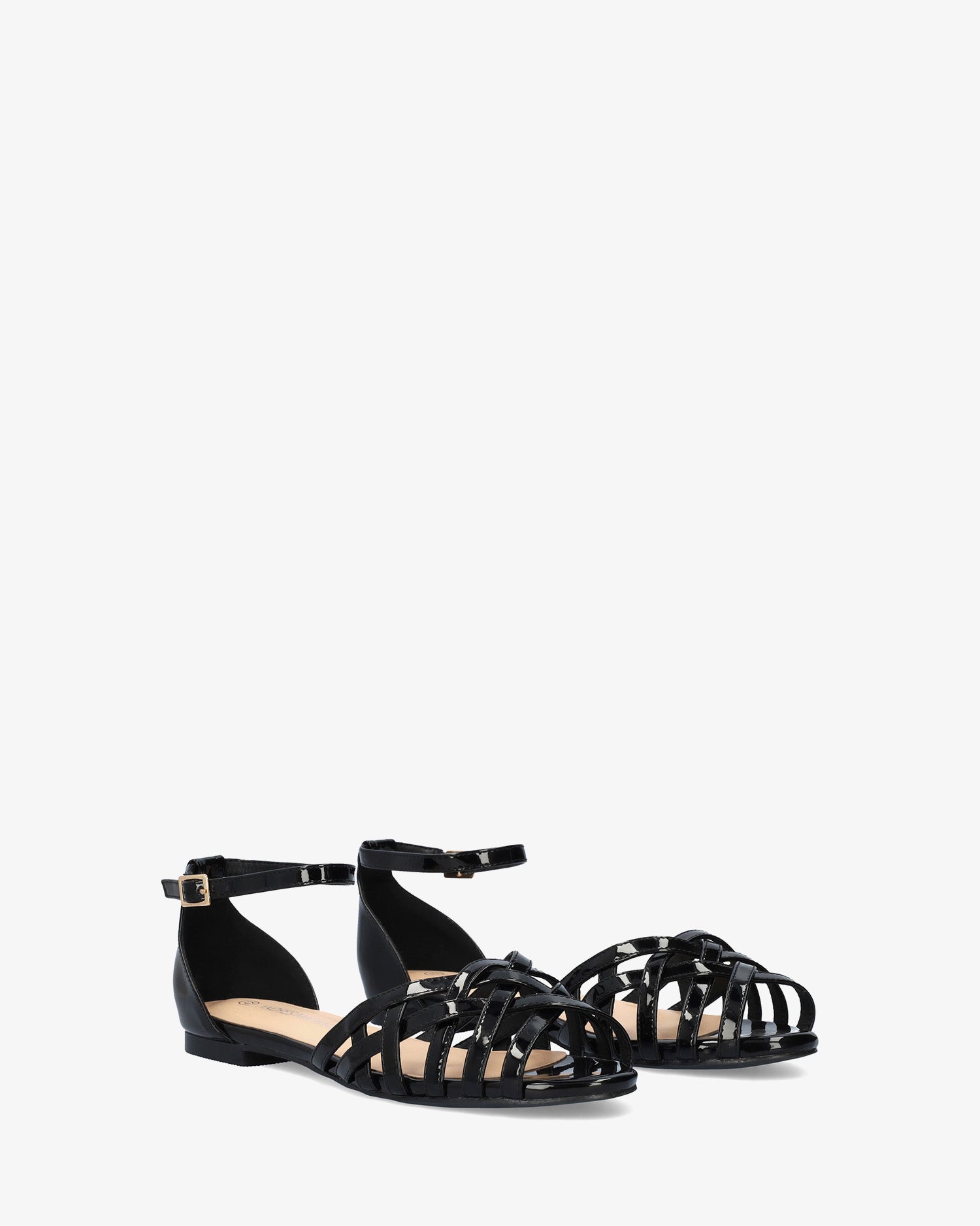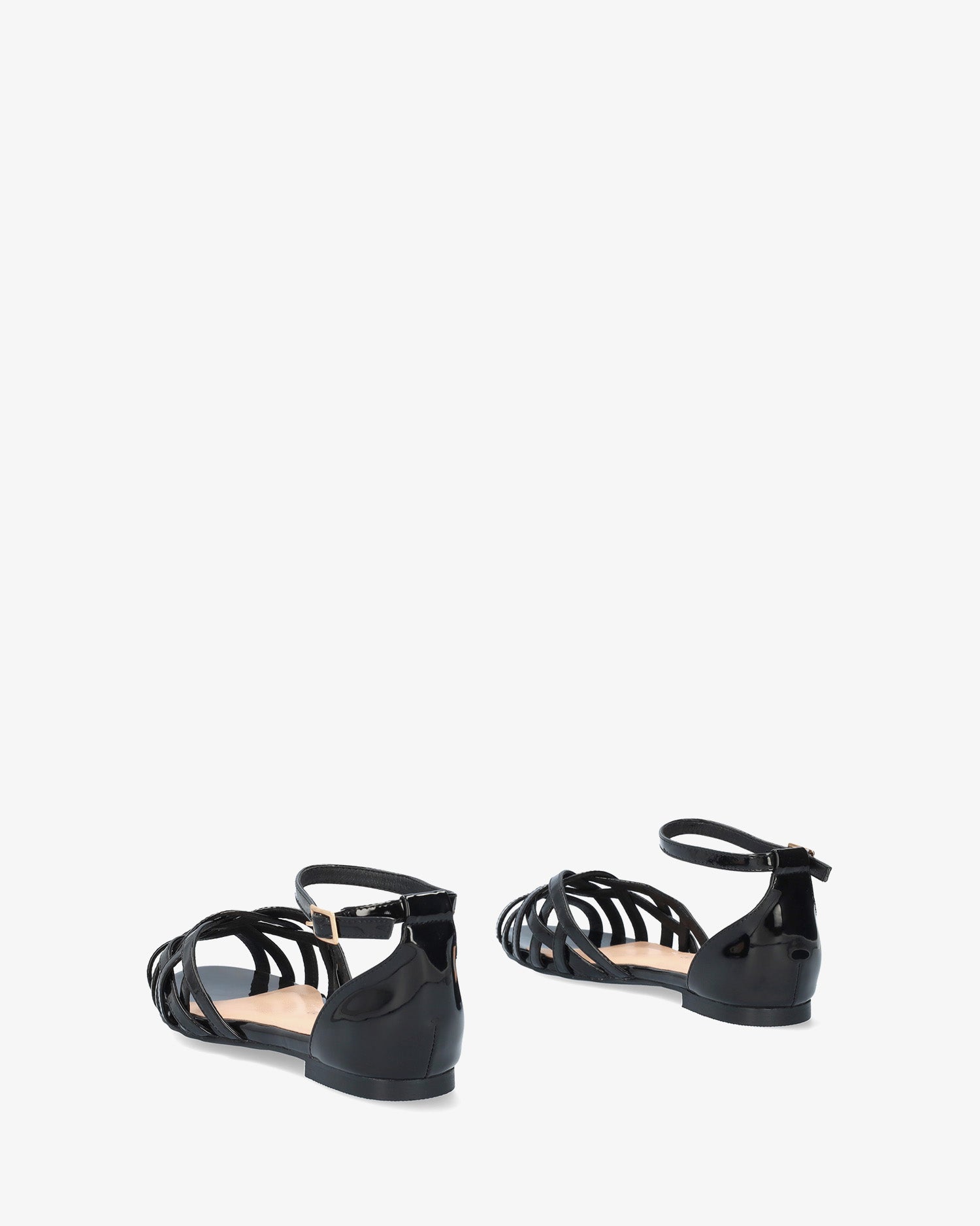 Soft patent black flat sandals. The design features a closed flat heel and an open rounded toe with multi fine mixed straps. Matching buckled strap around the ankle. Large sizes from 42 to 45.