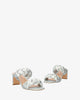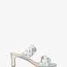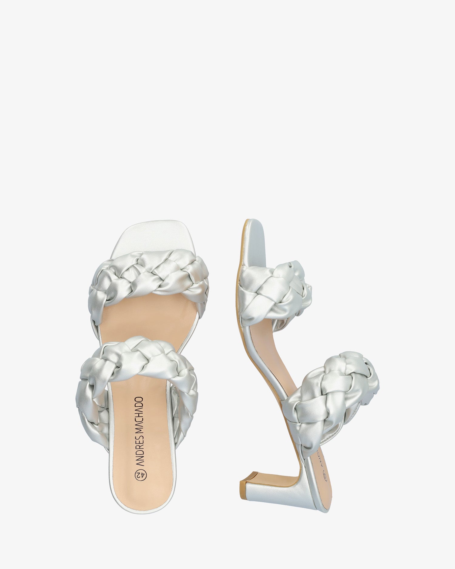 Soft silver mule with a thin block heel. The design features an open squared toe with two wide braided straps over the instep and the toe. The heel height for small sizes from 32 to 35 is 2,95" and for large sizes from 42 to 45 is 3,15".