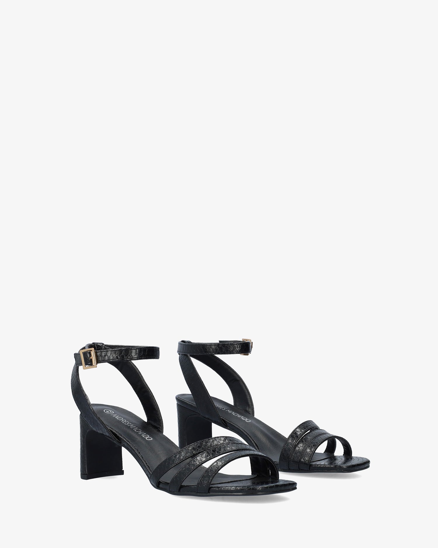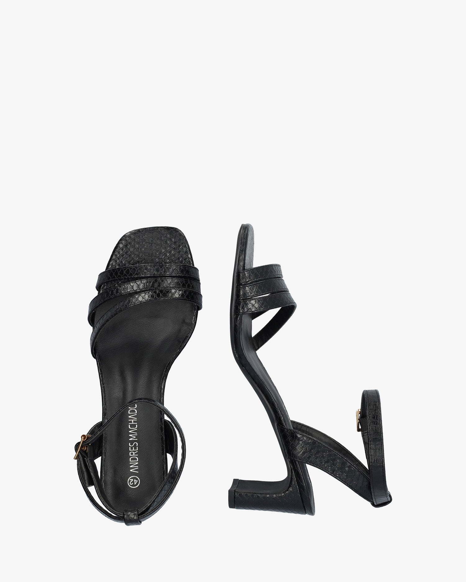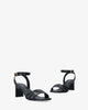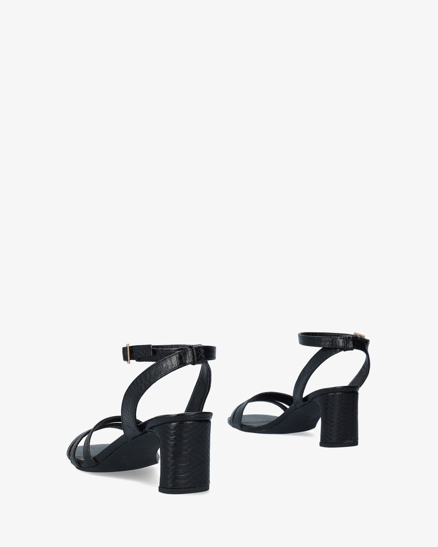 Soft Snake black coloured sandals with a thin block heel. The design features fine separate merged straps, with a squared open toe. Metal buckle fastening with ankle strap. Heel height 2,95" for small sizes 32 to 35. 3,15" heel for large sizes 42 to 45.