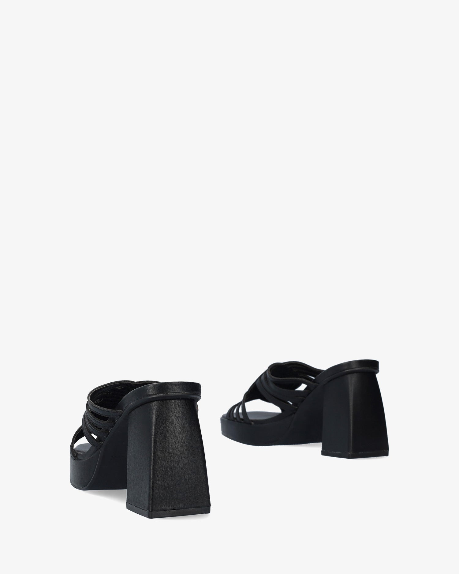 Mule in black suede-like material with a wide square heel and platform. Open-back design with multiple thin intertwined straps on the instep. Square and open toe. Heel height of 4,13" and platform height of 0,98" for small sizes from 32 to 35. Heel height of 4,33" and platform height of 0,98" for large sizes from 42 to 45.