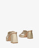 Mule in golden suede-like material with a wide square heel and platform. Open-back design with multiple thin intertwined straps on the instep. Square and open toe. Heel height of 4,13" and platform height of 0,98" for small sizes from 32 to 35. Heel height of 4,33" and platform height of 0,98" for large sizes from 42 to 45.