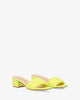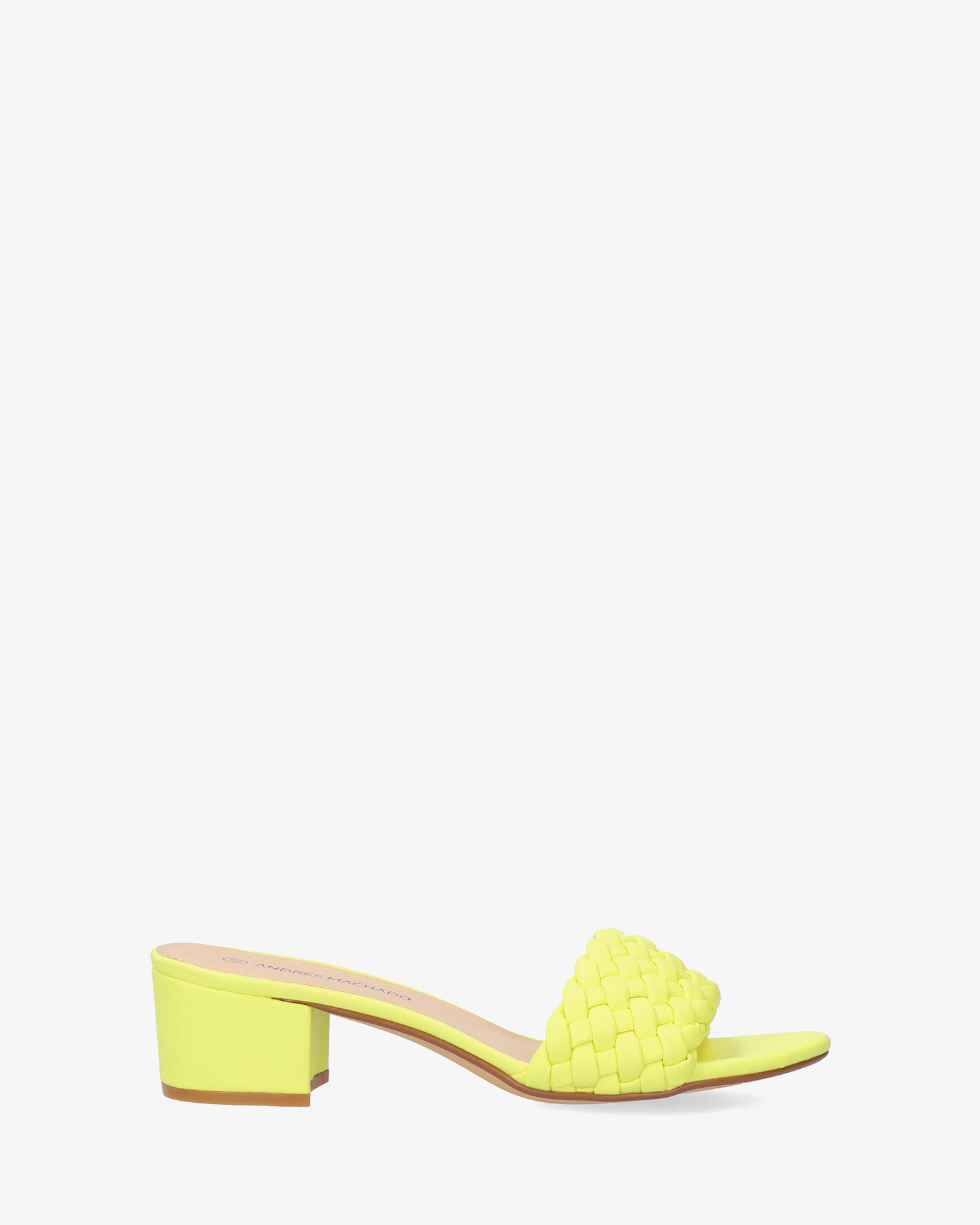 Squared heel mule in soft neon yellow material. The slingback design features a big braided strap on its rounded and open toe. The heel height for small sizes from 32 to 35 is 1,95" and for large sizes from 42 to 45 is 2,14".