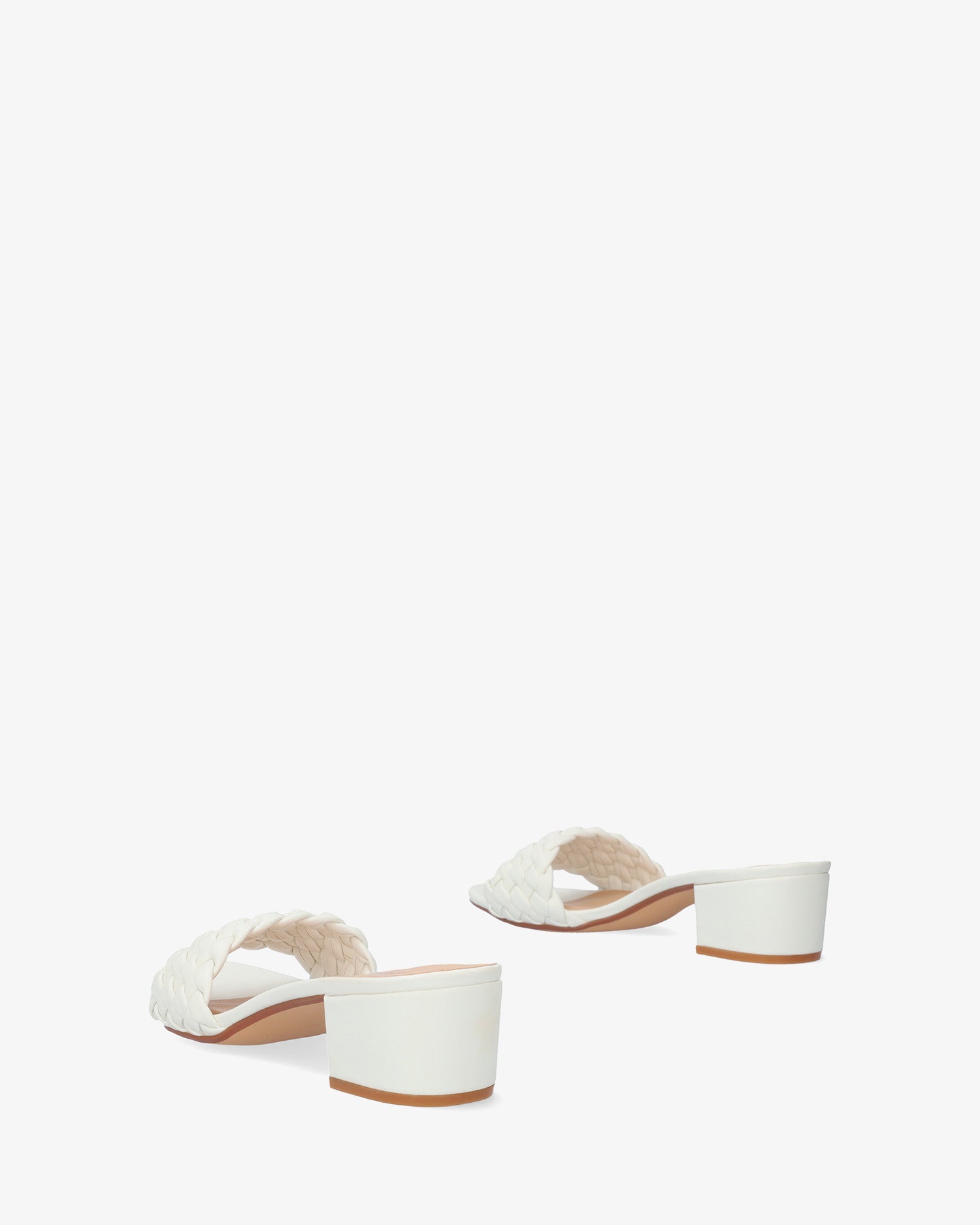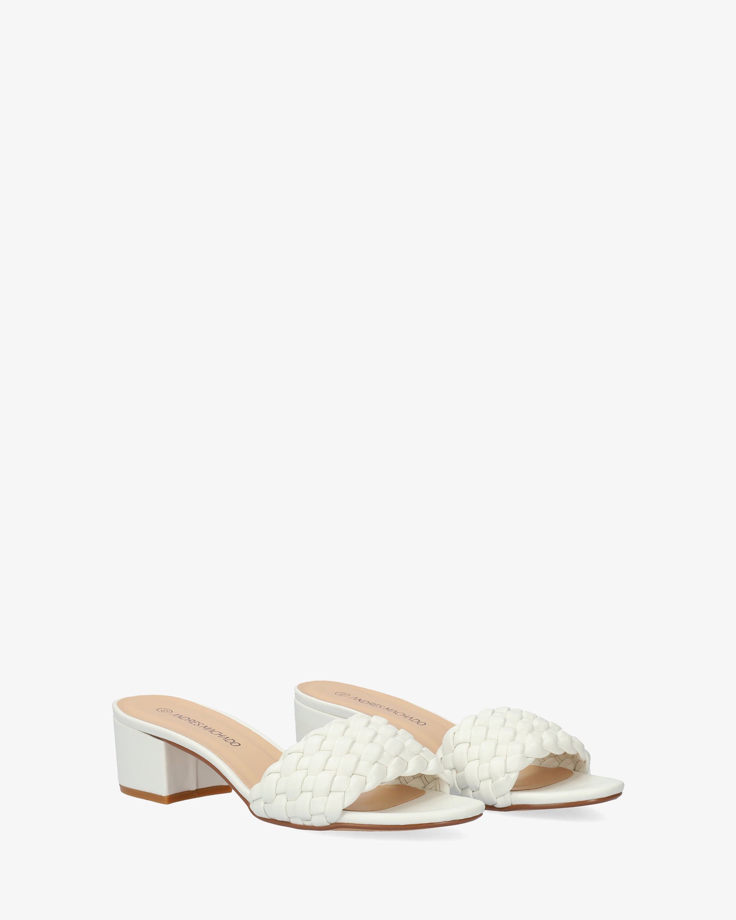 Squared heel mule in soft white material. The slingback design features a big braided strap on its rounded and open toe. The heel height for small sizes from 32 to 35 is 1,95" and for large sizes from 42 to 45 is 2,14".