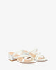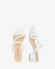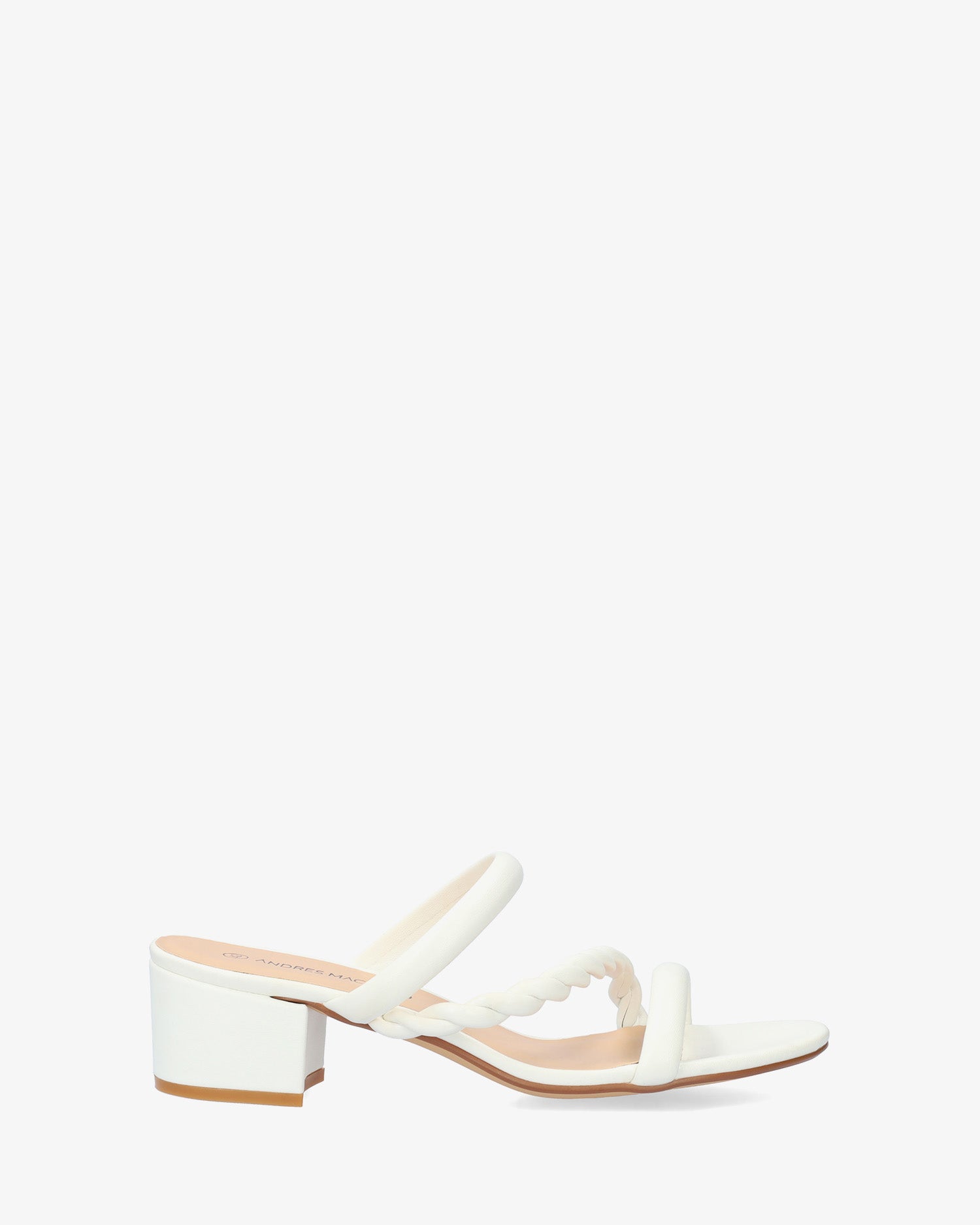 Squared heel mule in white soft material. The silgback design features three thick straps, one of them crossing over the instep with an open squared toe. The heel height for small sizes from 32 to 35 is 1,95" and for large sizes from 42 to 45 is 2,14" .