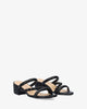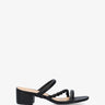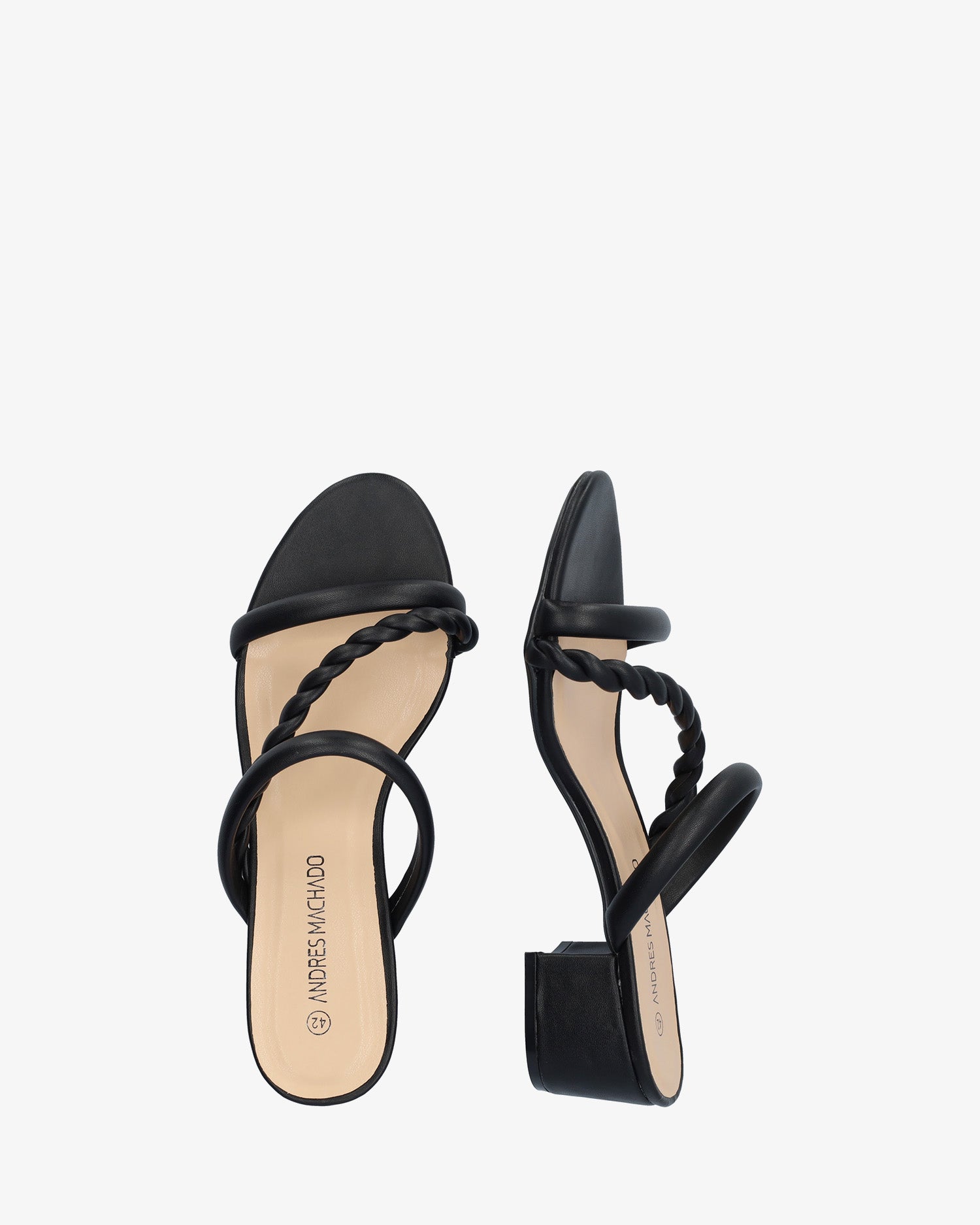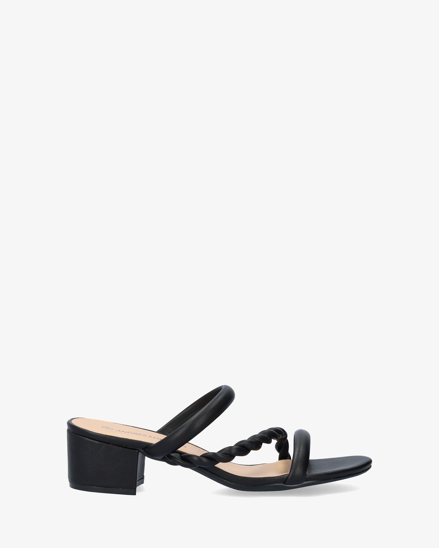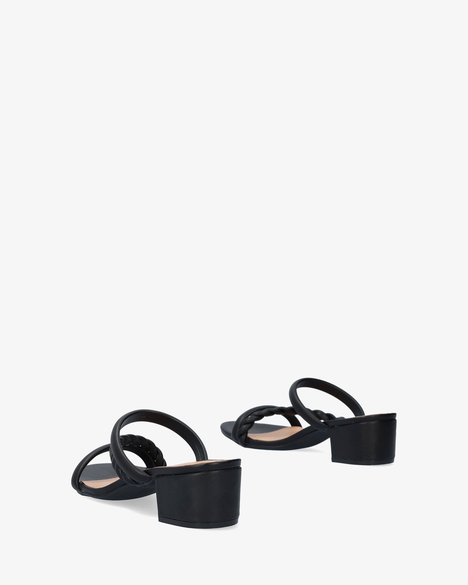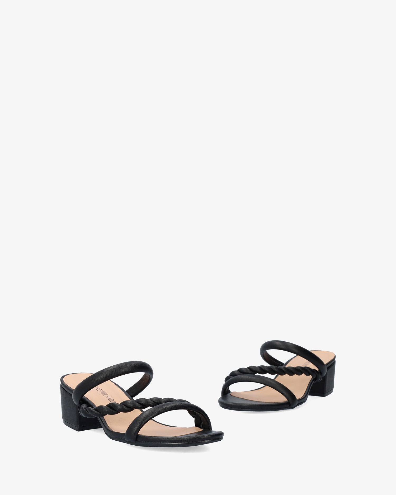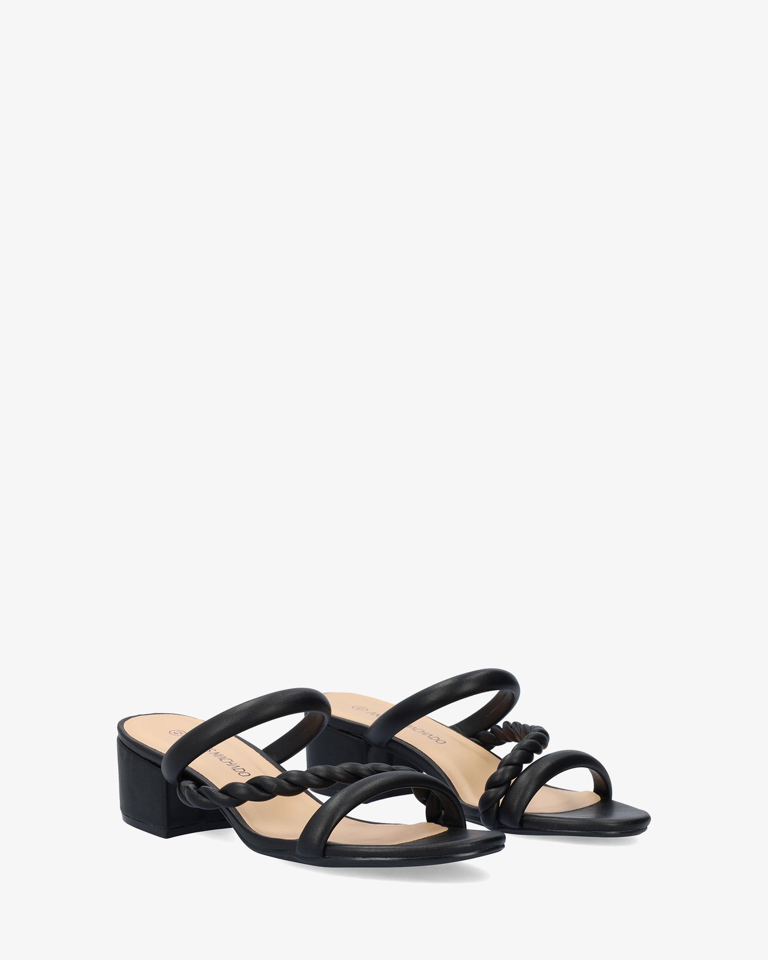Squared heel mule in black soft material. The silgback design features three thick straps, one of them crossing over the instep with an open squared toe. The heel height for small sizes from 32 to 35 is 1,95" and for large sizes from 42 to 45 is 2,14" .
