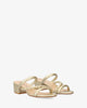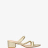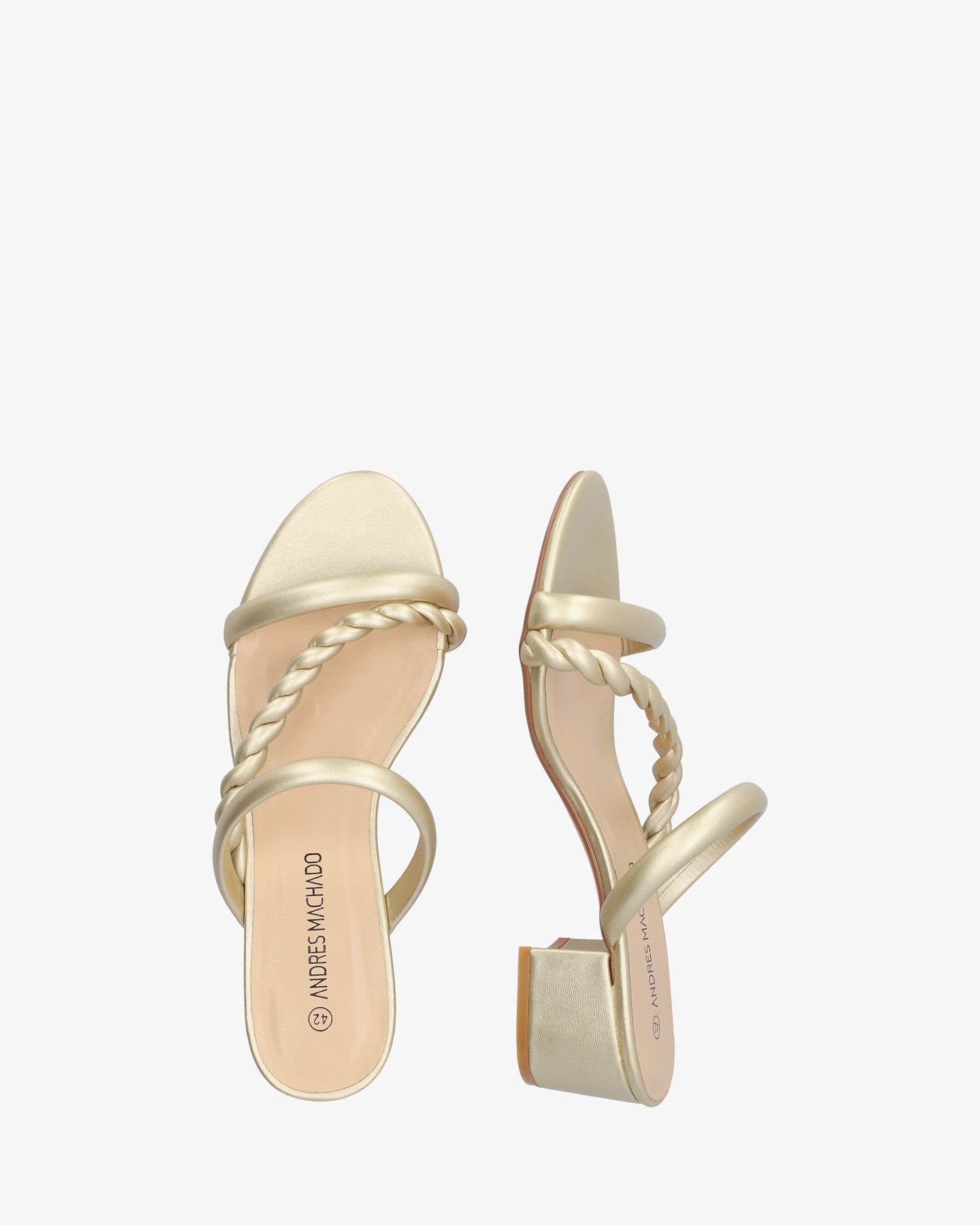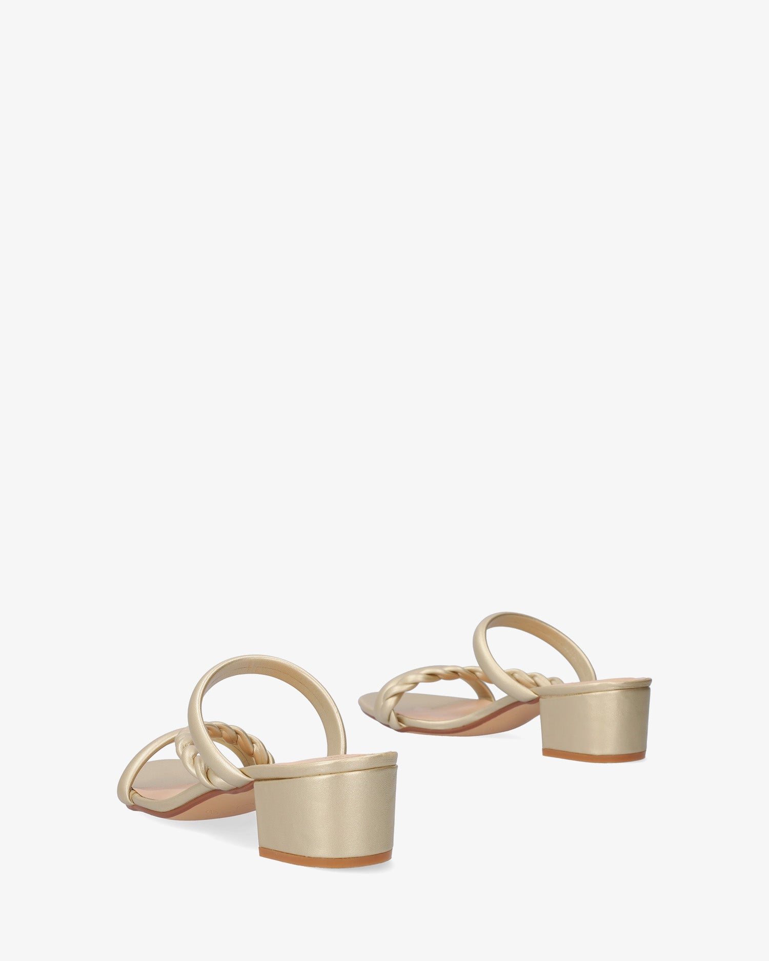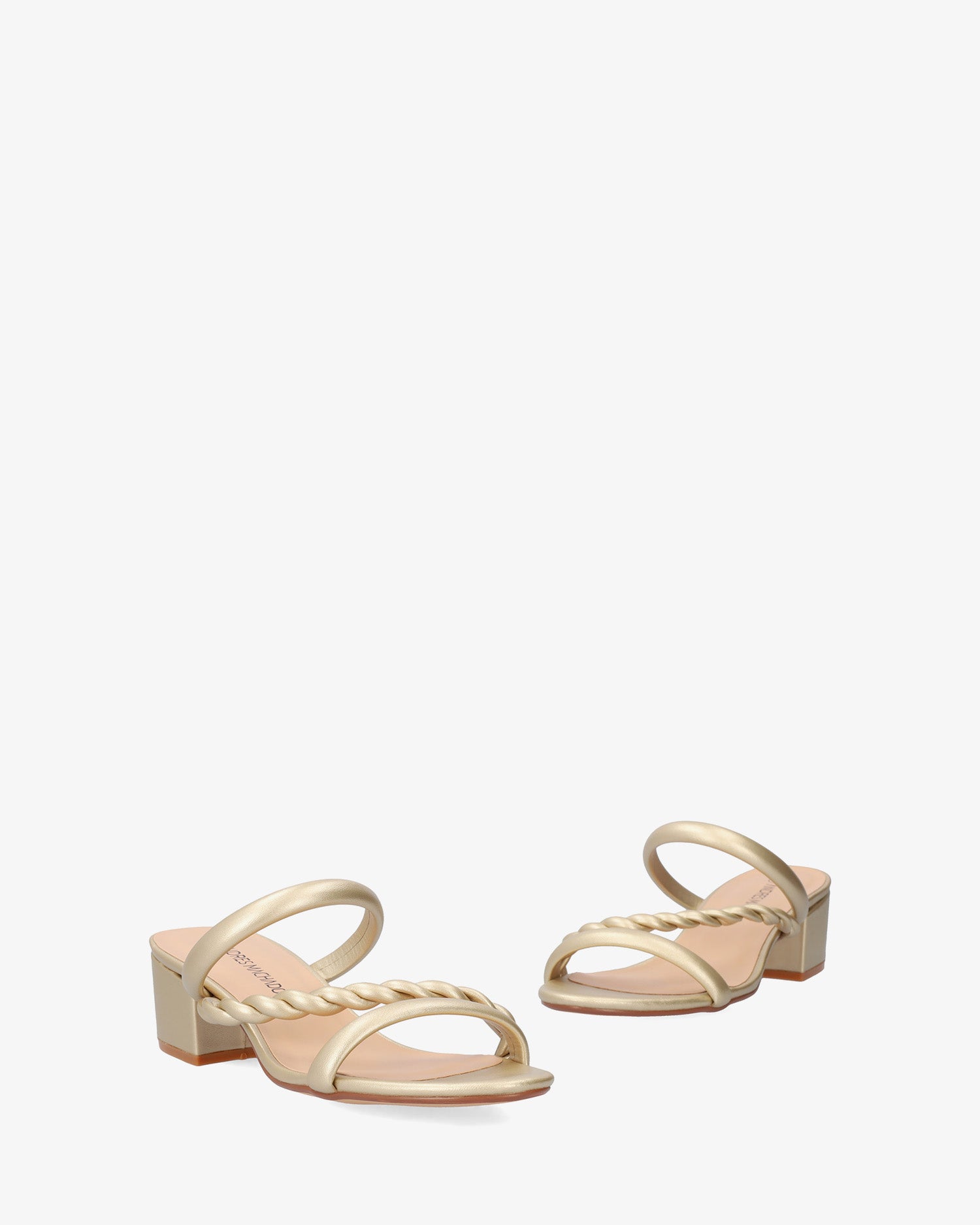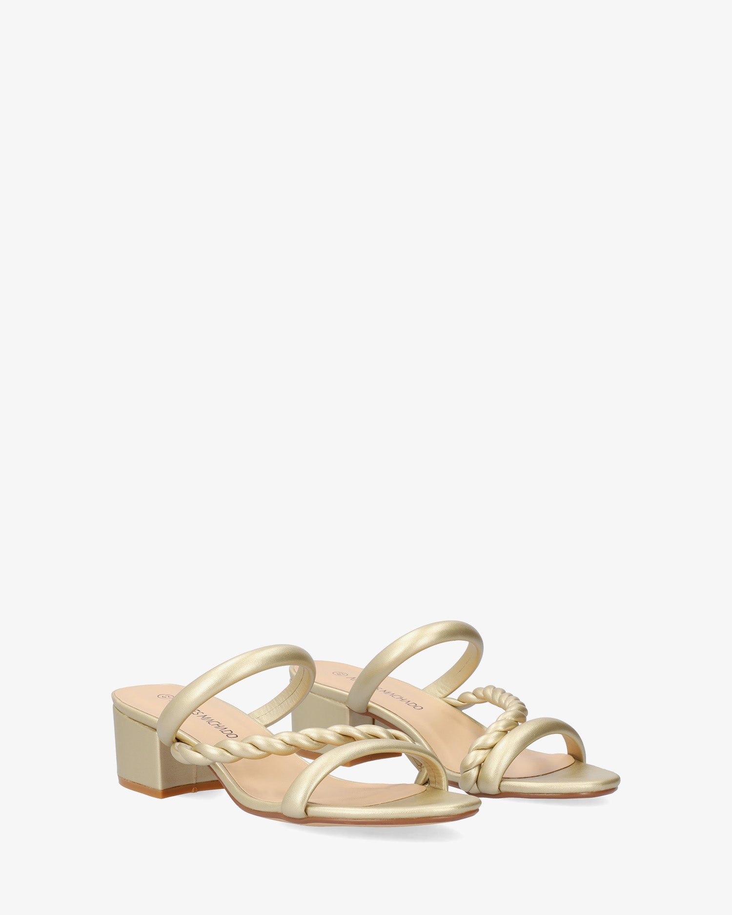 Squared heel mule in golden soft material. The silgback design features three thick straps, one of them crossing over the instep with an open squared toe. The heel height for small sizes from 32 to 35 is 1,95" and for large sizes from 42 to 45 is 2,14" .