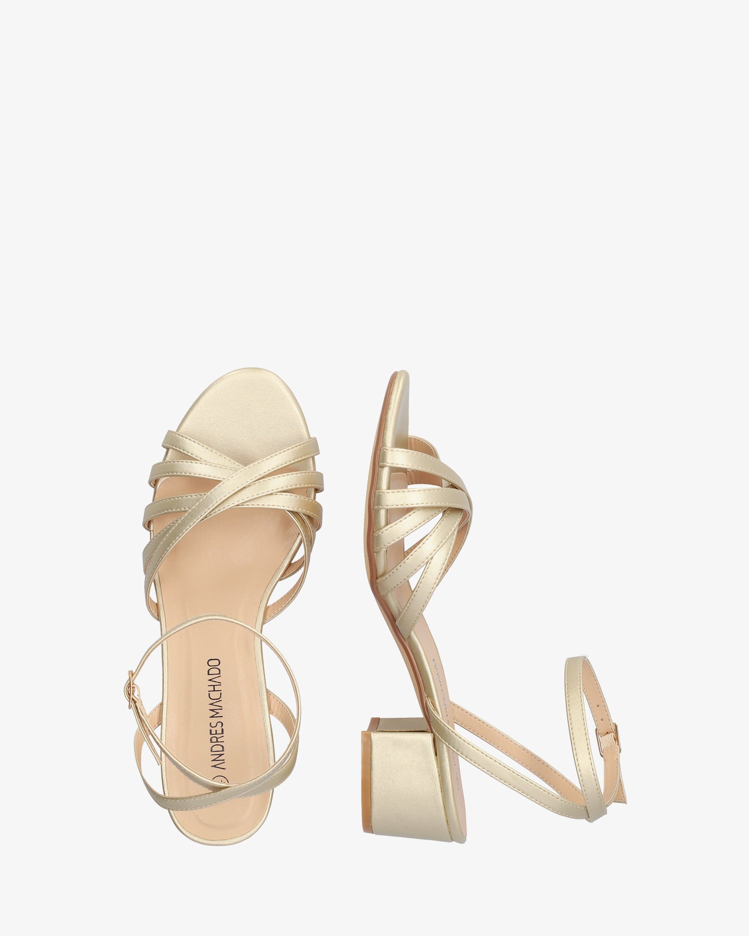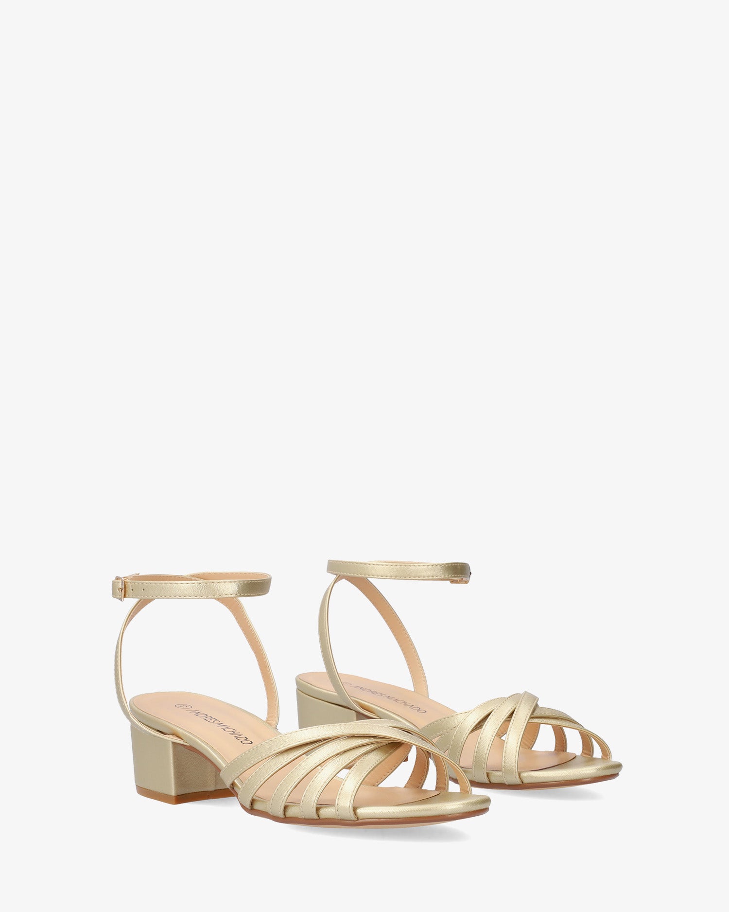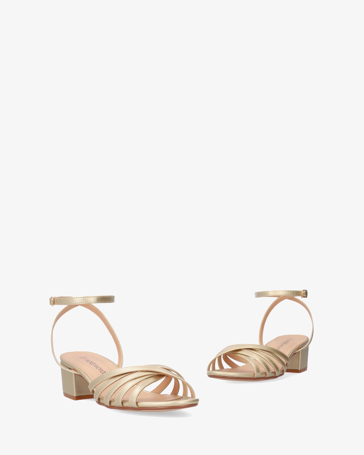 Squared heel sandal in gold soft material. Slingback design featuring multiple matching, crossed straps over the vamp and instep. Matching buckled strap around the ankle. Round and open toe box. The matching heel is 1,95" for small sizes from 32 to 35 EU and 2,14" for large sizes from 42 to 45 EU. This model fits small, we recommend taking one size larger than usual.