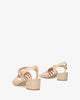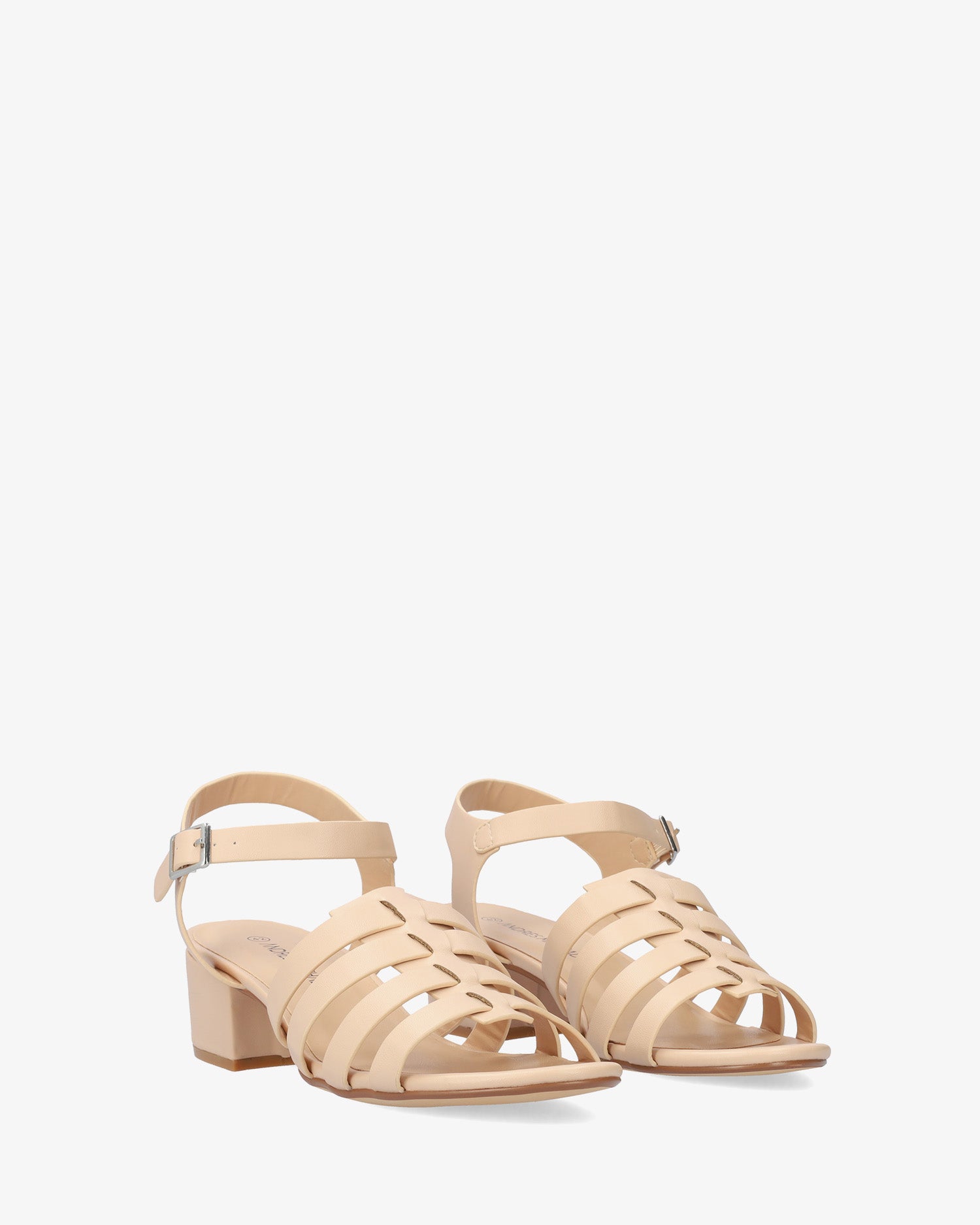 Squared heel sandal in nude soft material. With an open rounded toe, this sandal features fine pararell straps linked with a central strap, finishes with a buckled ankle closing. The heel height for small sizes from 32 to 35 is 1,95" and for large sizes from 42 to 45 is 2,14" .