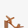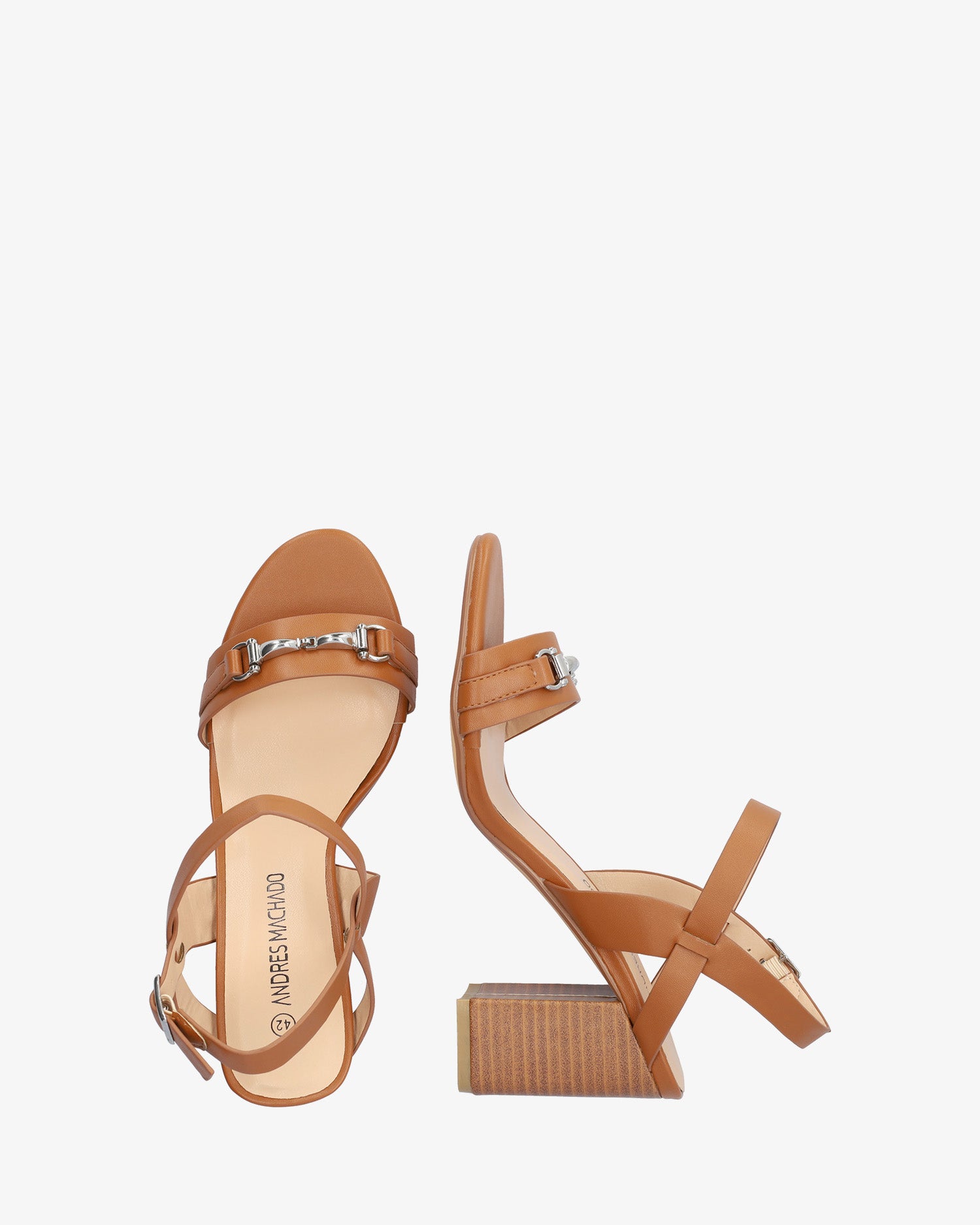 Black soft material sandals with a squared heel. The open rounded toe features a thick strapp with a metallic applique and a slingback finishing with a buckled closing. The heel height is 3,31" for small sizes from 32 to 35 and 3,70" for large sizes from 42 to 45.