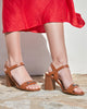 White soft material sandals with a squared heel. The open rounded toe features a thick strapp with a metallic applique and a slingback finishing with a buckled closing. The heel height is 3,31" for small sizes from 32 to 35 and 3,70" for large sizes from 42 to 45.
