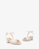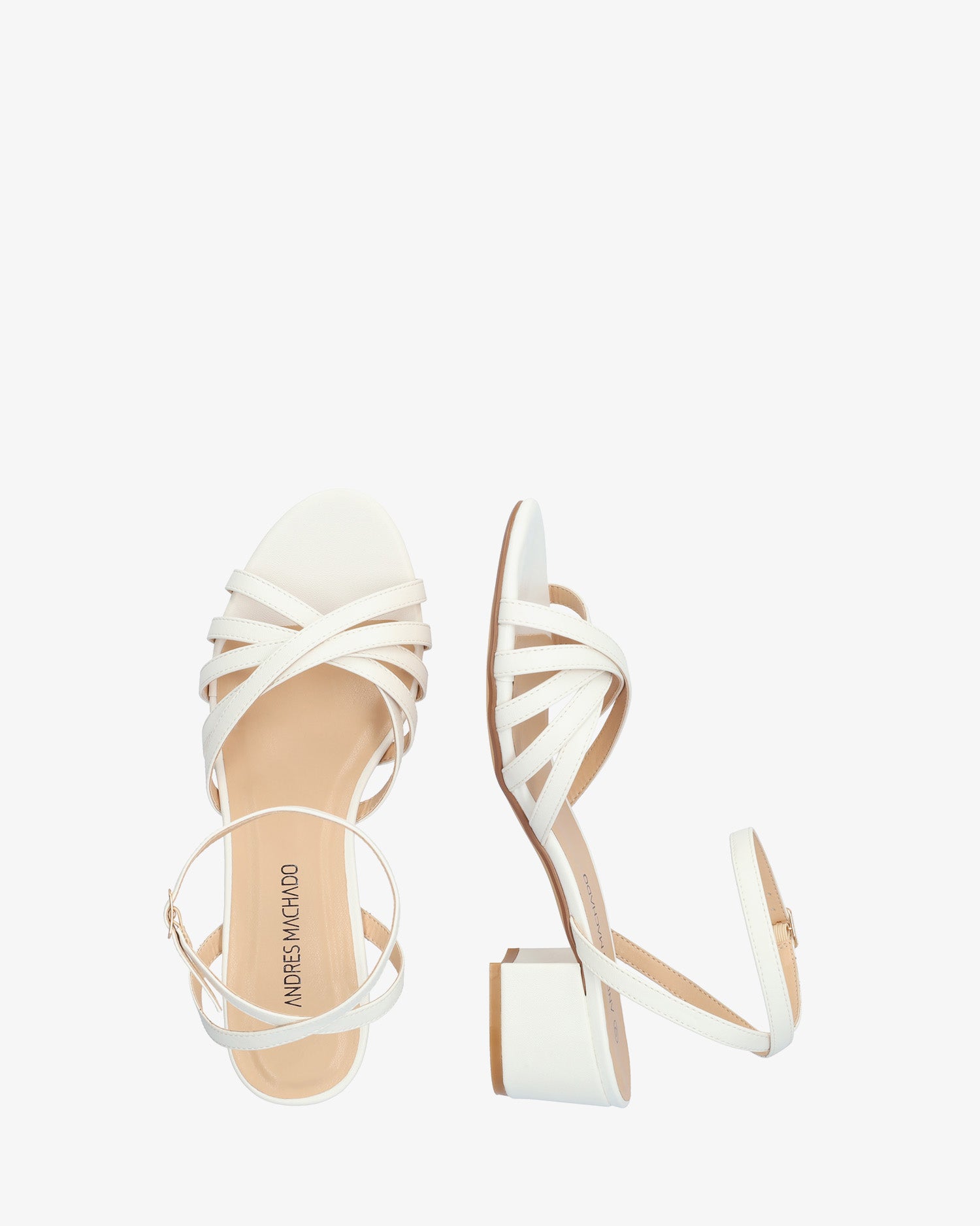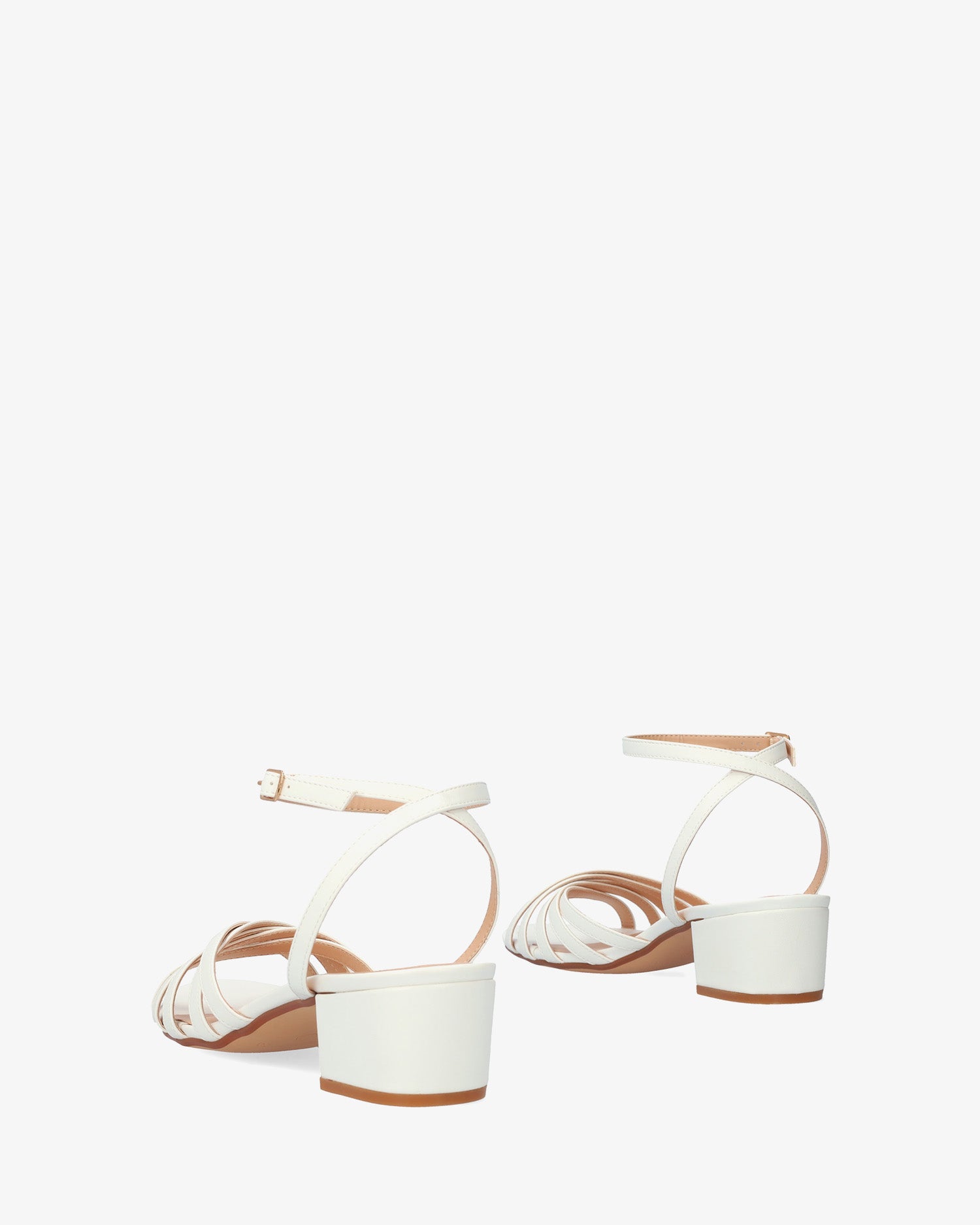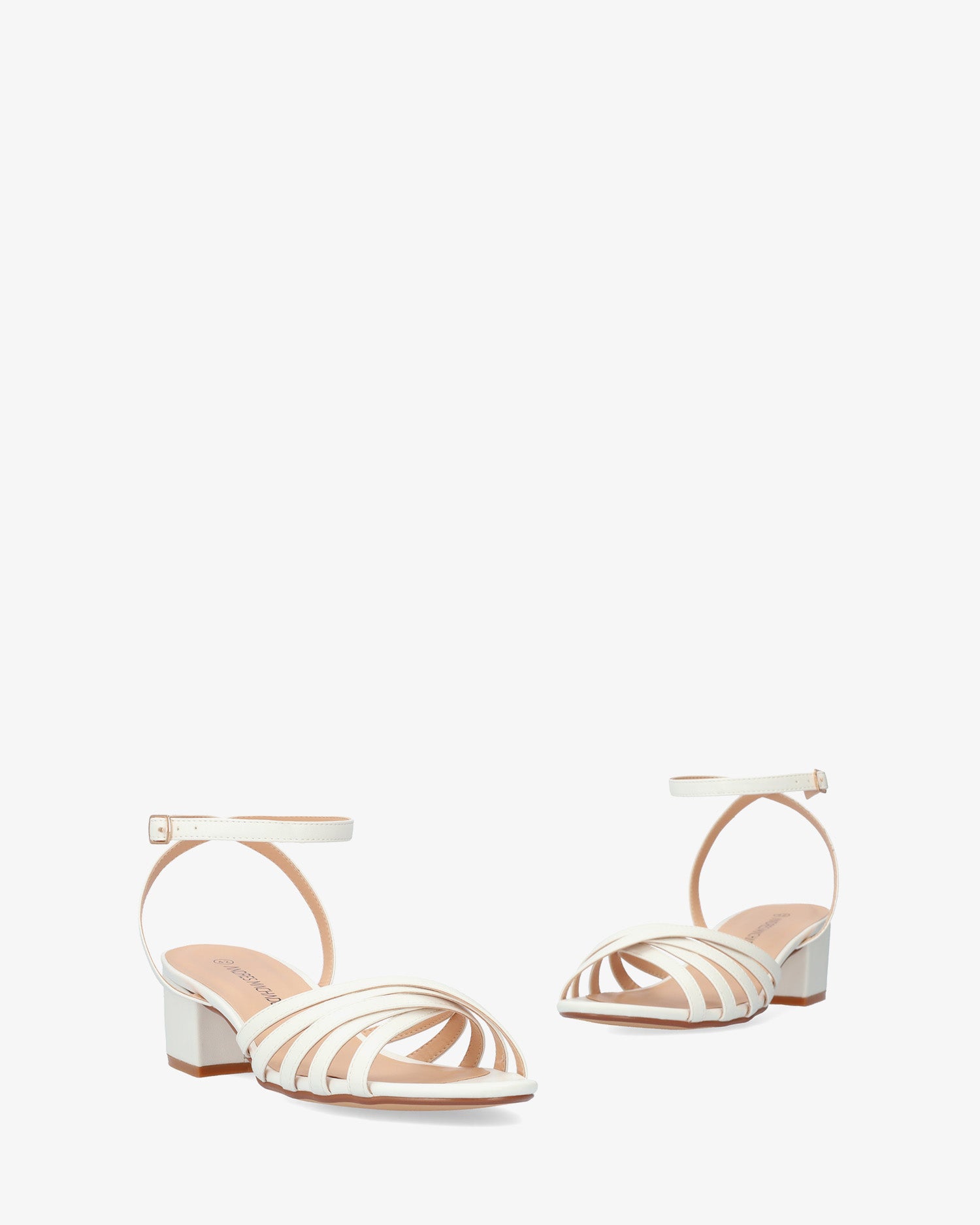 Squared heel sandal in white soft material. Slingback design featuring multiple matching, crossed straps over the vamp and instep. Matching buckled strap around the ankle. Round and open toe box. The matching heel is 1,95" for small sizes from 32 to 35 EU and 2,14" for large sizes from 42 to 45 EU. This model fits small, we recommend taking one size larger than usual.