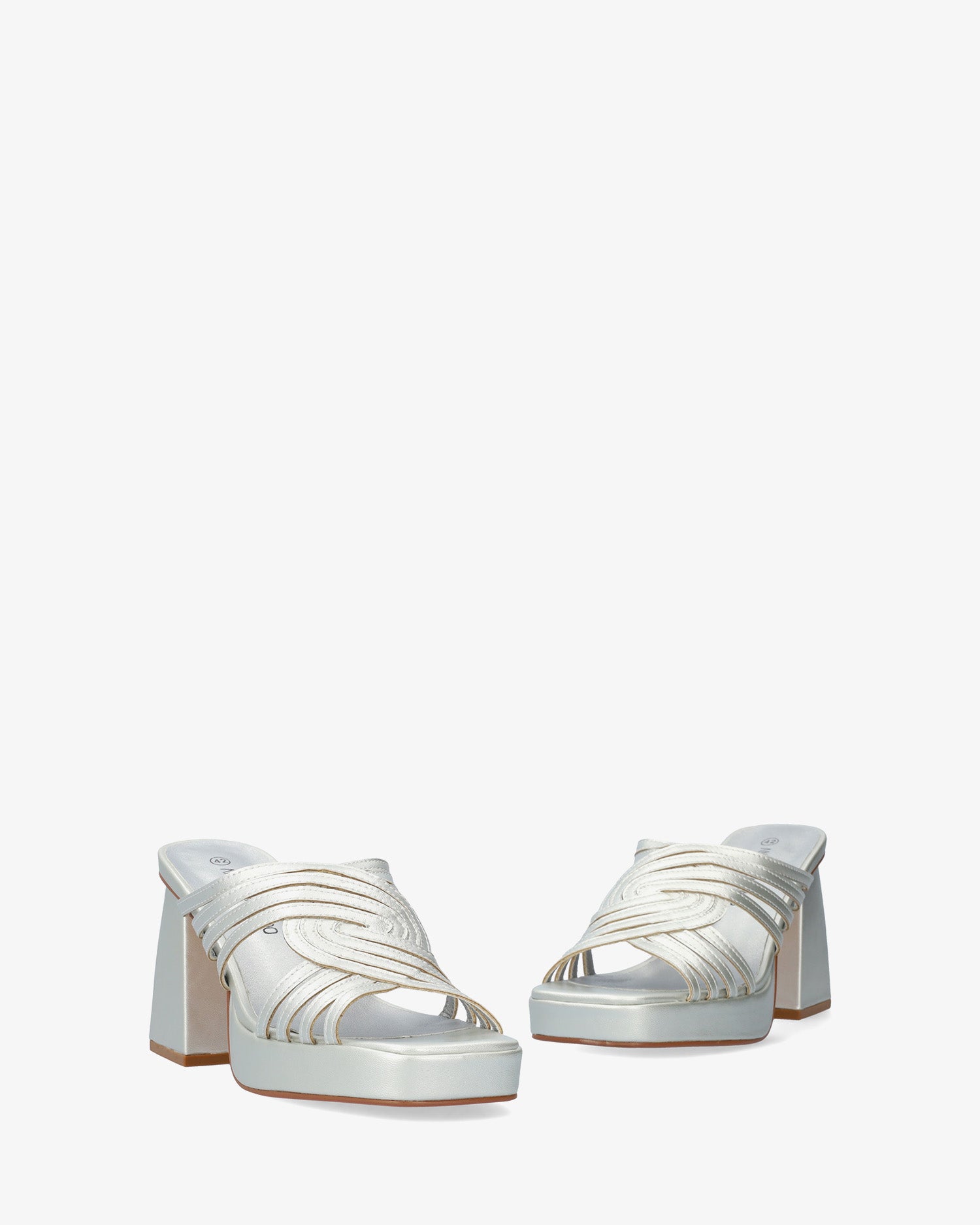 Mule in silver suede-like material with a wide square heel and platform. Open-back design with multiple thin intertwined straps on the instep. Square and open toe. Heel height of 4,13" and platform height of 0,98" for small sizes from 32 to 35. Heel height of 4,33" and platform height of 0,98" for large sizes from 42 to 45.