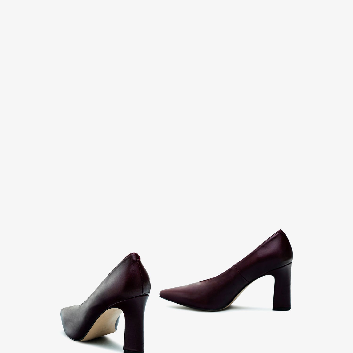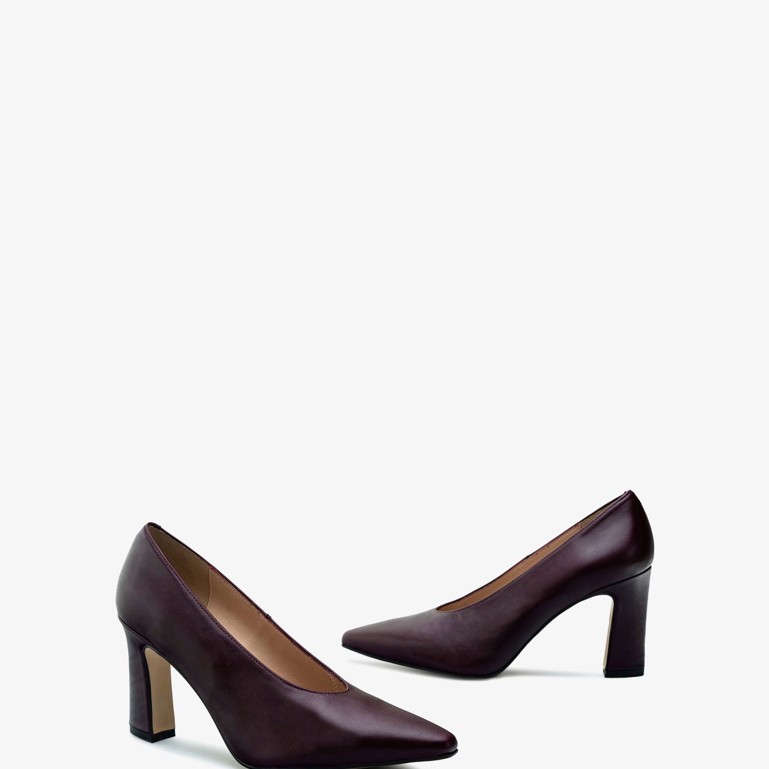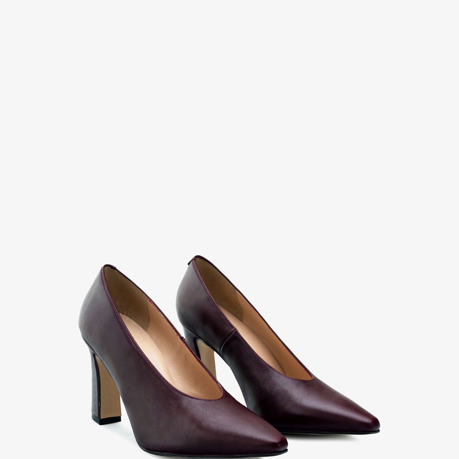Burgundy coloured leather stilettos. Pointed toe. Inner lining in camel-colored leather. Wide matching 8,5cm/ 3.34in heel for small sizes from 32 to 35. 9,5cm/ 3.74in heel for large sizes from 42 to 45. Made in Spain.