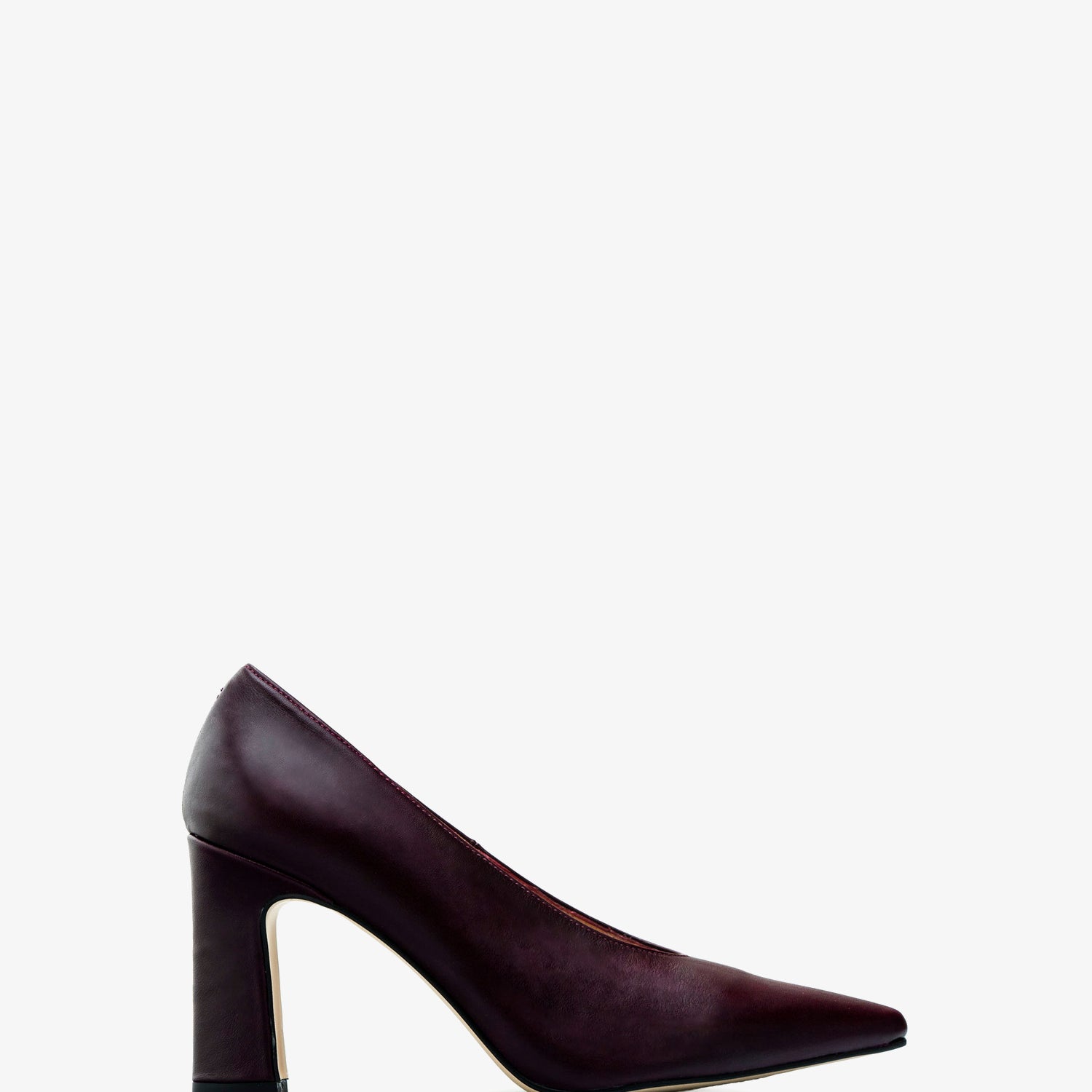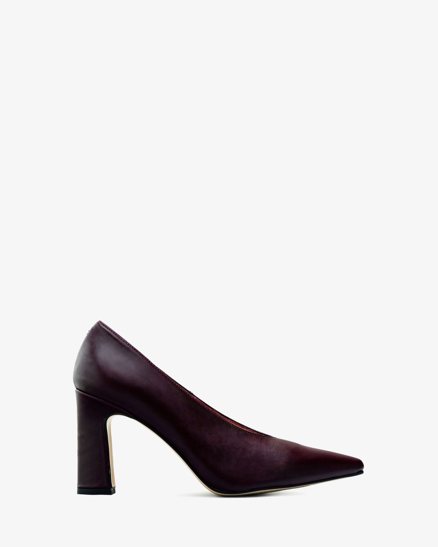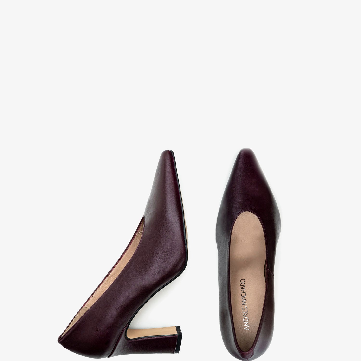 Burgundy coloured leather stilettos. Pointed toe. Inner lining in camel-colored leather. Wide matching 8,5cm/ 3.34in heel for small sizes from 32 to 35. 9,5cm/ 3.74in heel for large sizes from 42 to 45. Made in Spain.