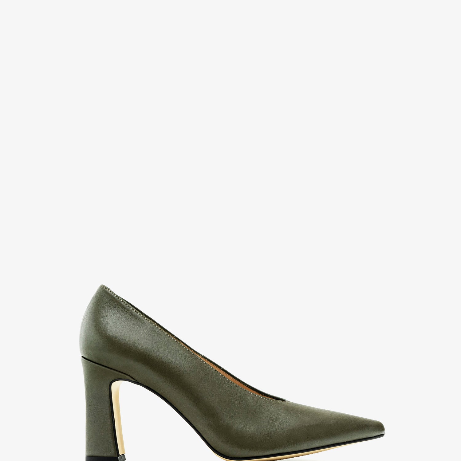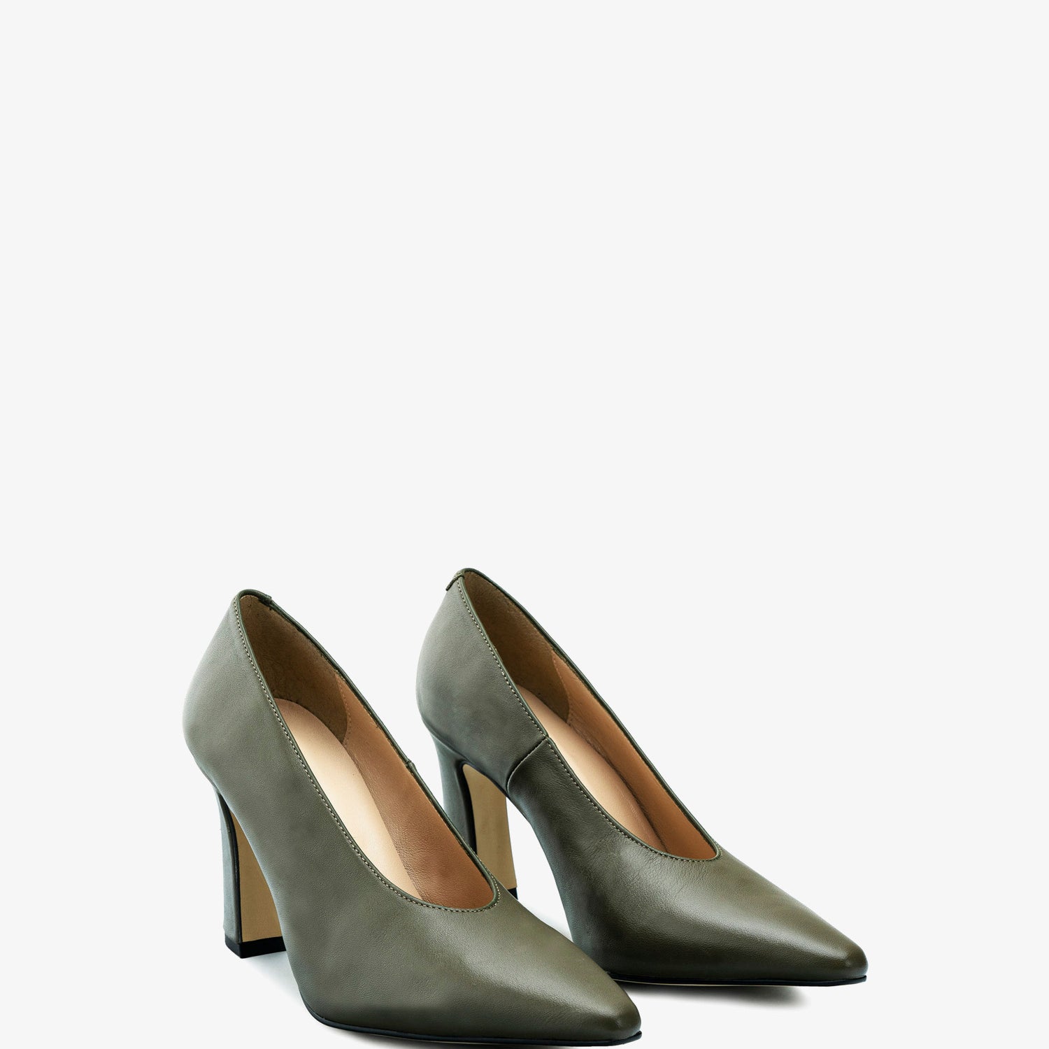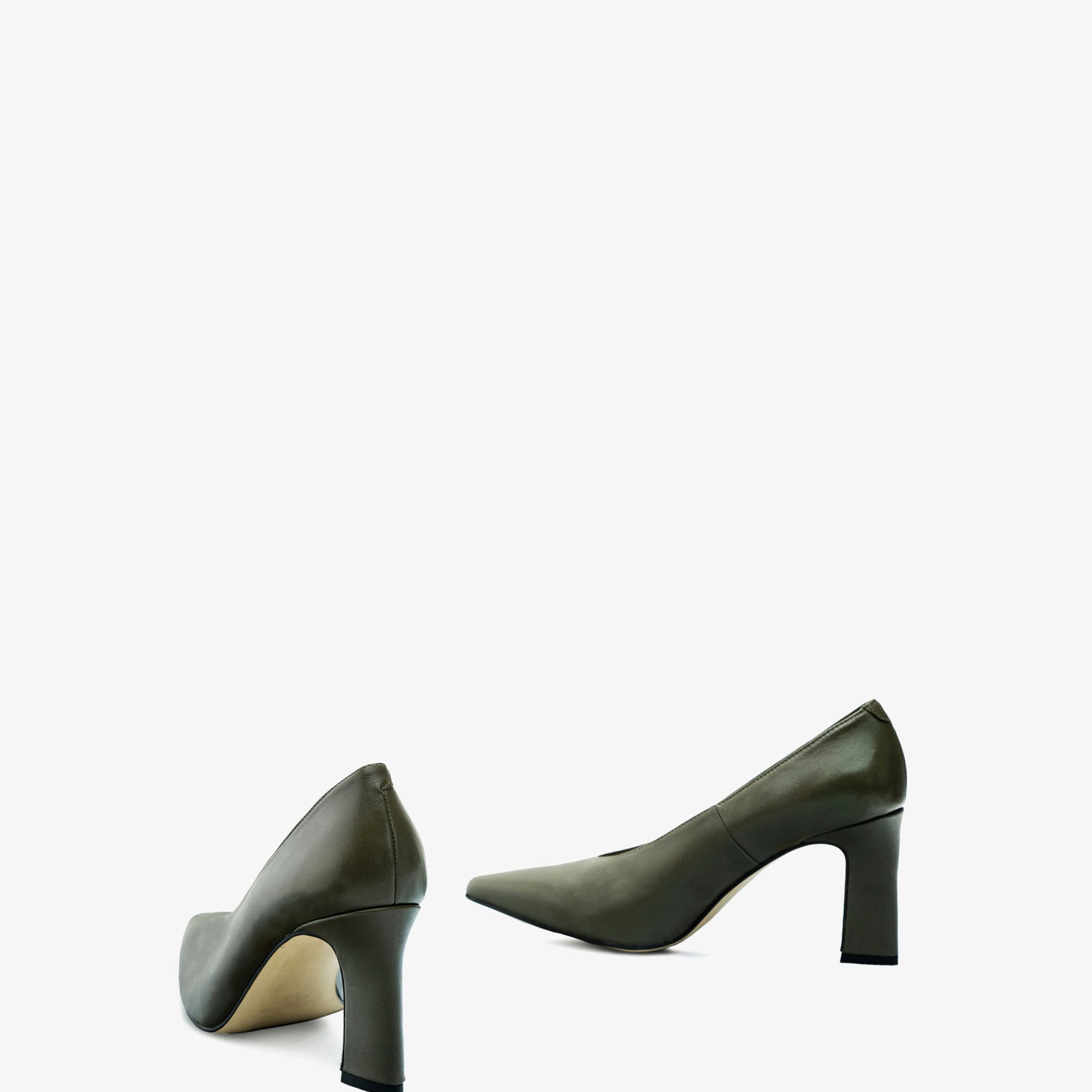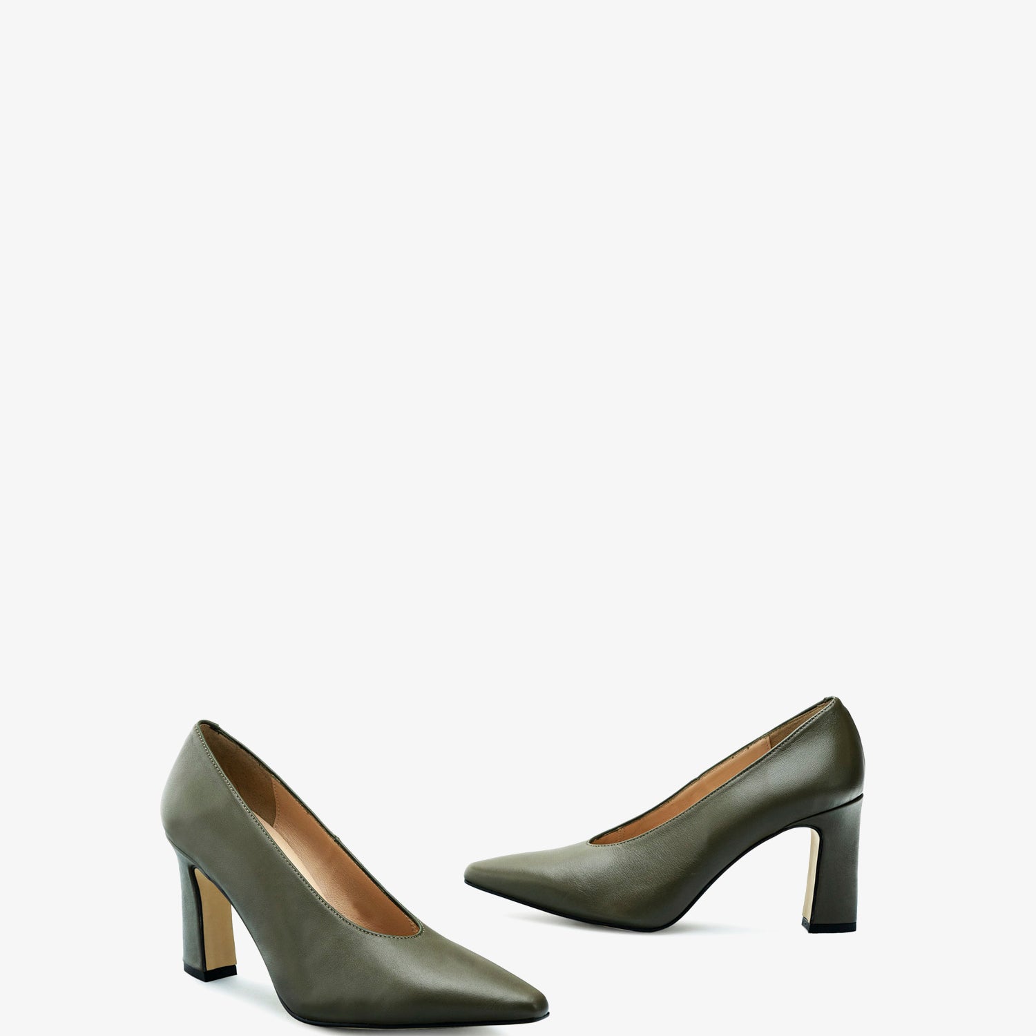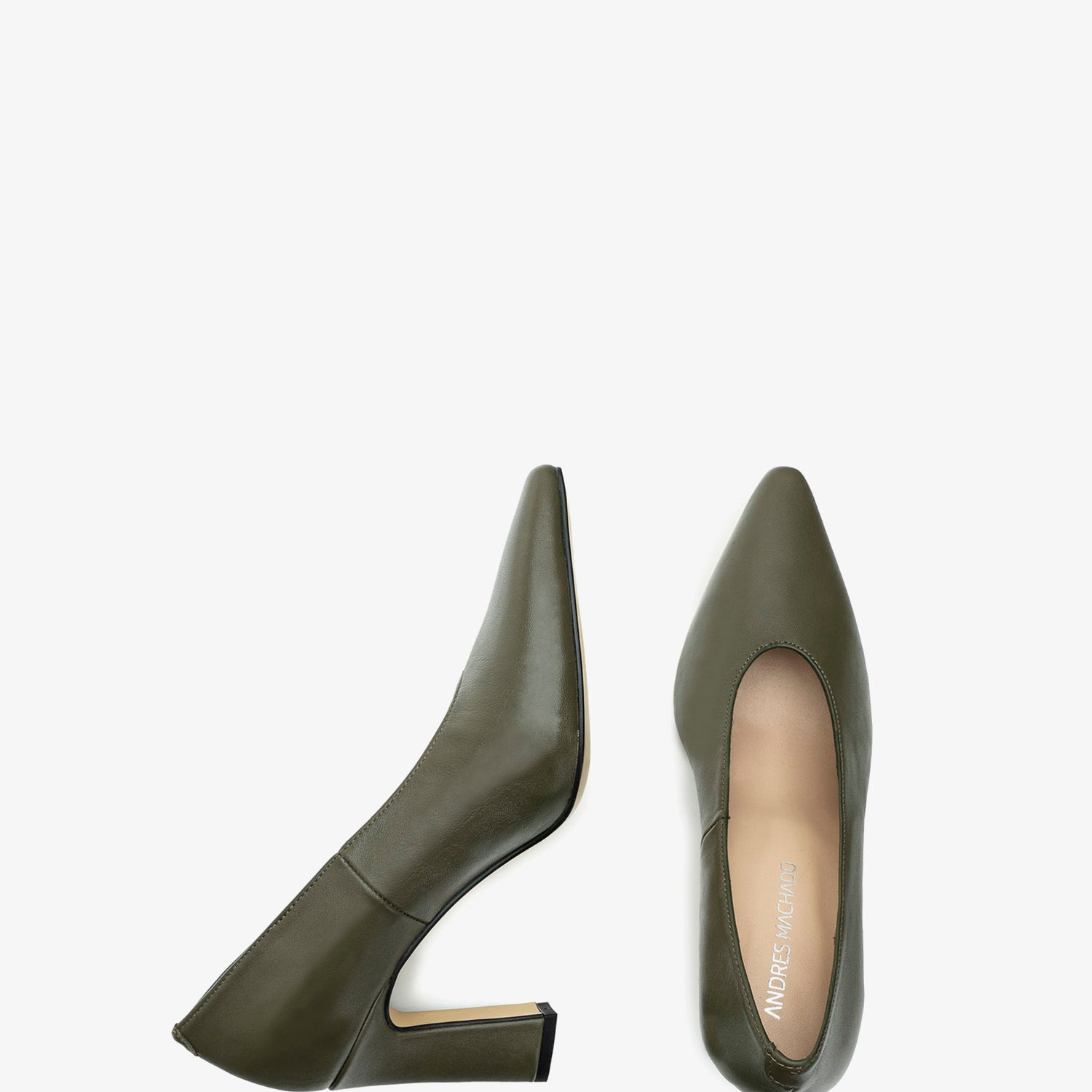Kaki coloured leather stilettos. Pointed toe. Inner lining in camel-colored leather. Wide matching 8,5cm/ 3.34in heel for small sizes from 32 to 35. 9,5cm/ 3.74in heel for large sizes from 42 to 45. Made in Spain.